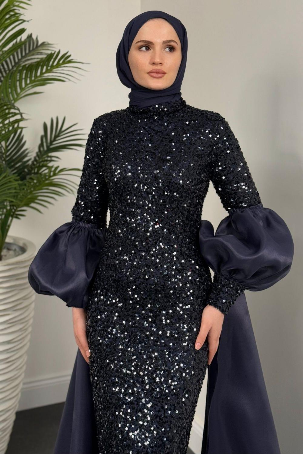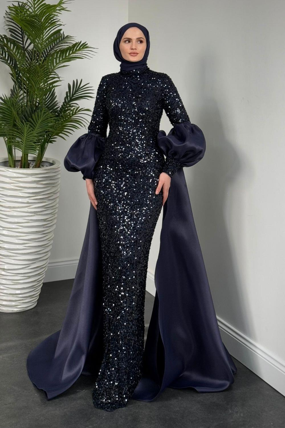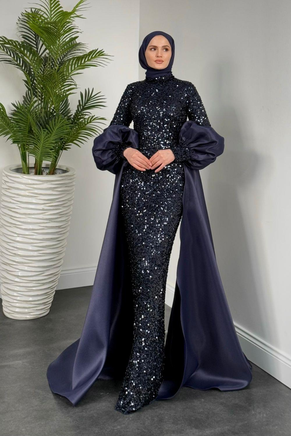 Jamie Kolları Seyyar Pelerinli Balon Kol Abiye Lacivert
