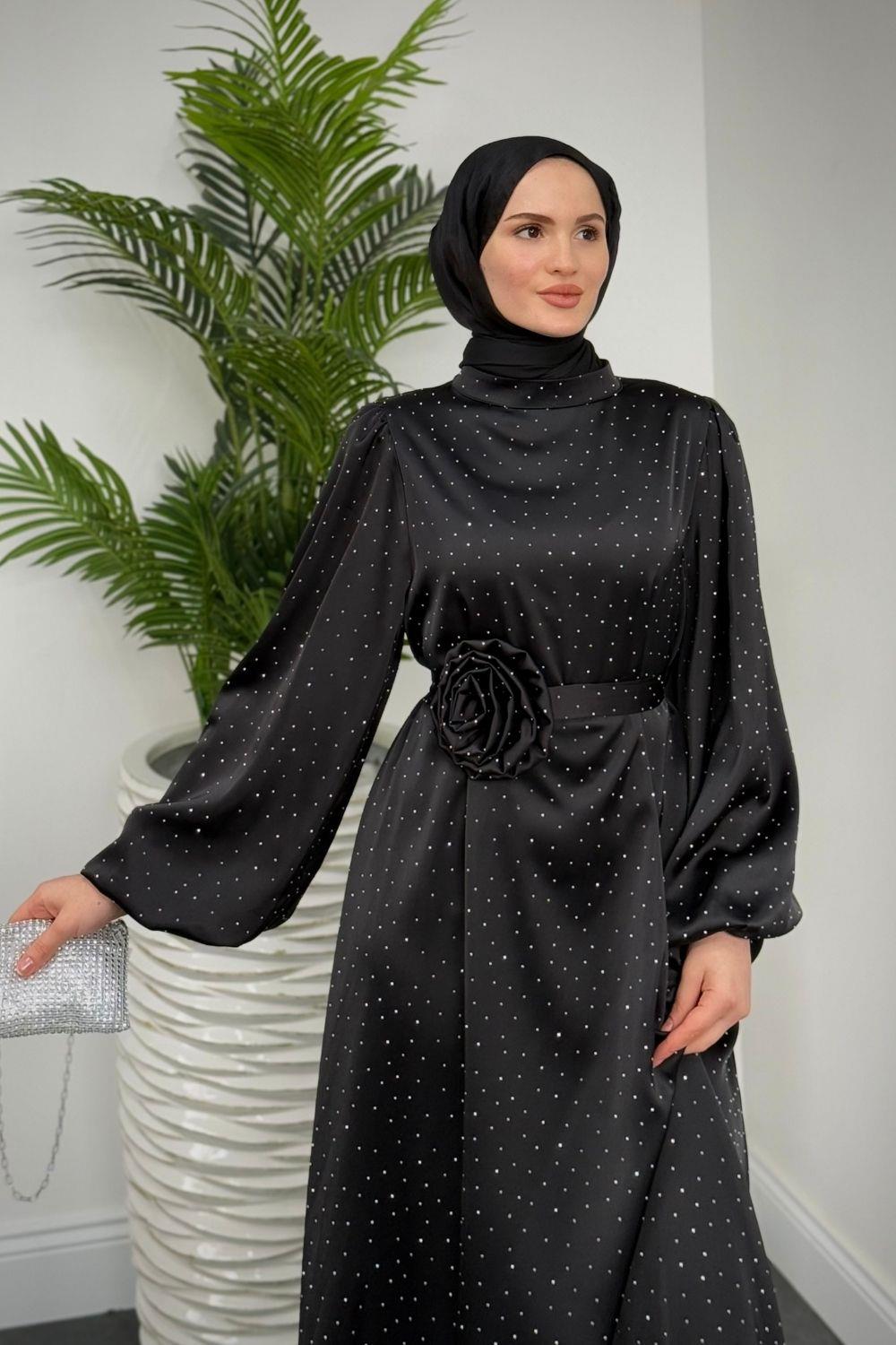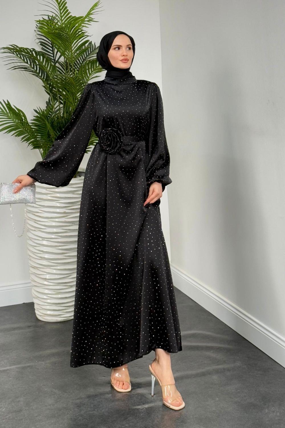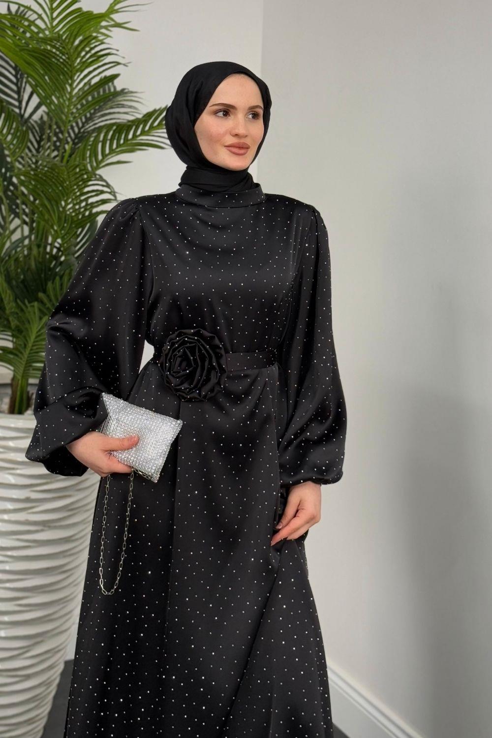 Margherita Taşlı Balon Kol Abiye Siyah