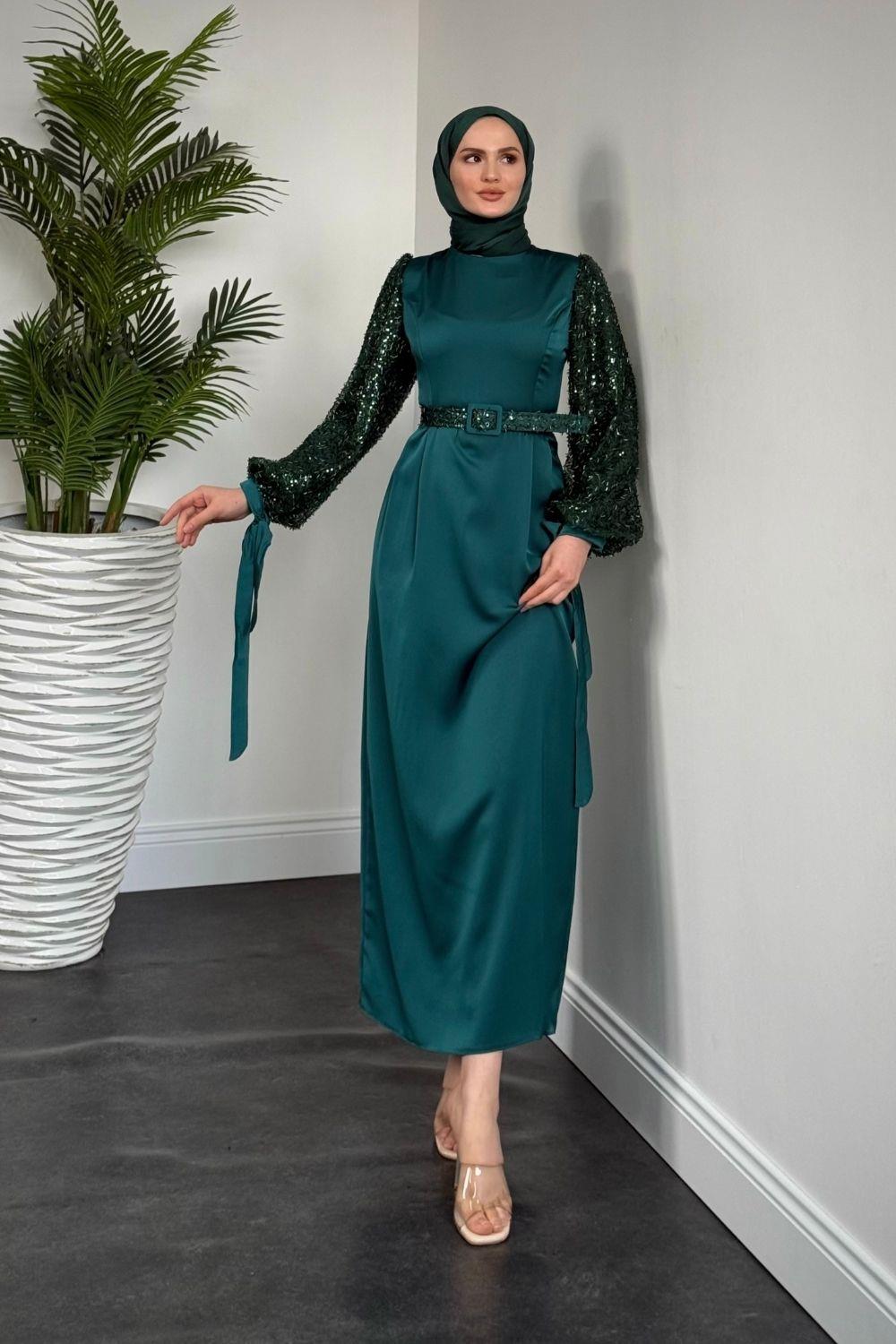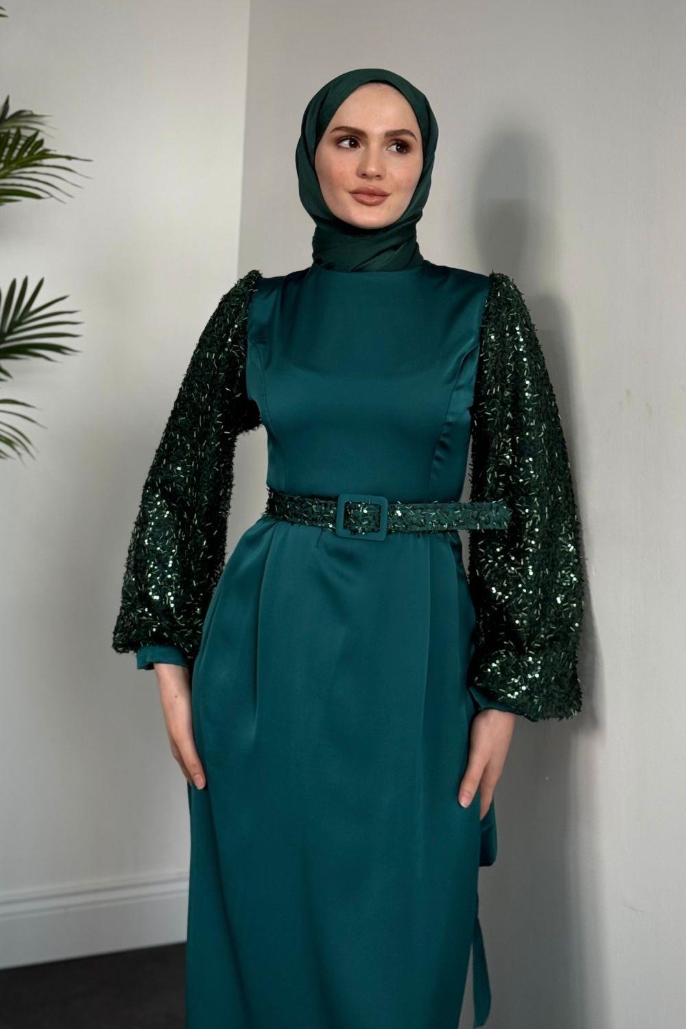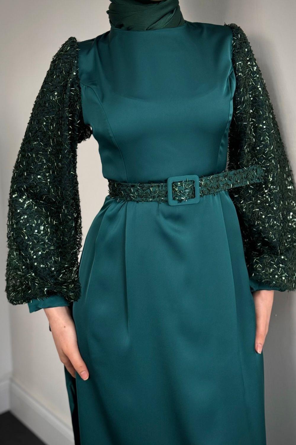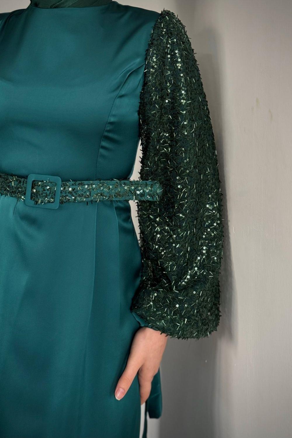 Şehla Kolları Boncuk İşleme Kemerli Abiye Zümrüt