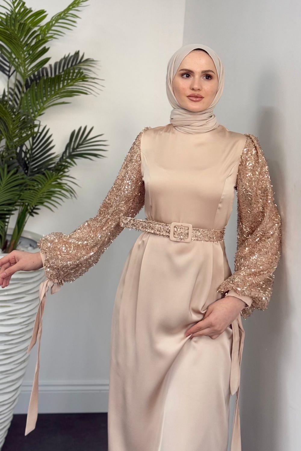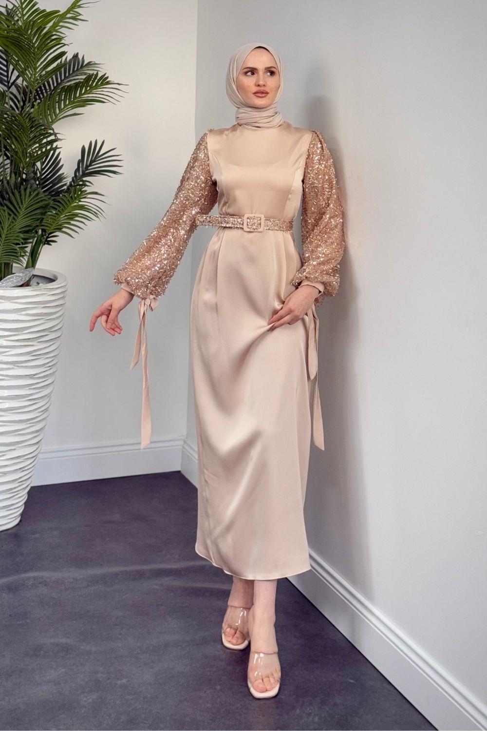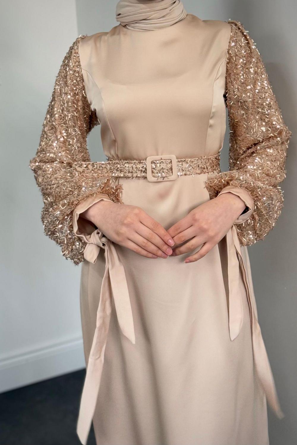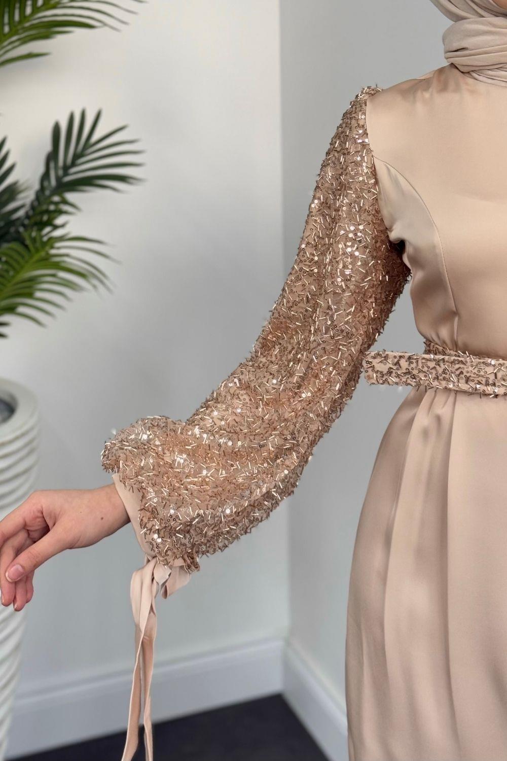 Şehla Kolları Boncuk İşleme Kemerli Abiye Krem