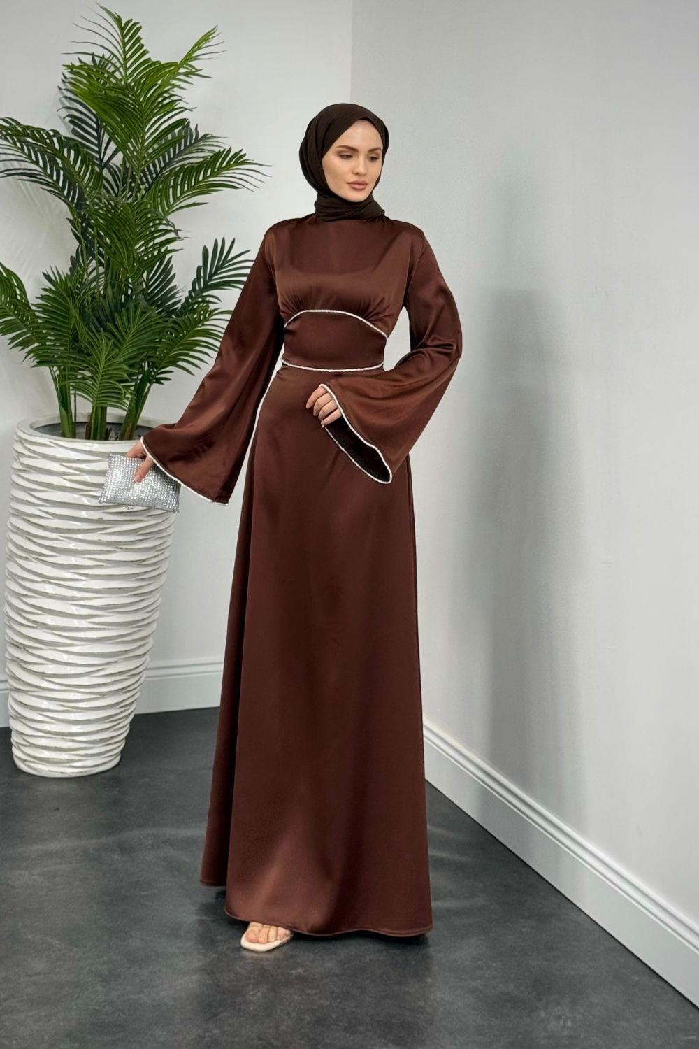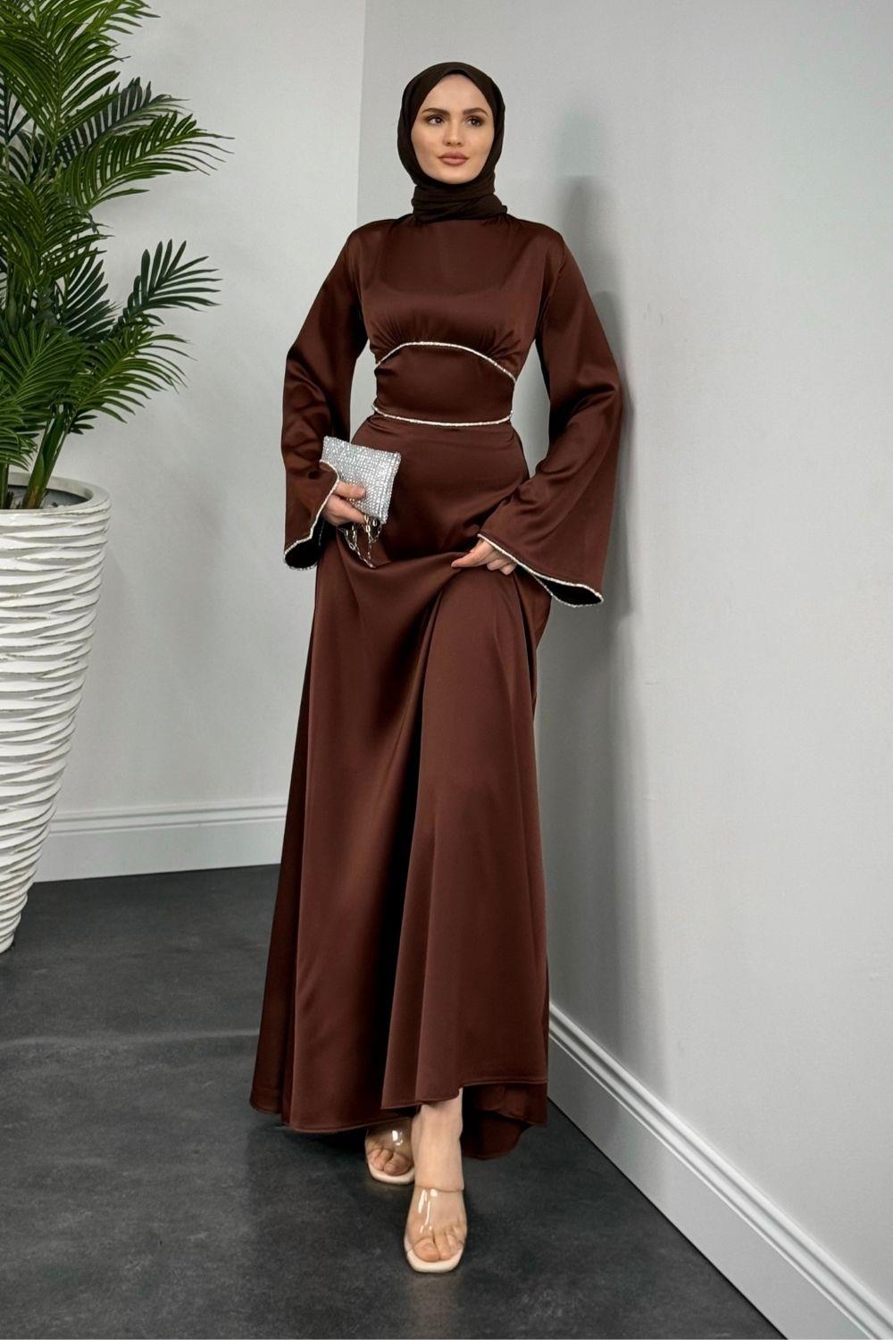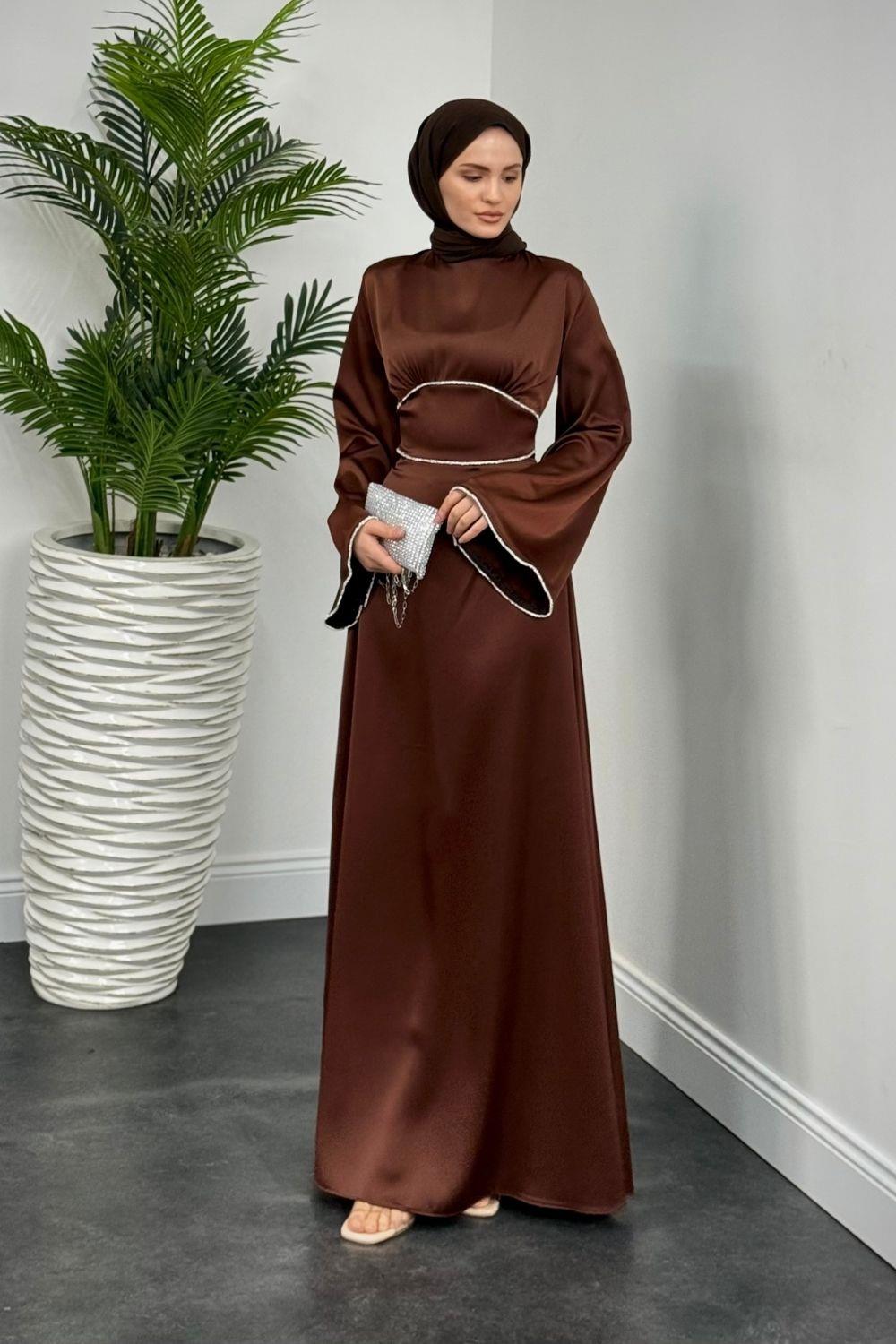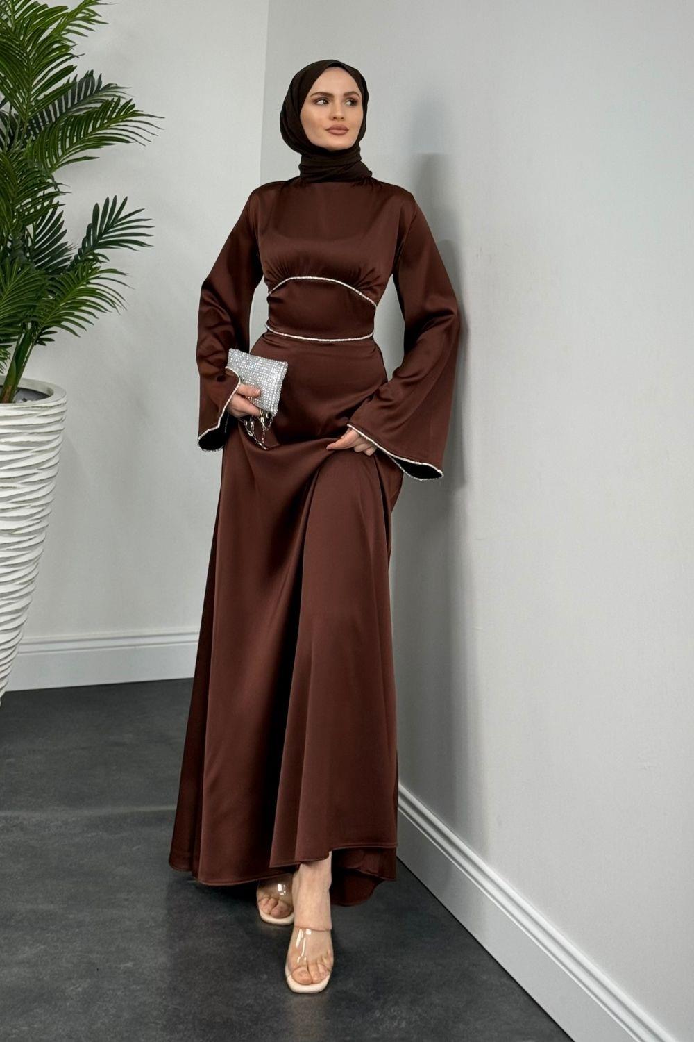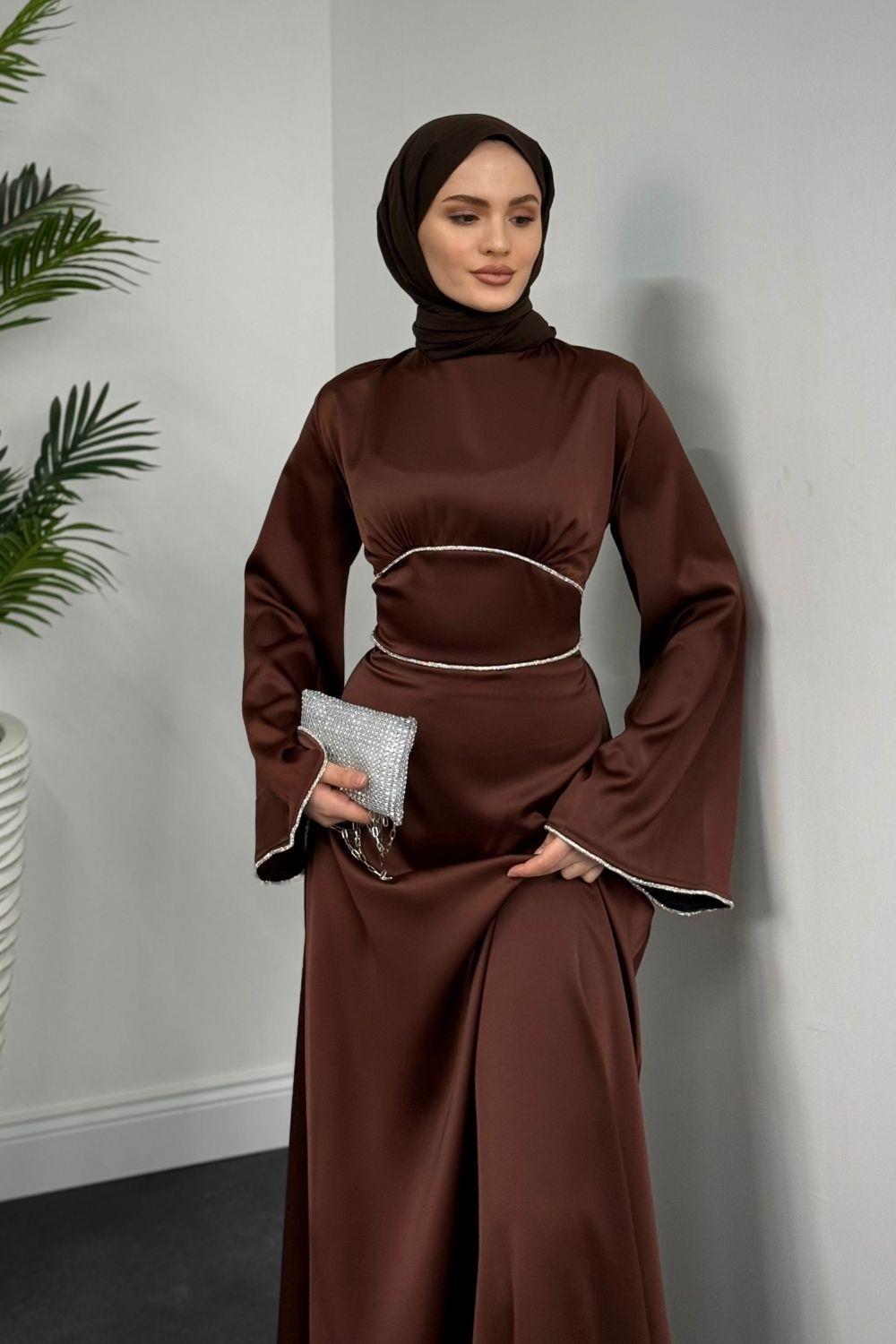 Vlasi Kolu Ve Beli Baget Taşlı Saten Abiye Kahverengi