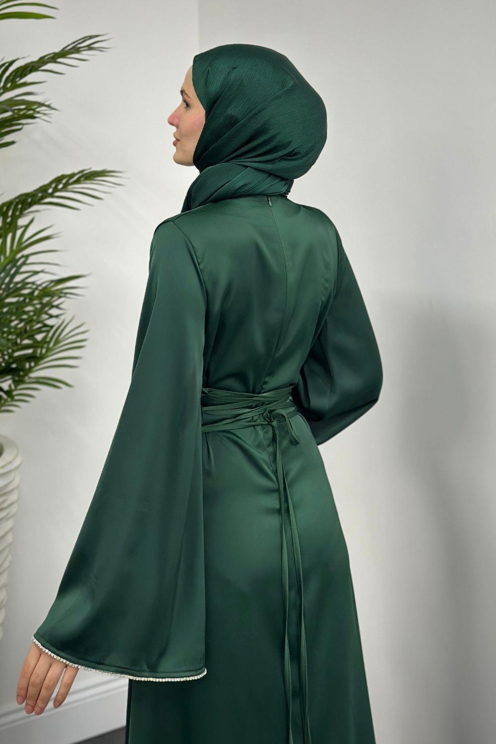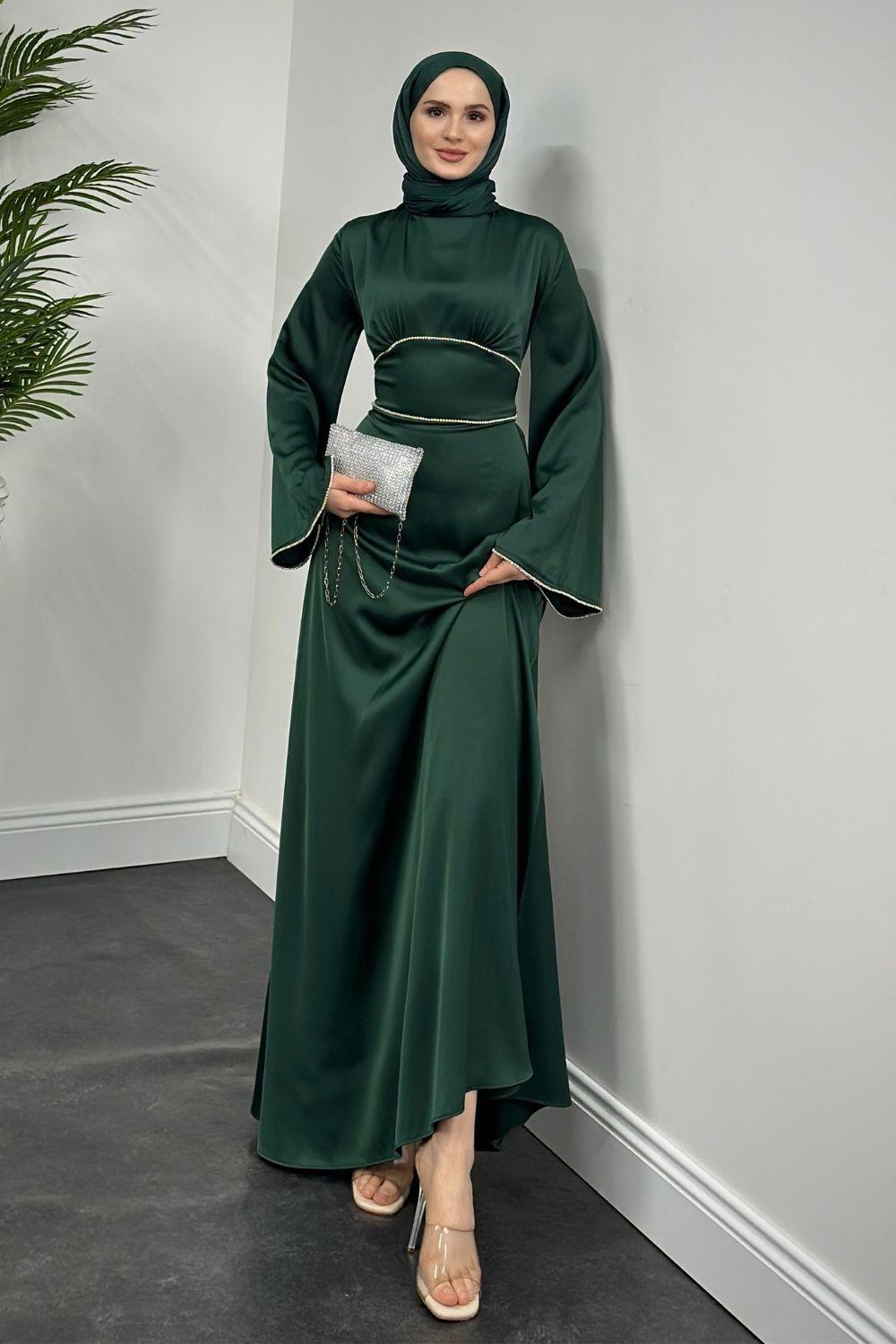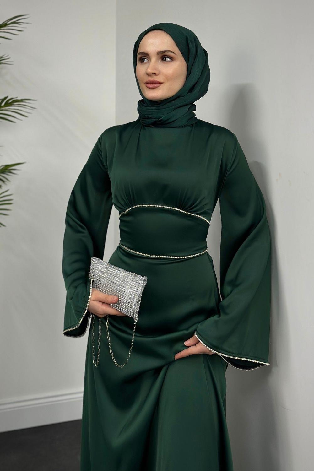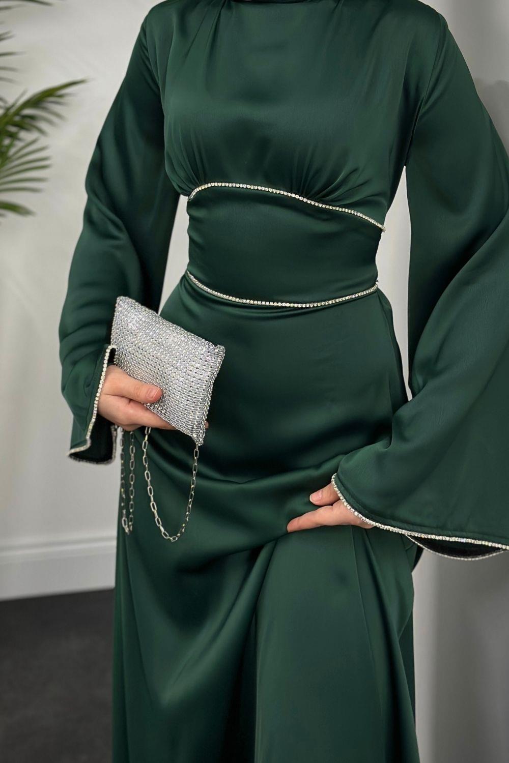 Vlasi Kolu Ve Beli Baget Taşlı Saten Abiye Zümrüt