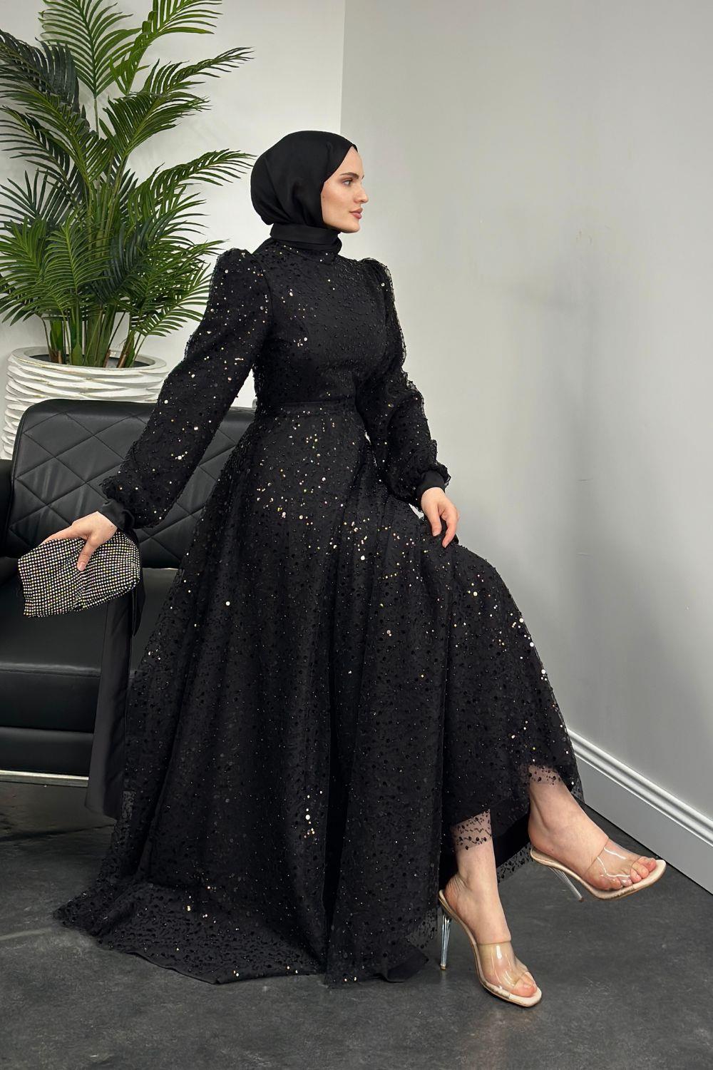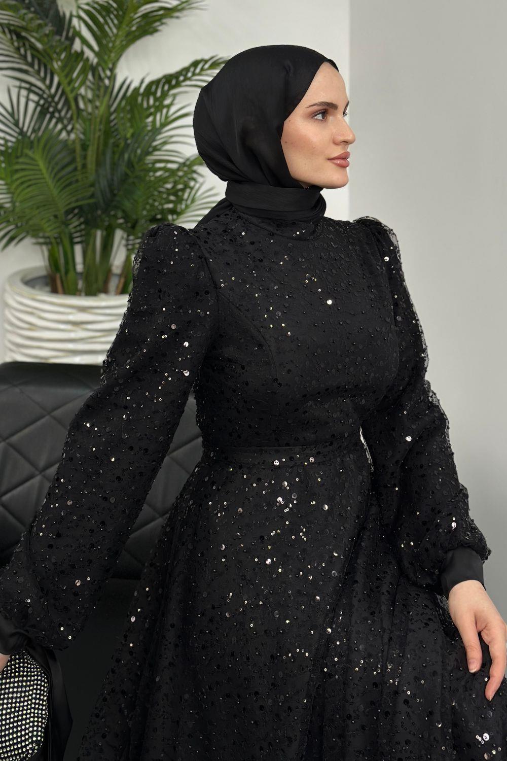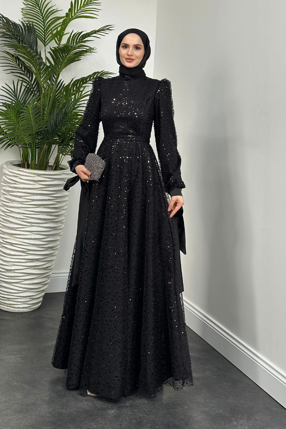 Hilly Kolları Fiyonk Saten Abiye Siyah