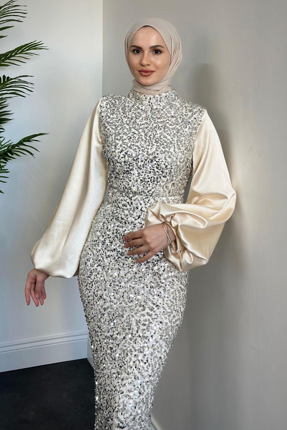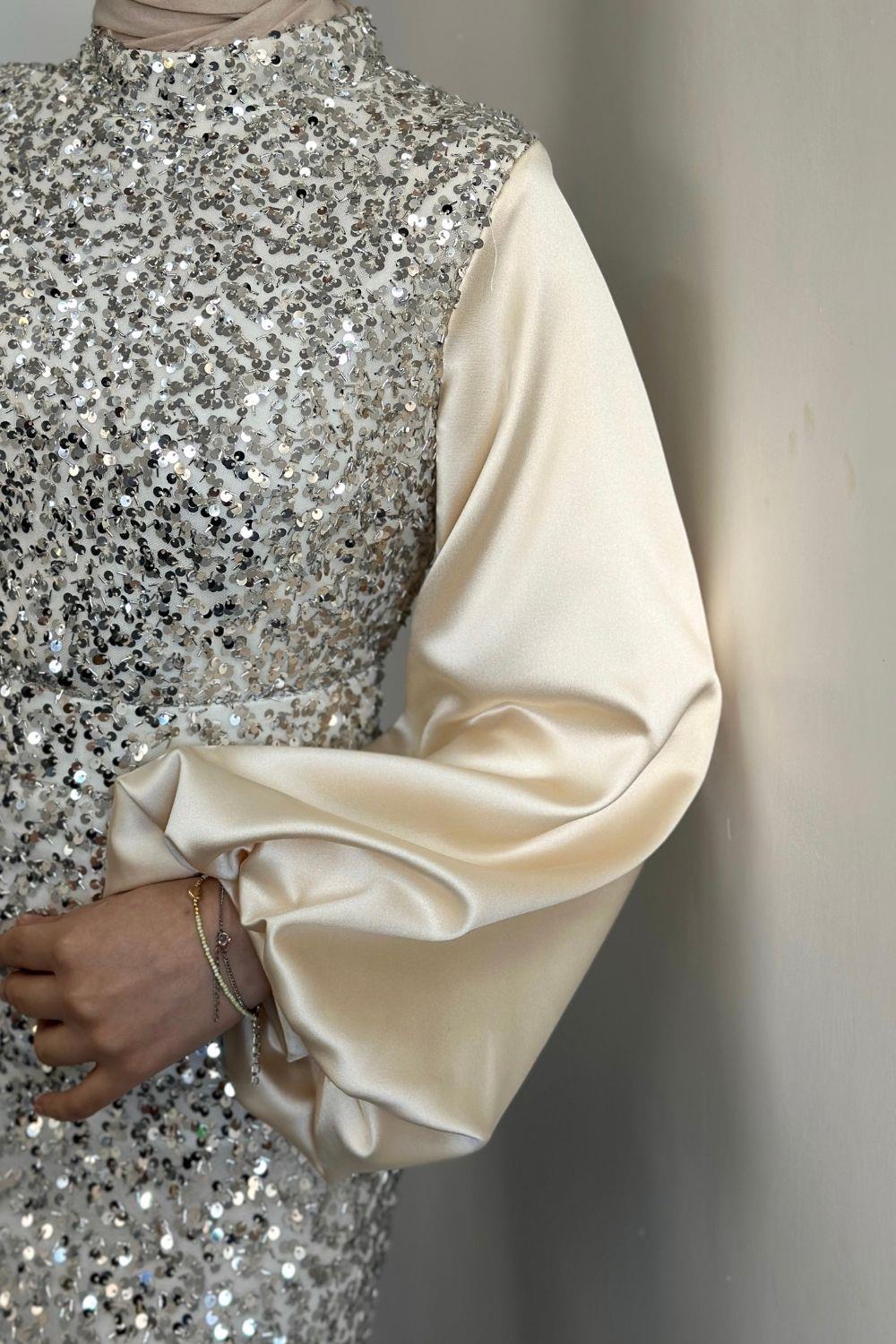 Venesa Kolları Saten Balık Abiye Krem