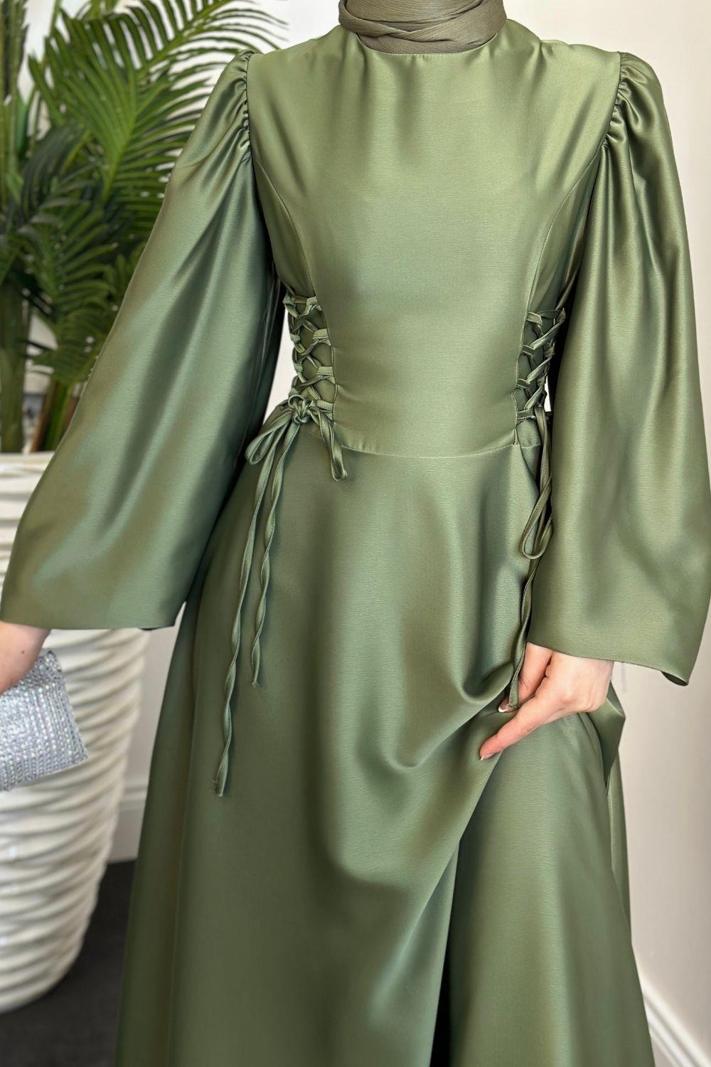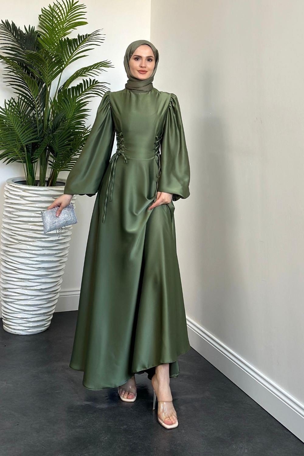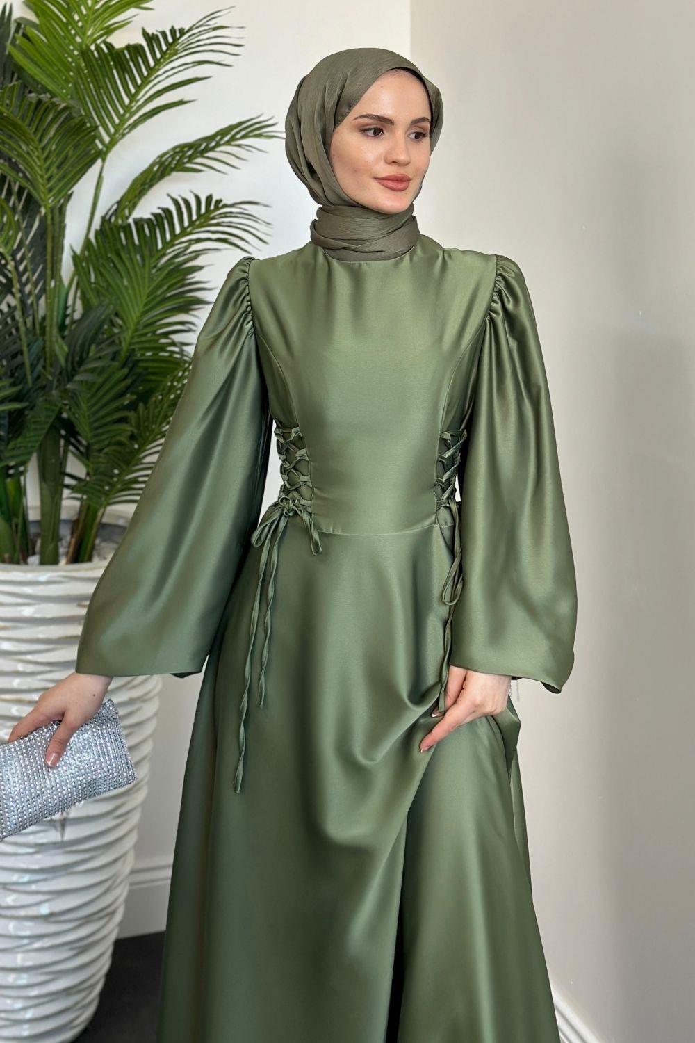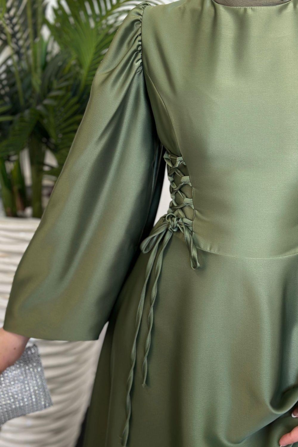 Orya Yanları Sıkmalı Saten Abiye Haki