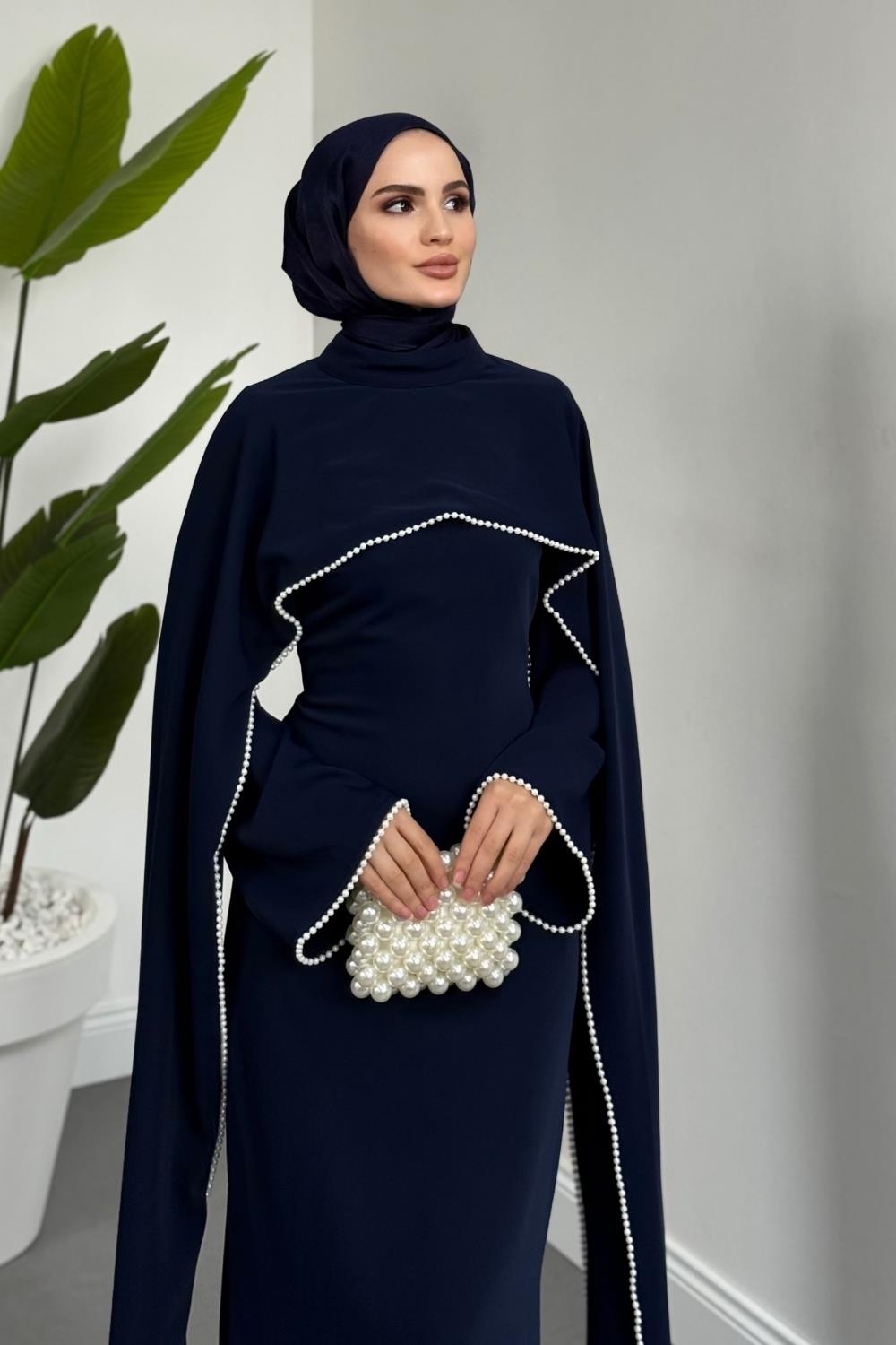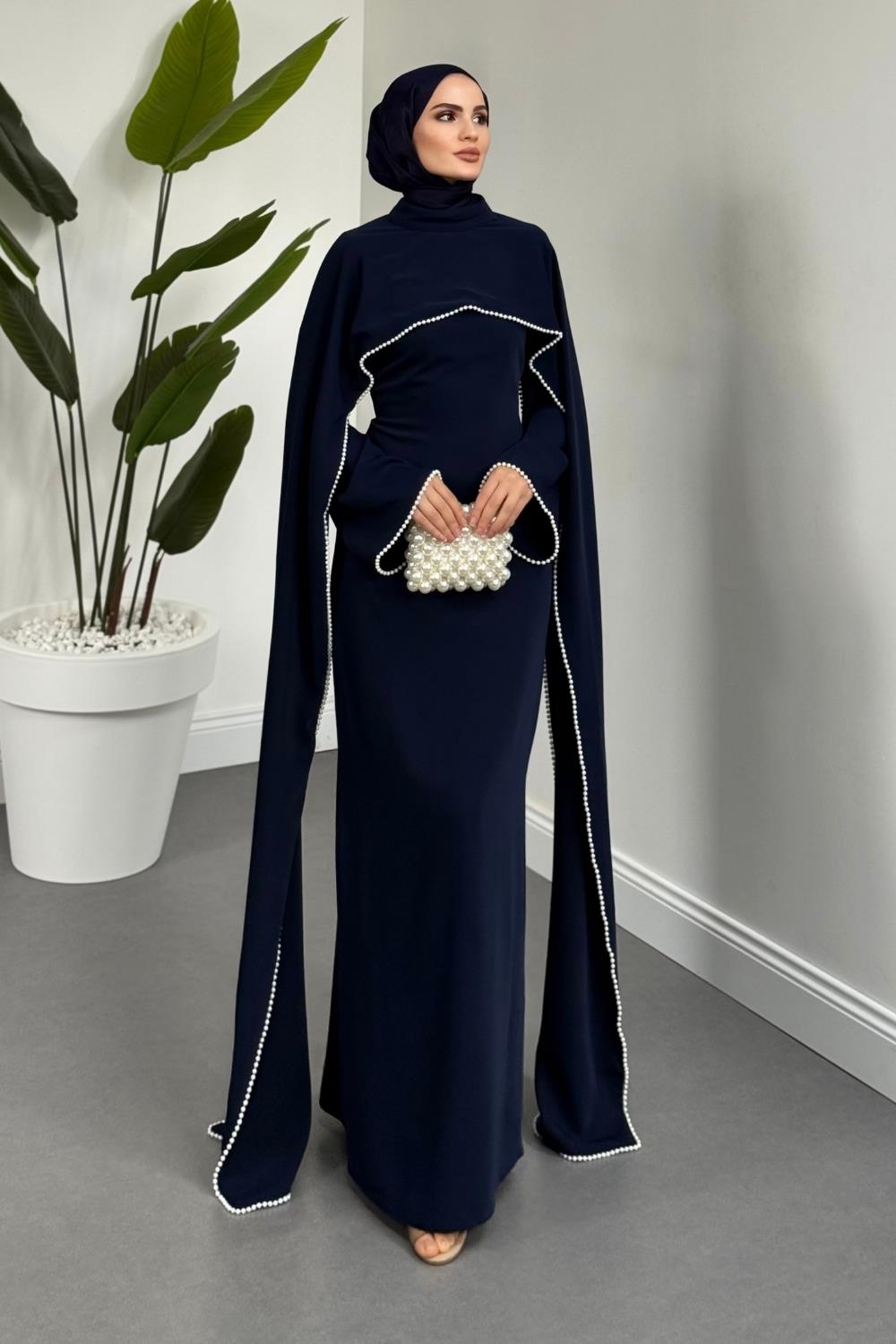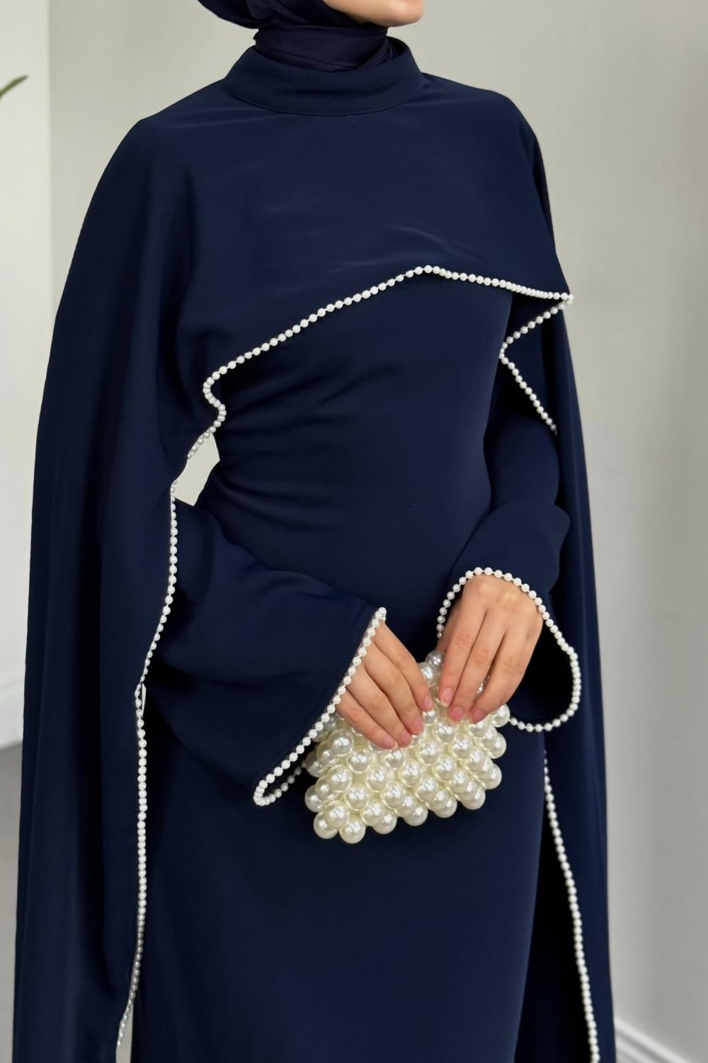 Serein Pelerinli İncili Abiye Lacivert