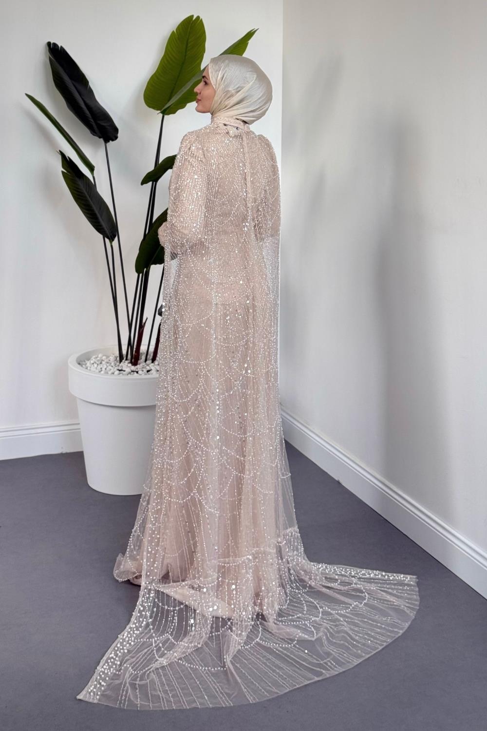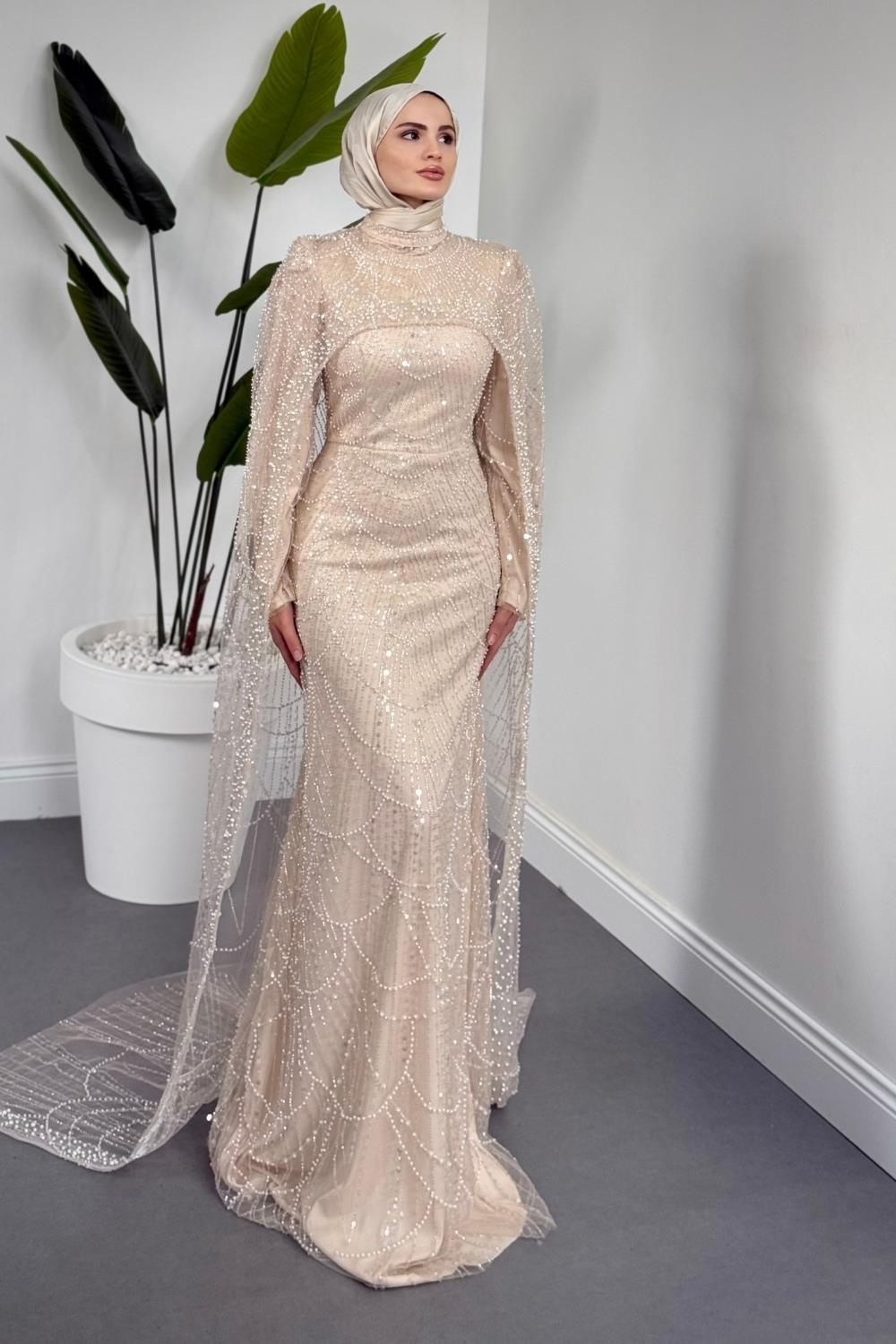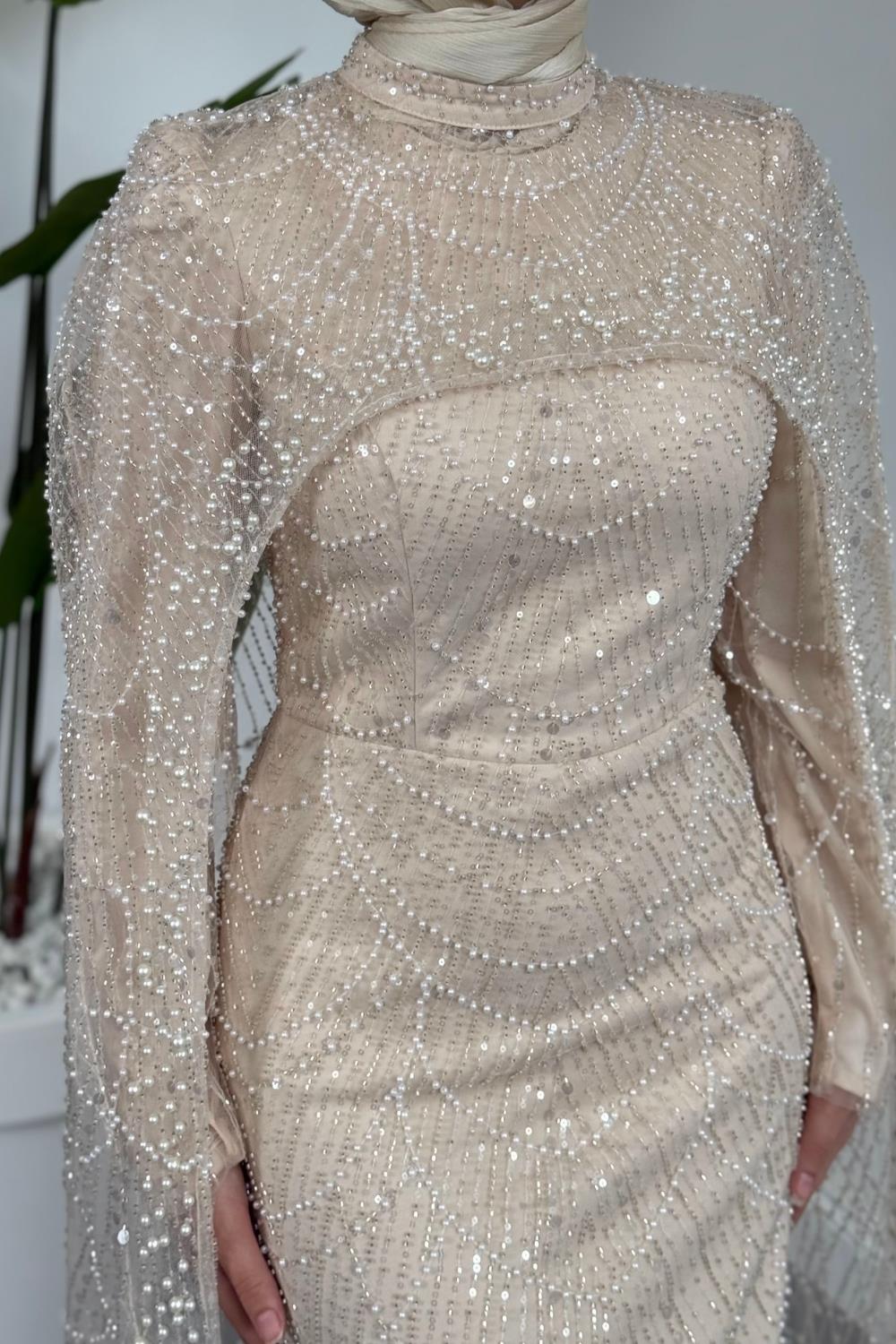 Ardina Pelerinli Boncuk İşlemeli Balık Abiye Krem