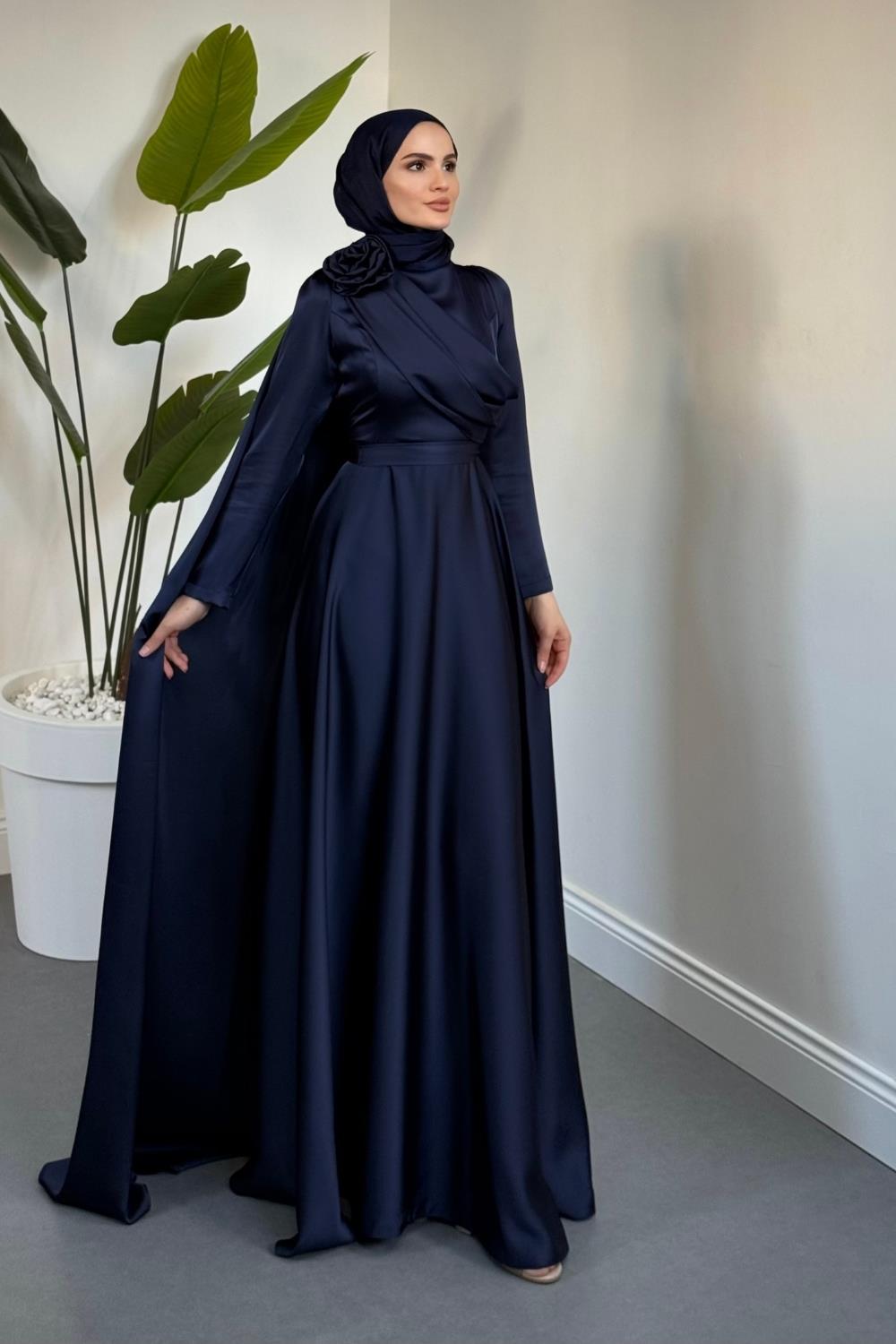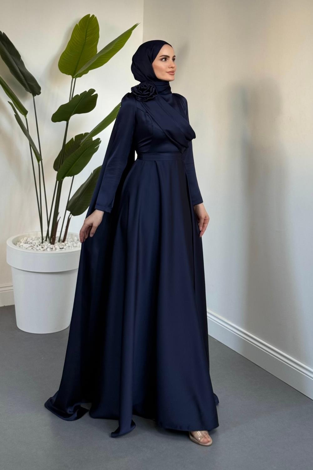 Deravine Omzu Güllü Saten Abiye Lacivert