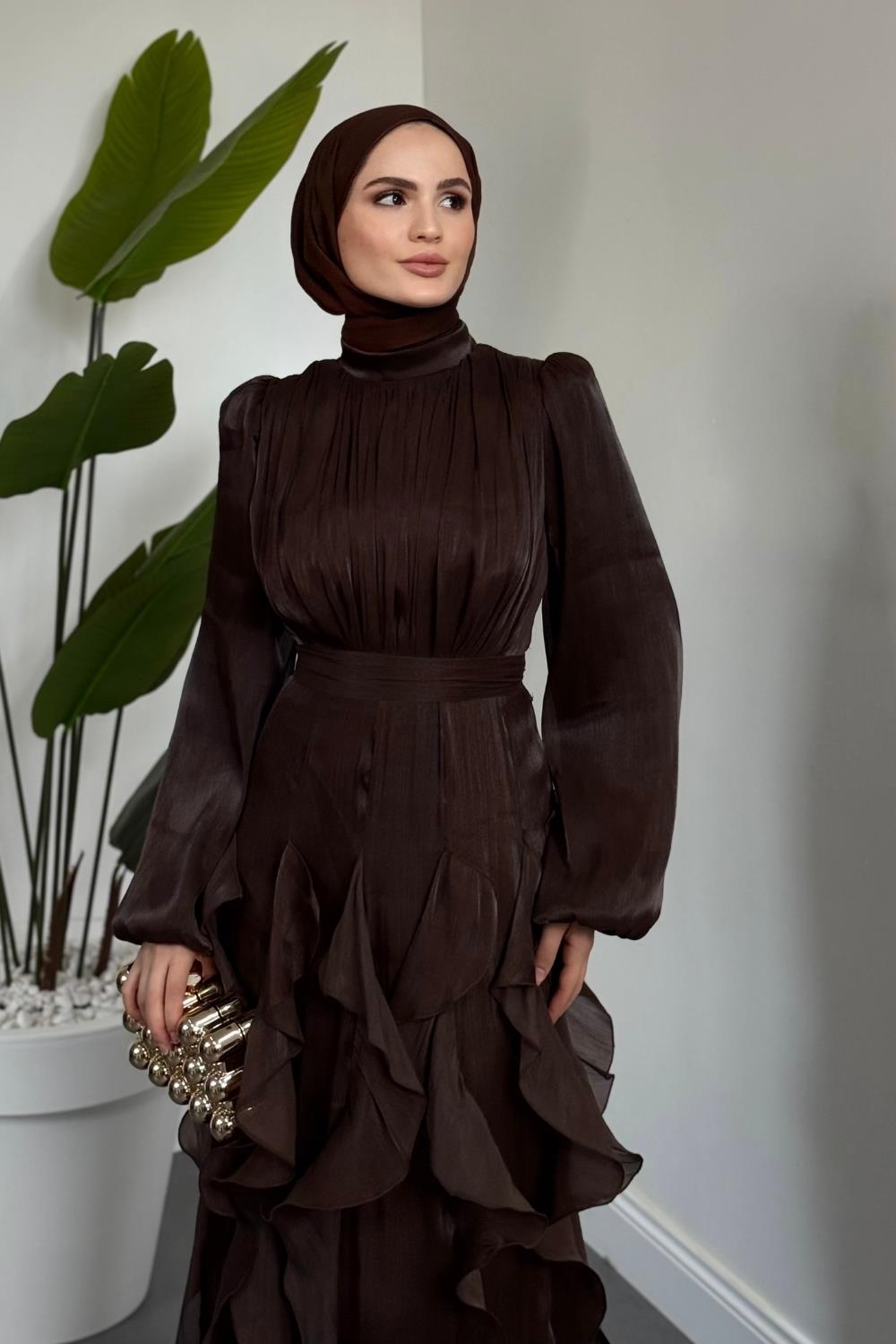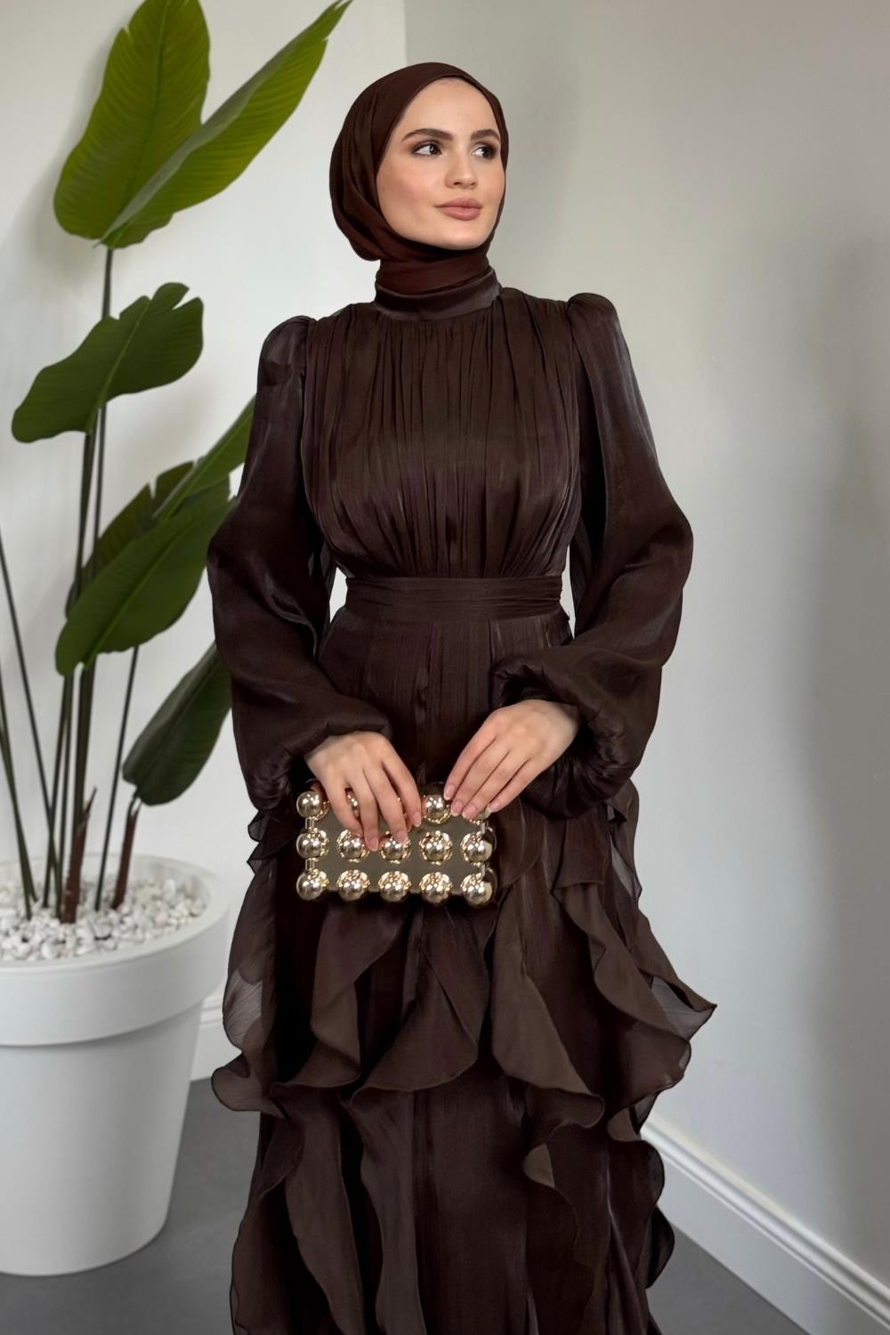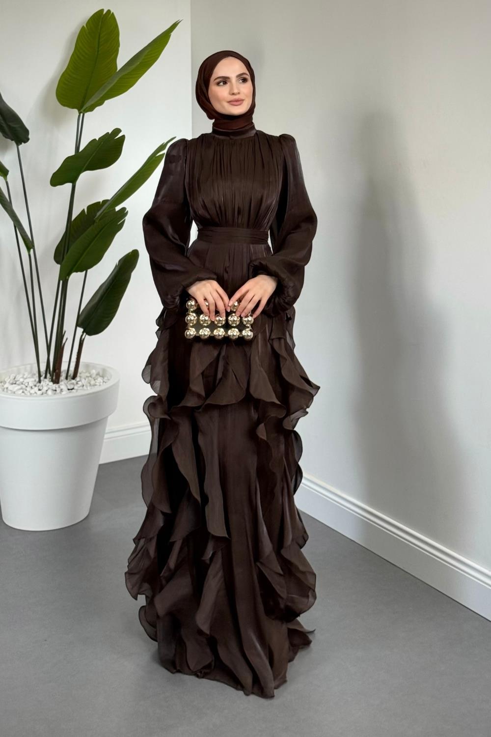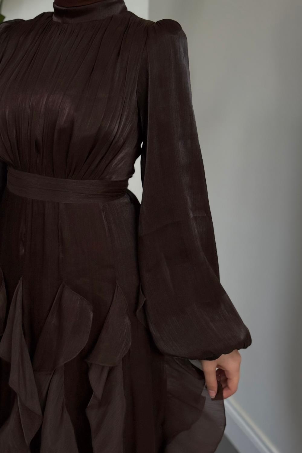 Noveline Eteği Fırfırlı Jan Jan Abiye Acı Kahve
