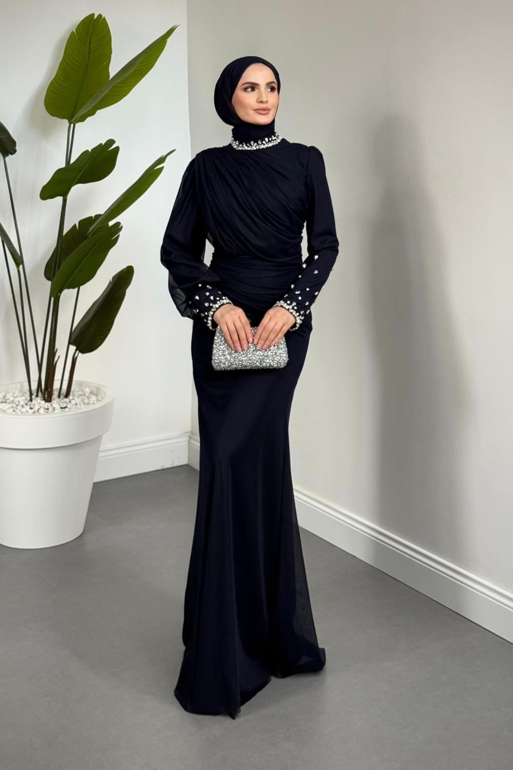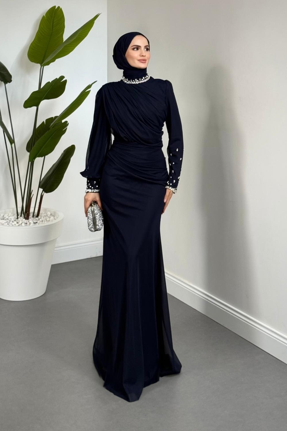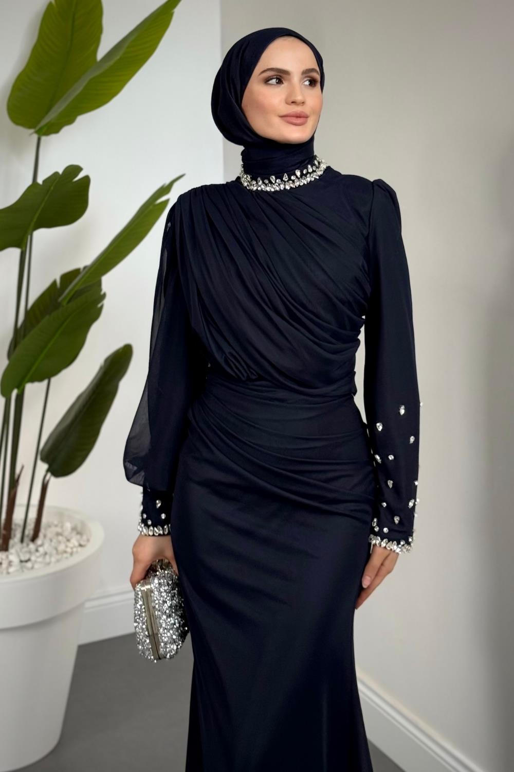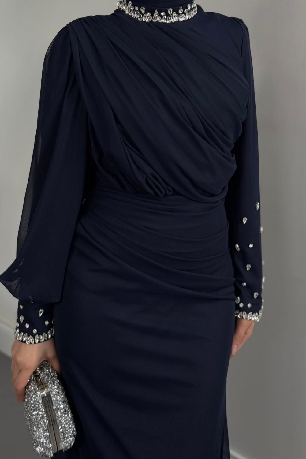 Lavrine Boynu Ve Kolu Taşlı Tül Abiye Lacivert