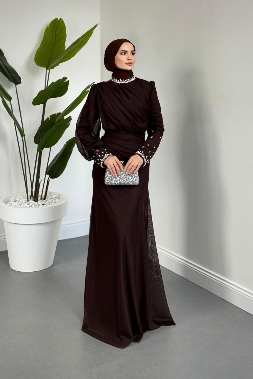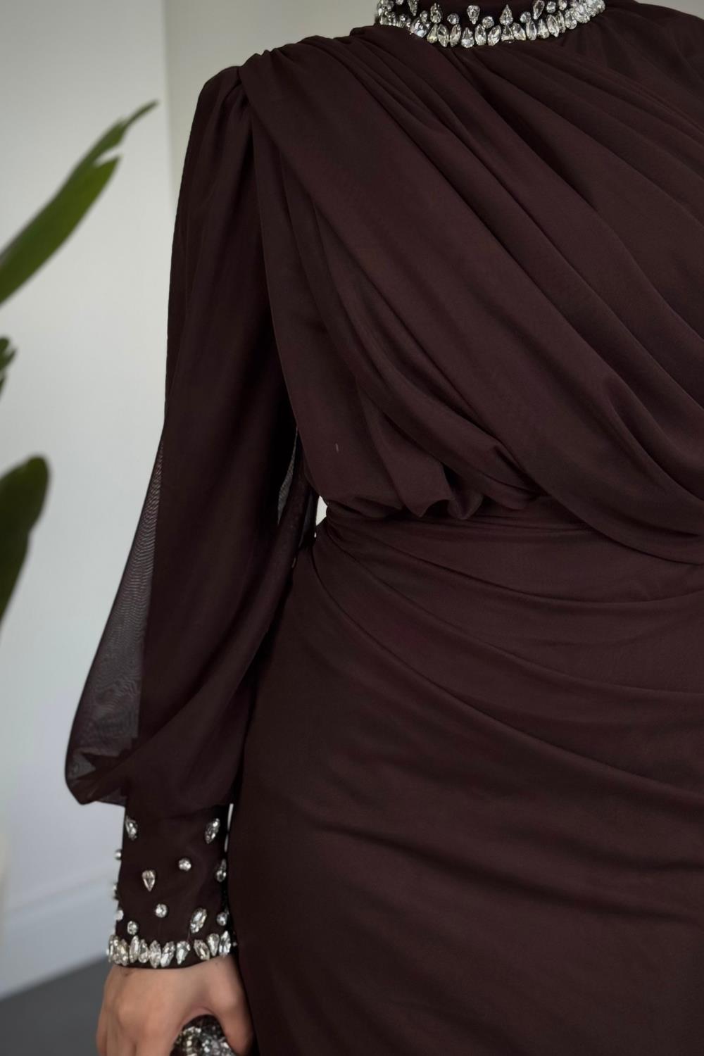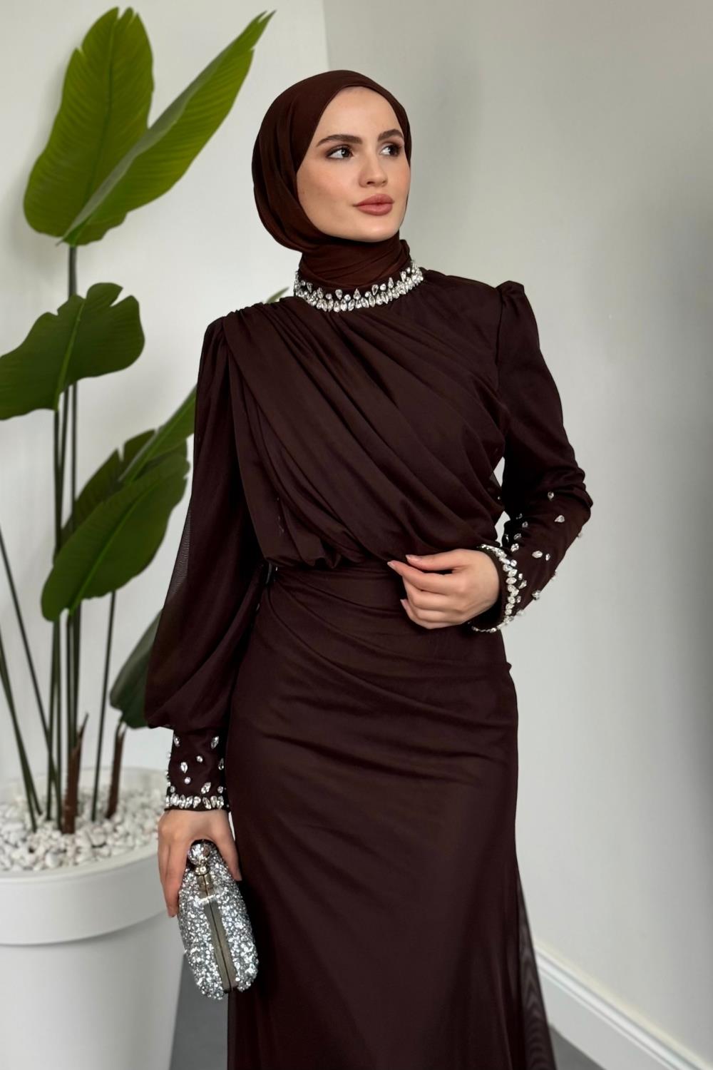 Lavrine Boynu Ve Kolu Taşlı Tül Abiye Acı Kahve