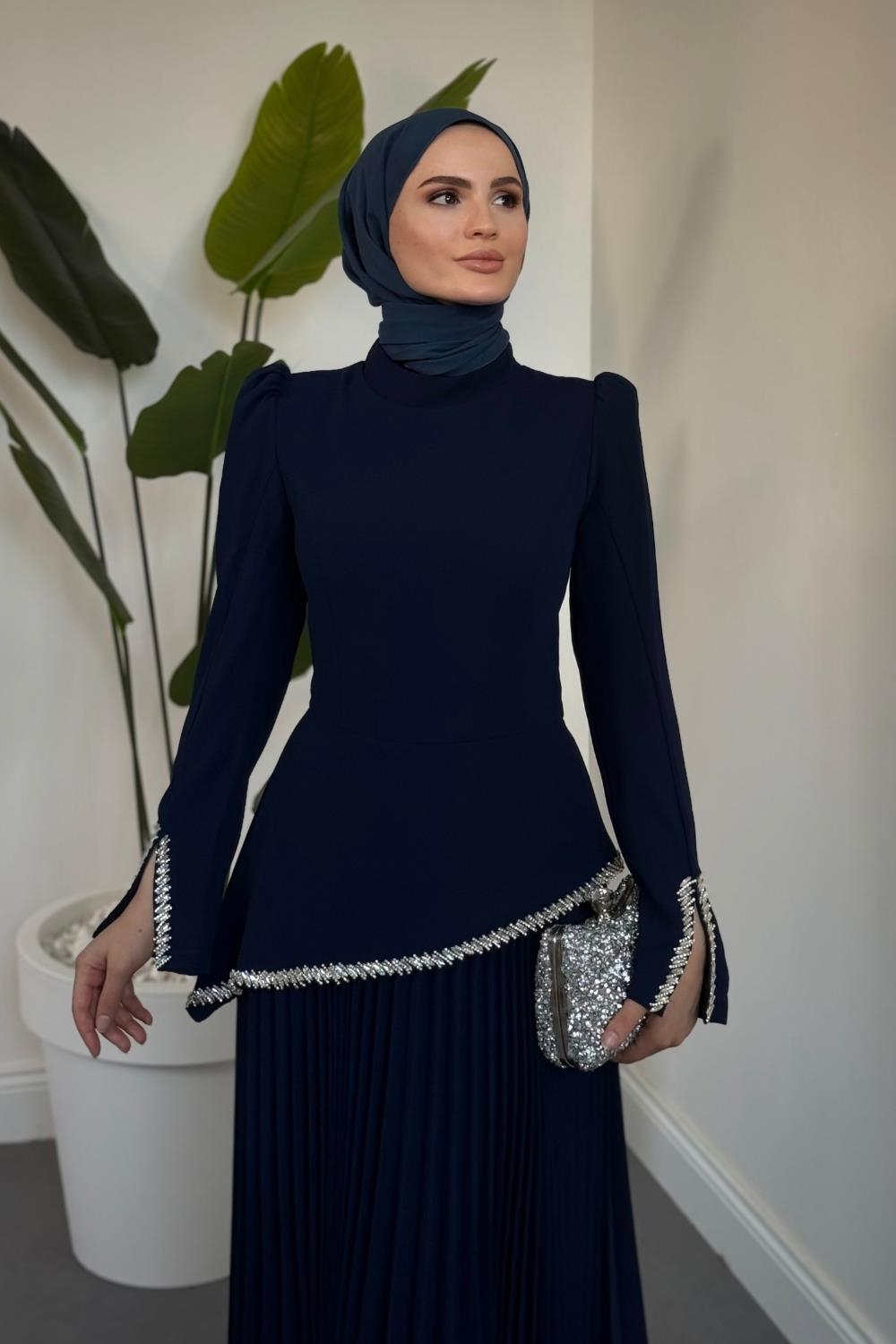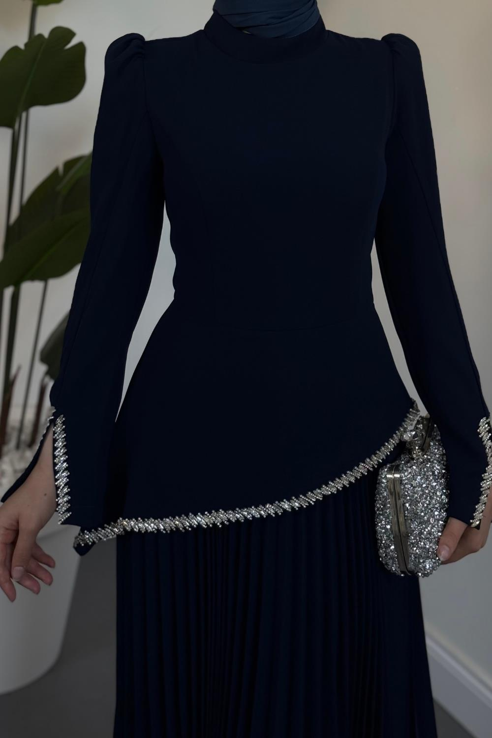 Noirelle Altı Pliseli Asimetrik Kesim Abiye Lacivert