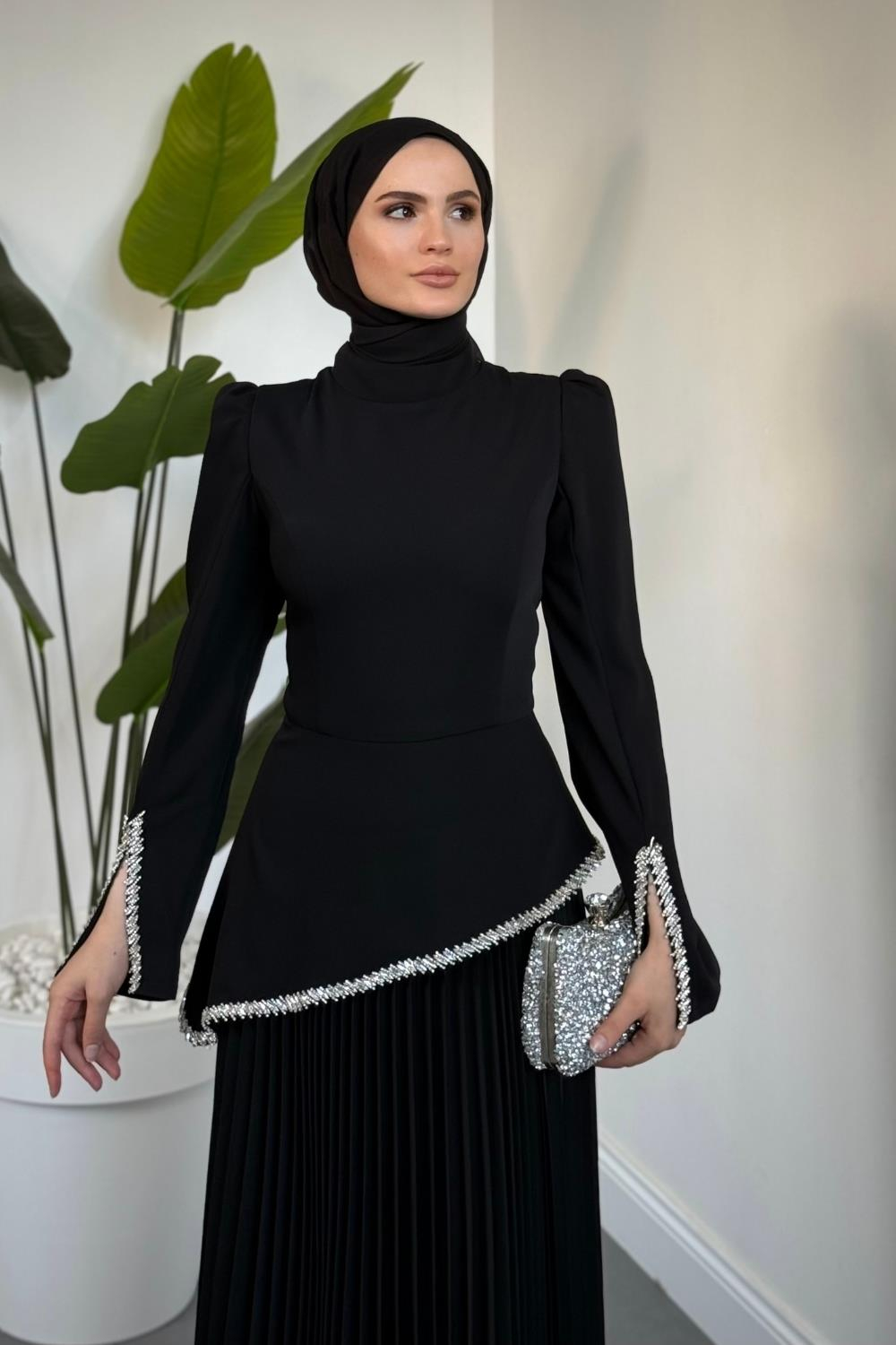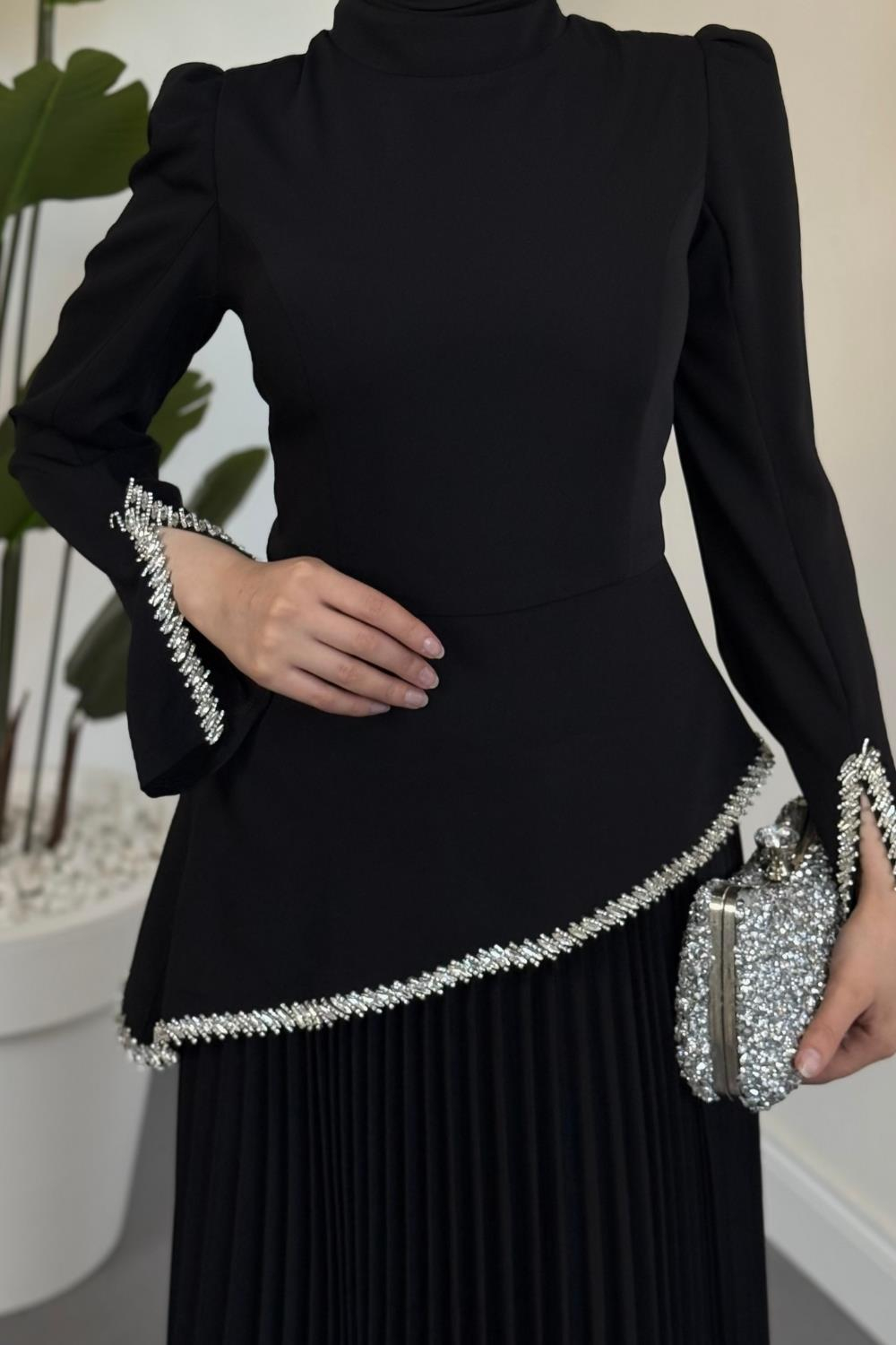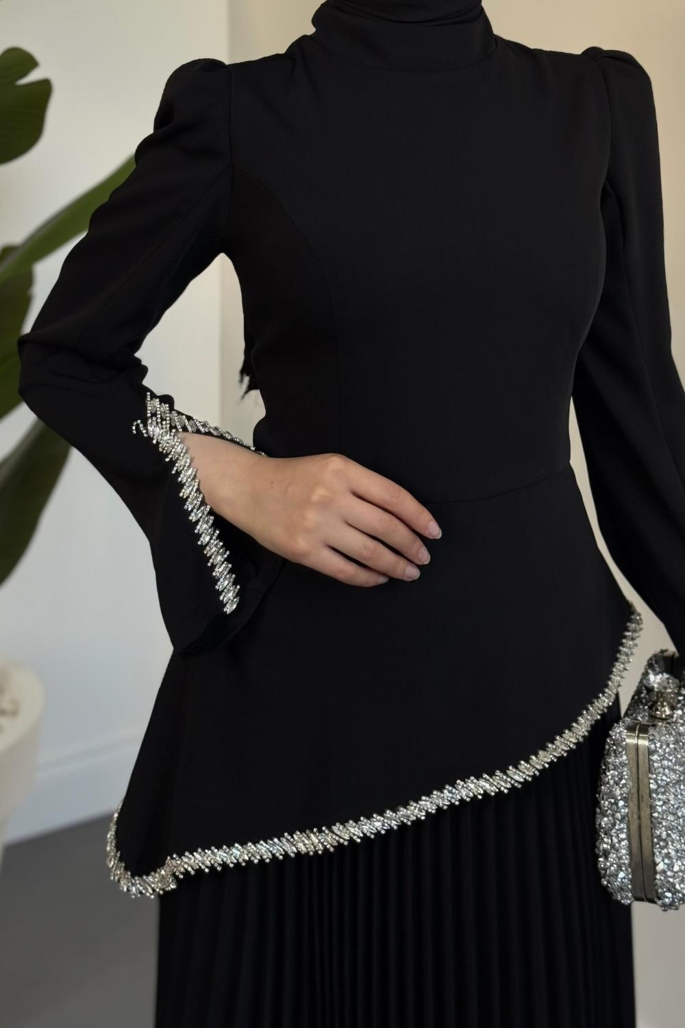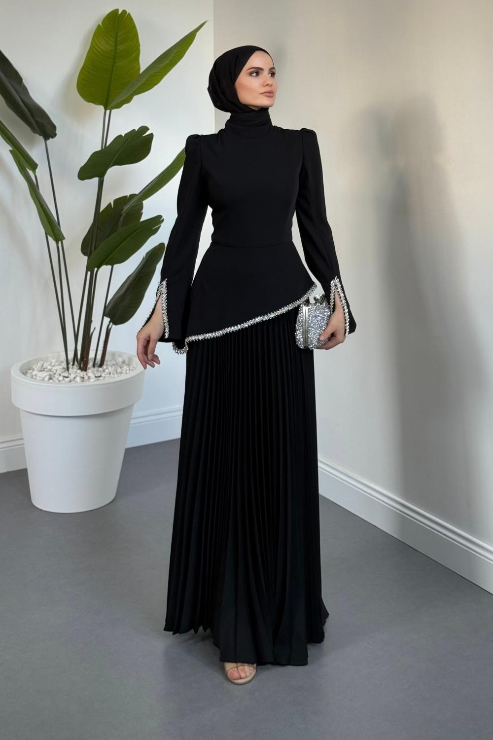 Noirelle Altı Pliseli Asimetrik Kesim Abiye Siyah