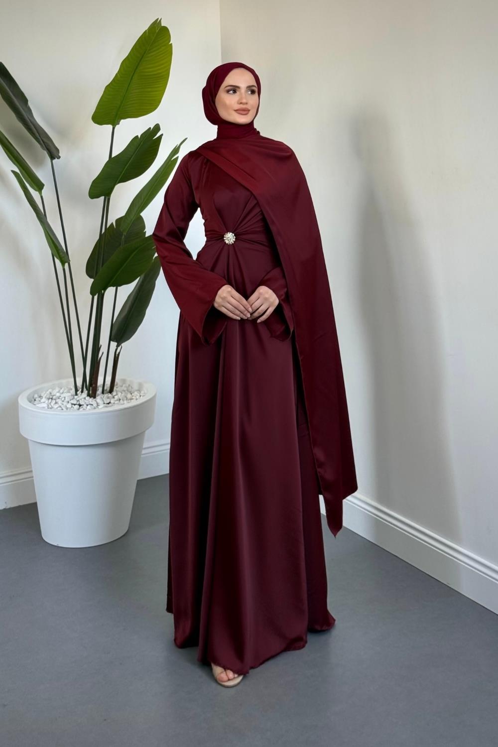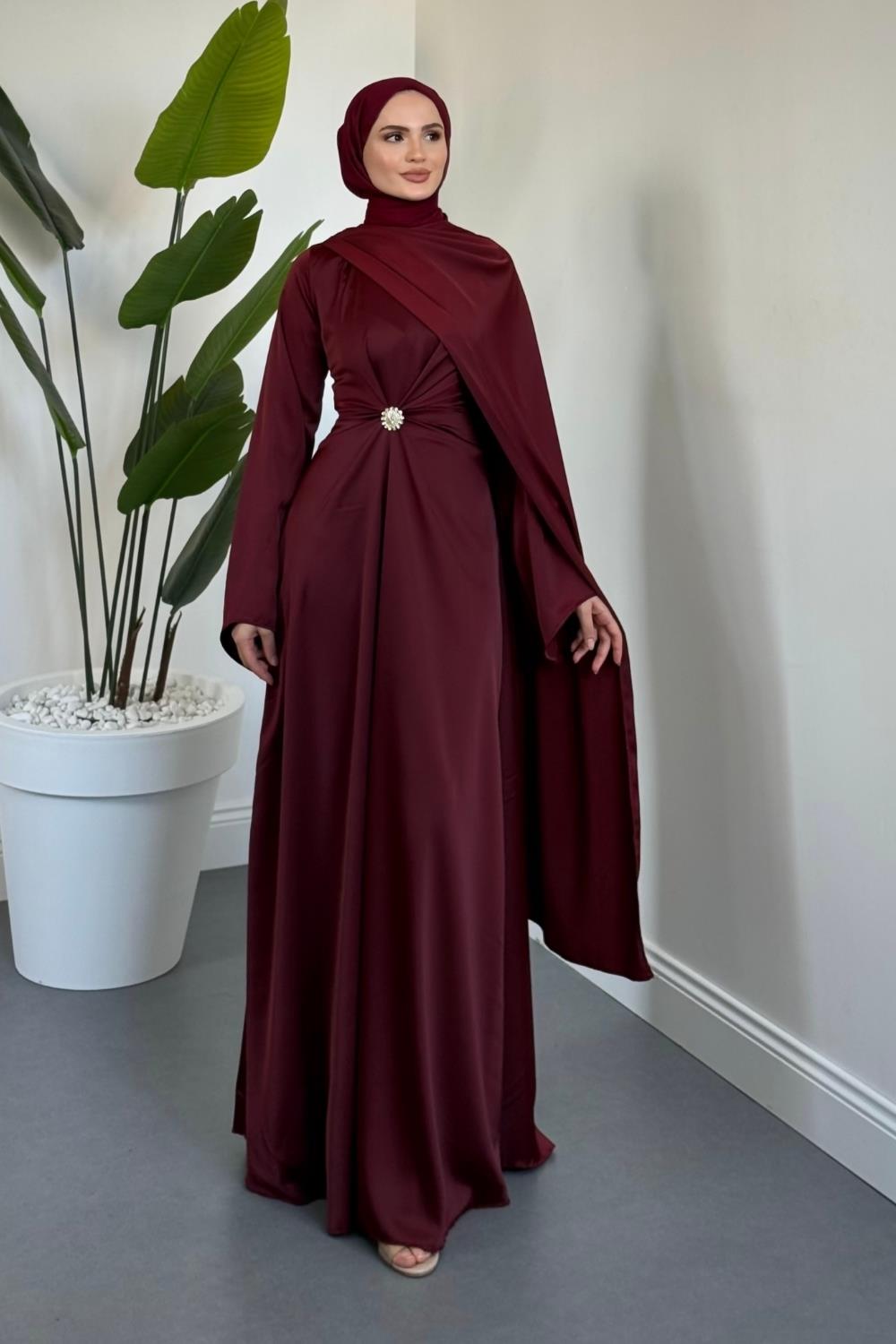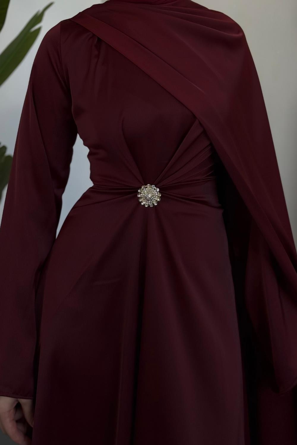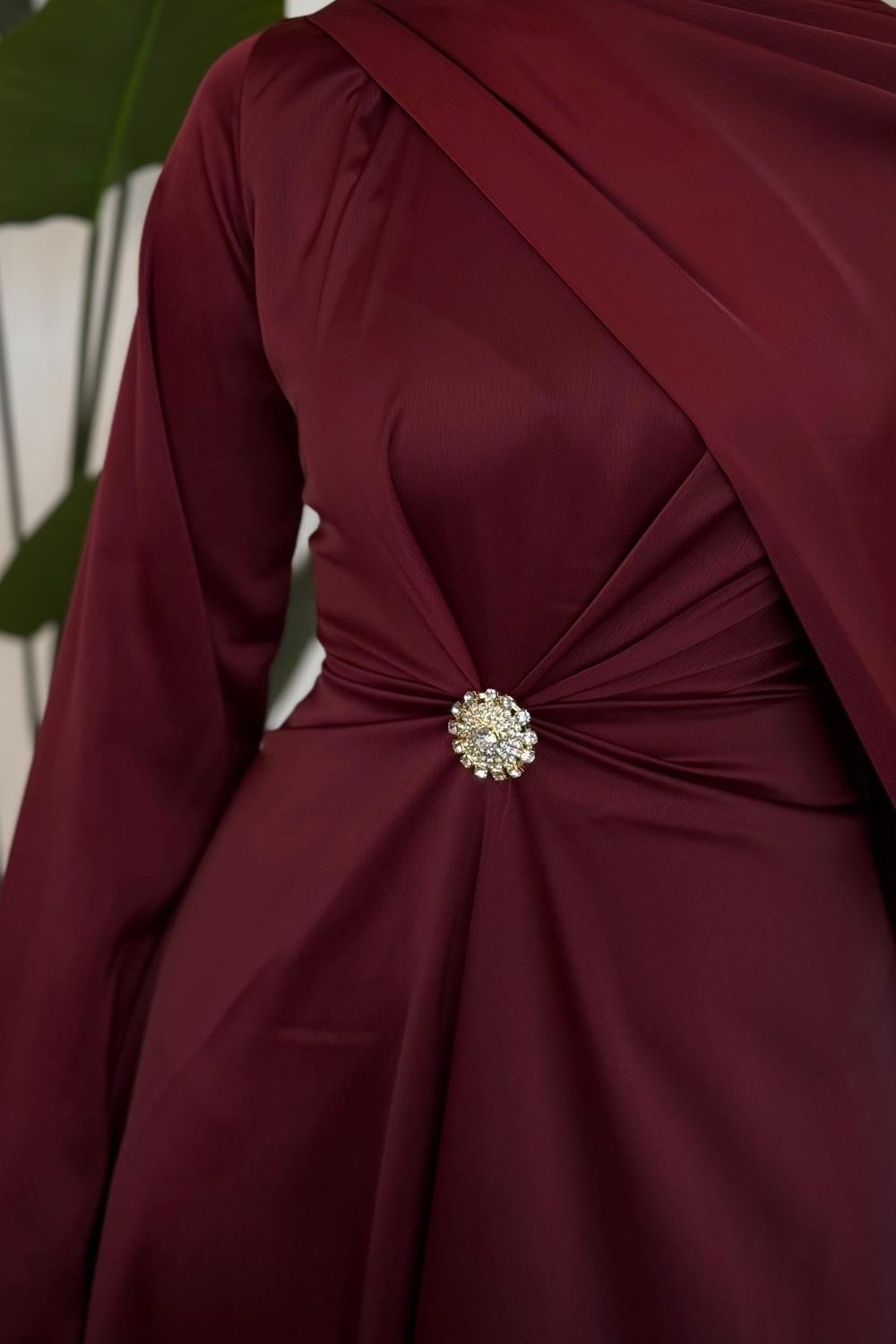 Wave Broşlu Pelerinli Saten Abiye Bordo