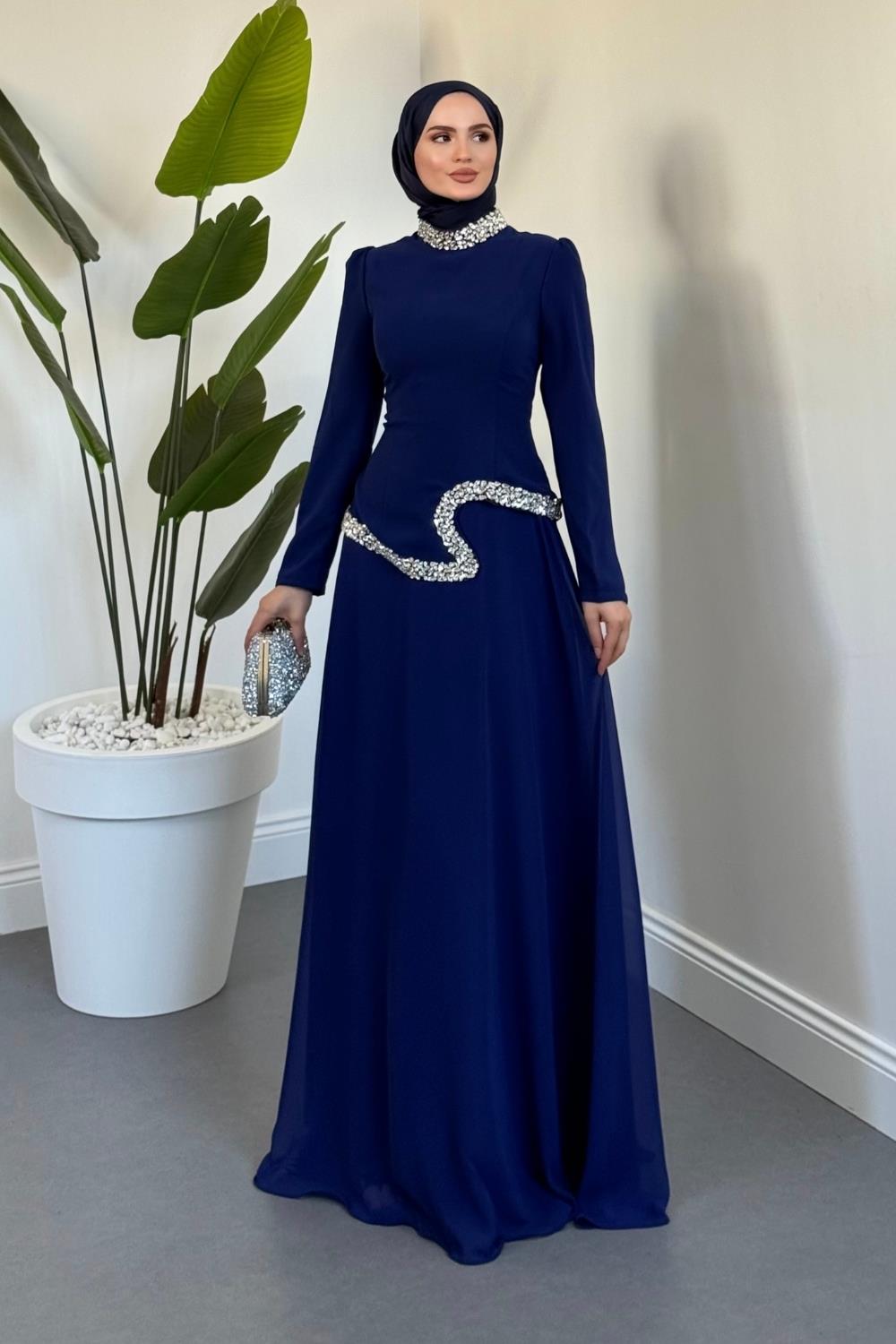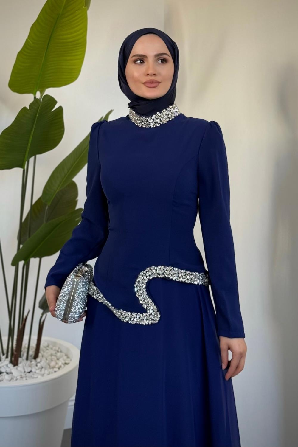 Ravell Boynu Ve Bel Kısmı Taşlı Abiye Lacivert