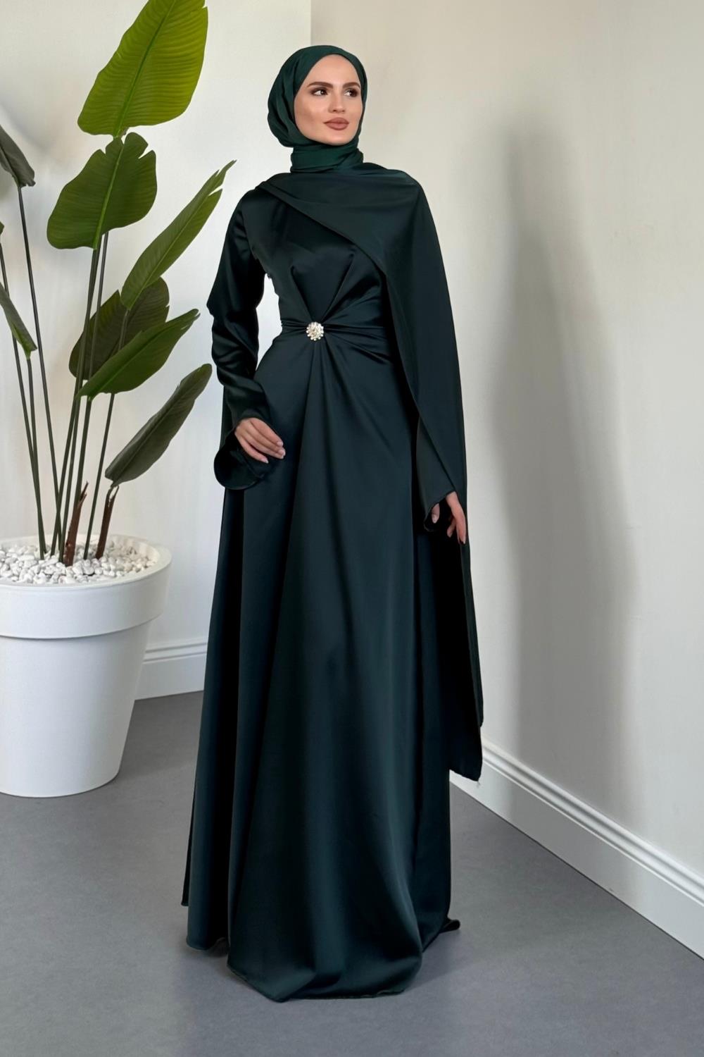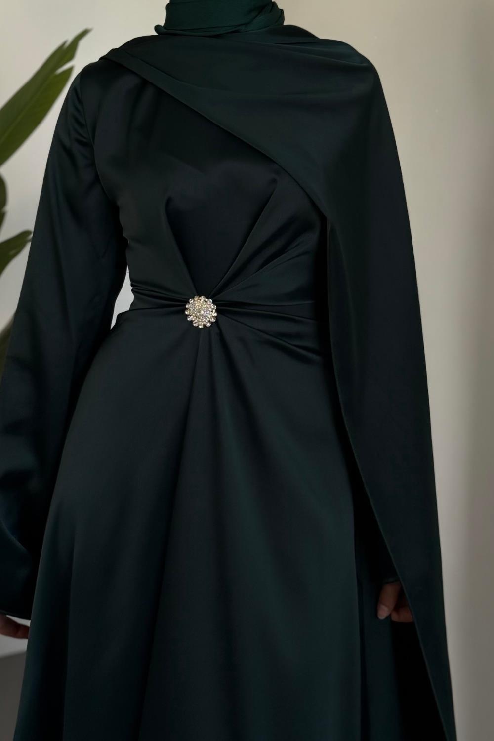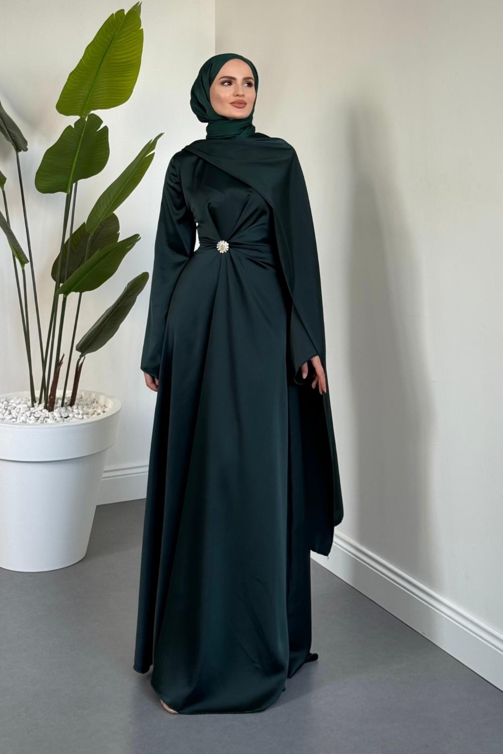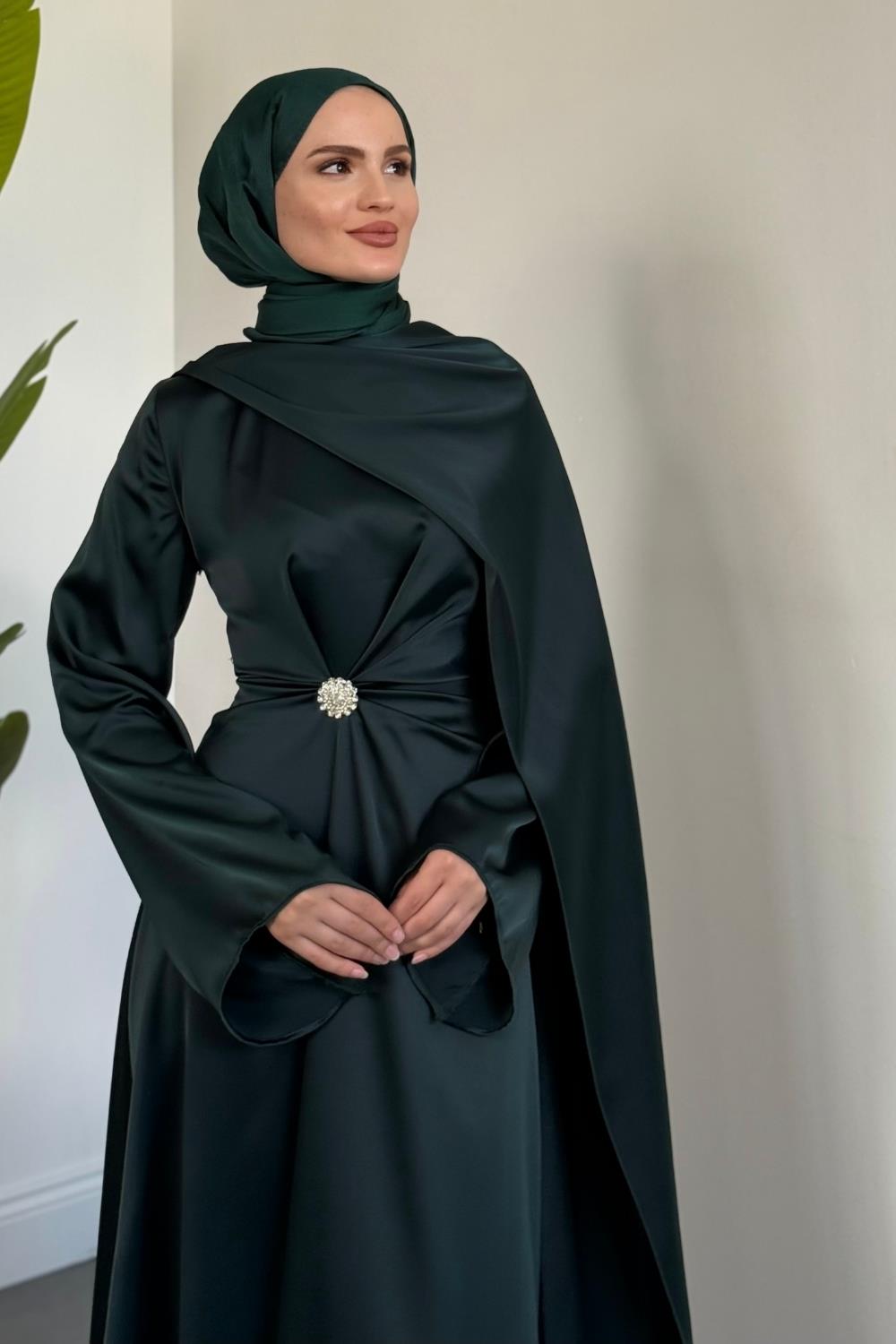 Wave Broşlu Pelerinli Saten Abiye Petrol Yeşili