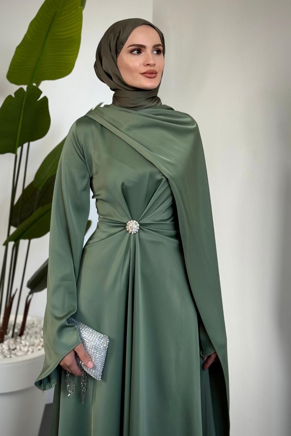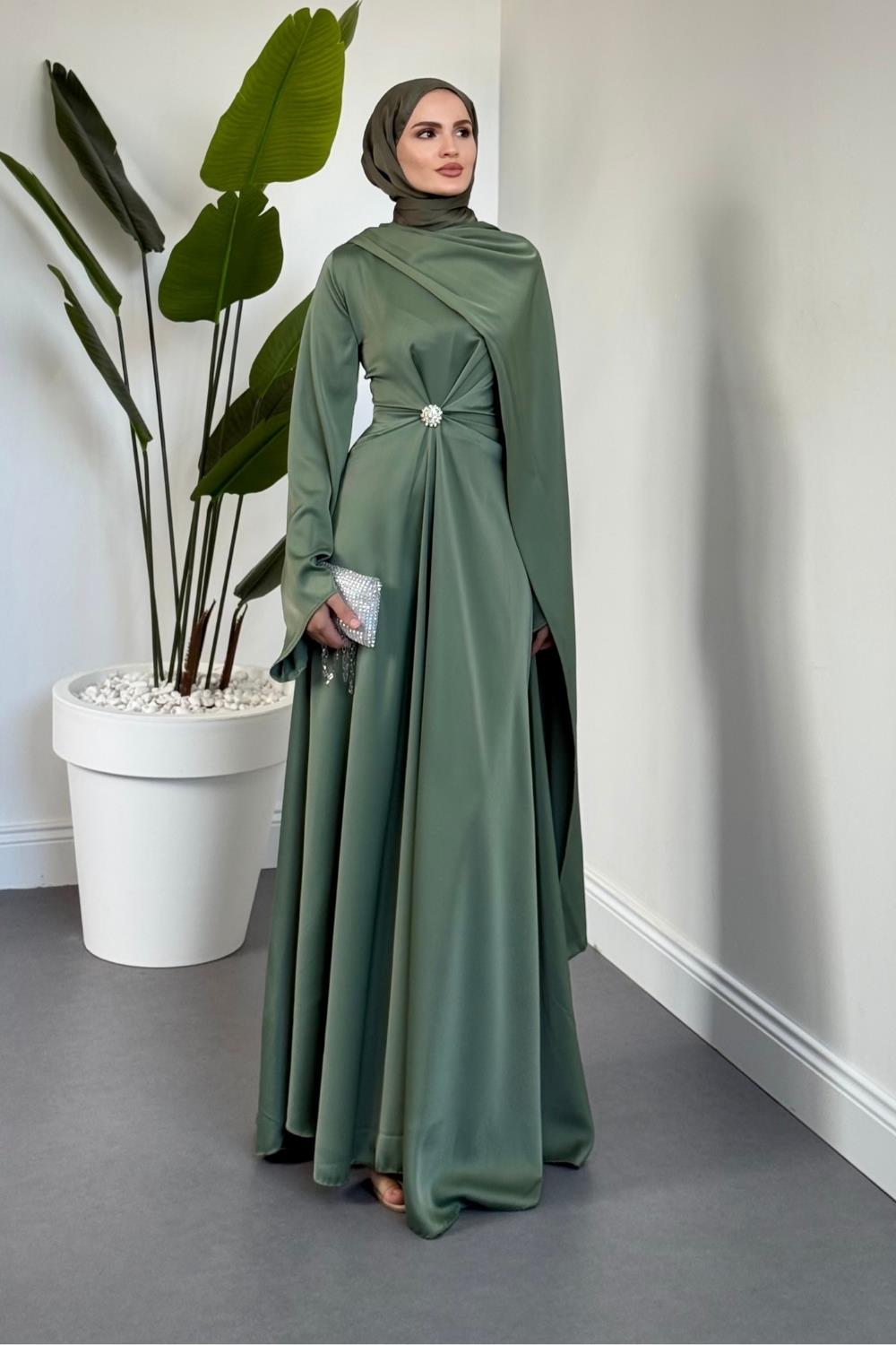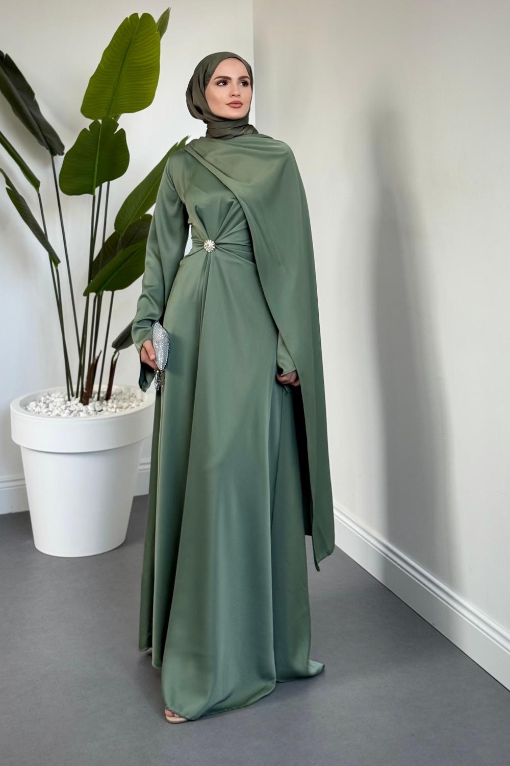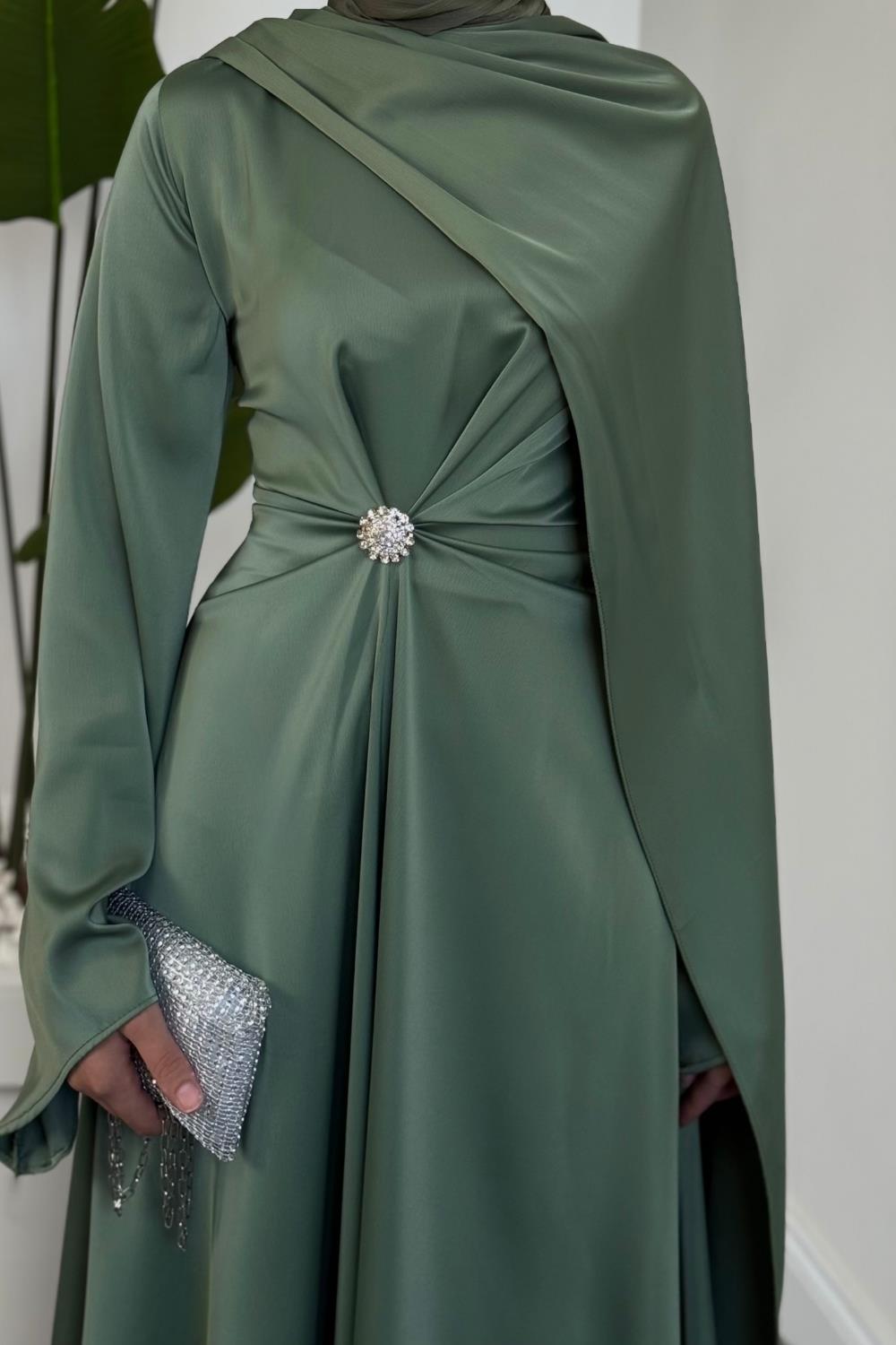 Wave Broşlu Pelerinli Saten Abiye Mint