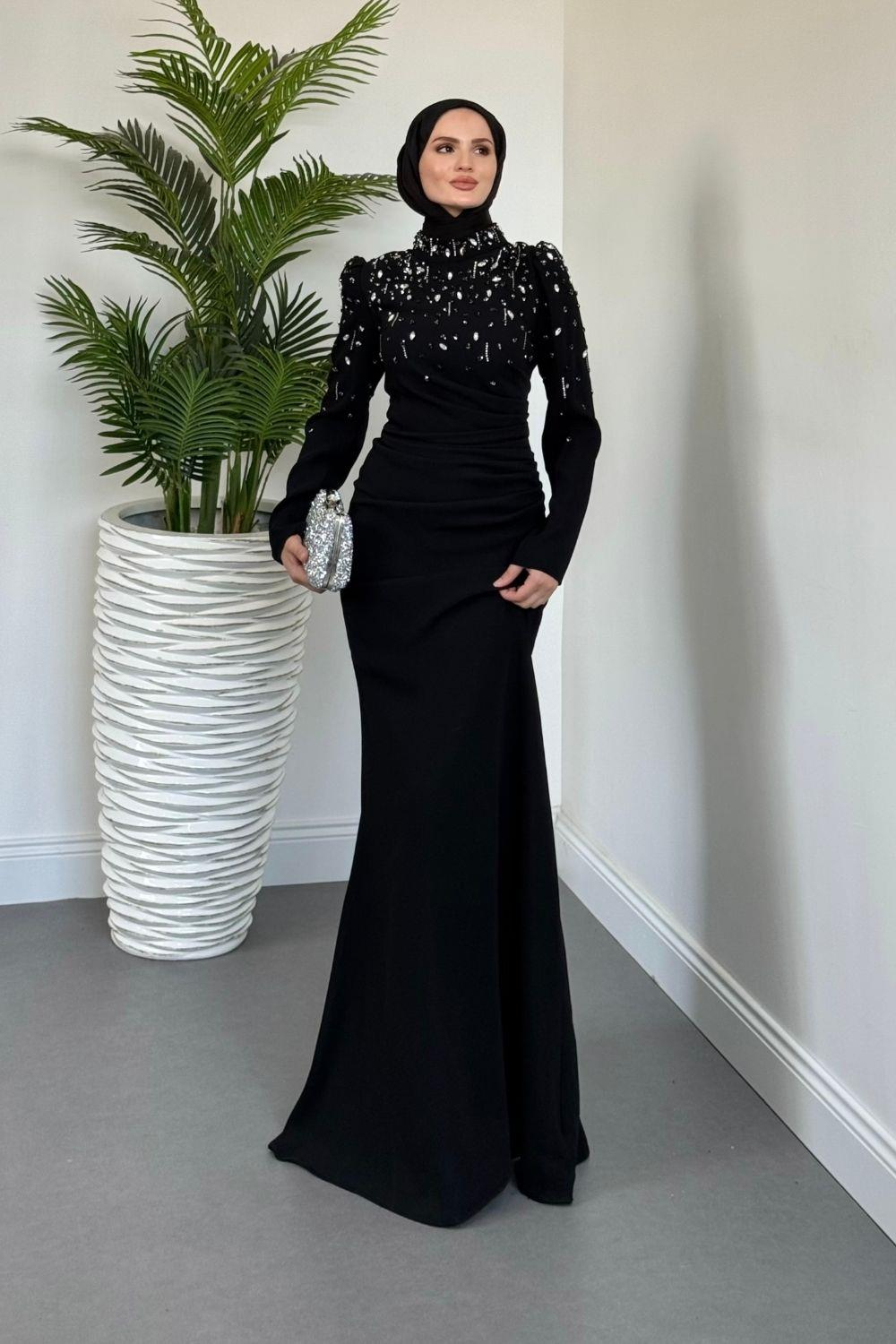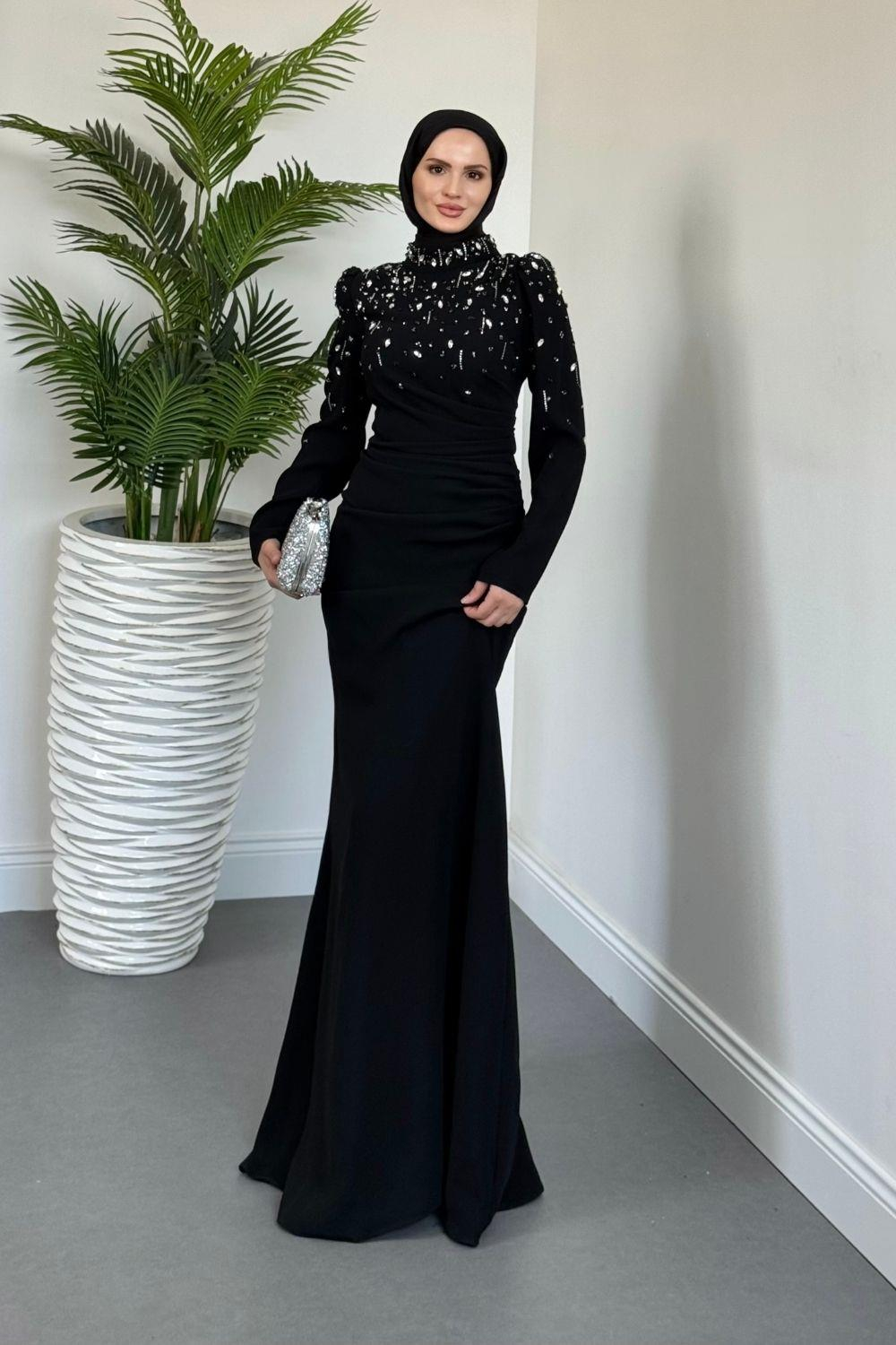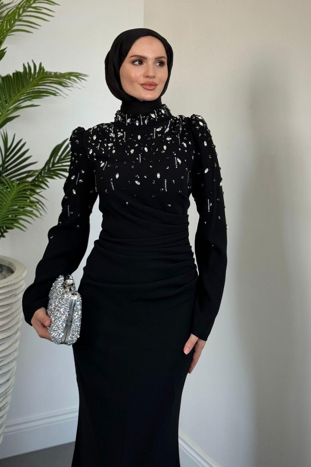 Lidya Taşlı Drapeli Balık Abiye Siyah