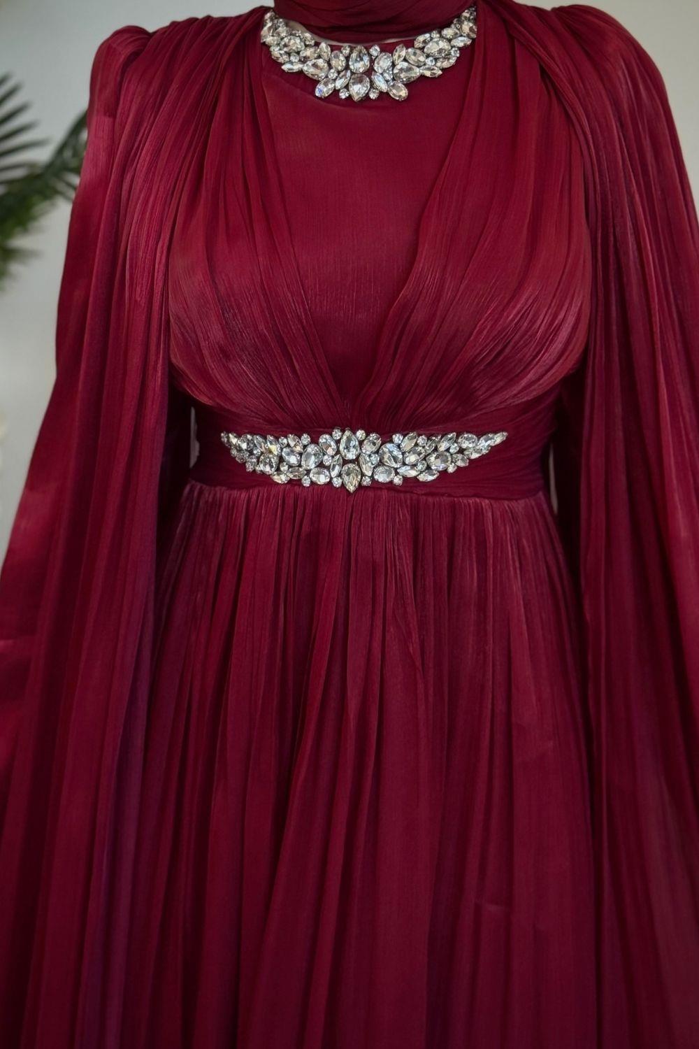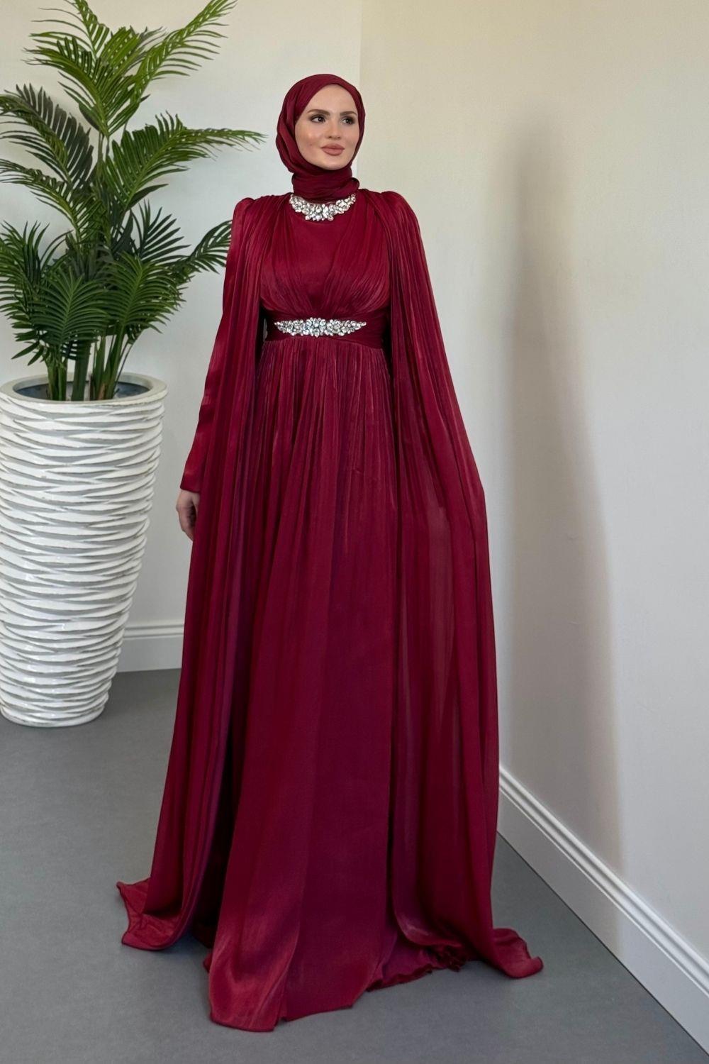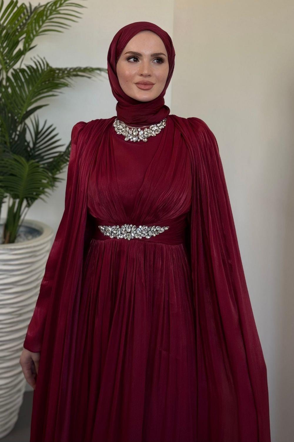 Solea Kolları Pelerinli Taşlı Abiye Bordo
