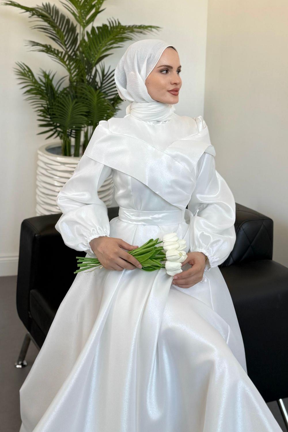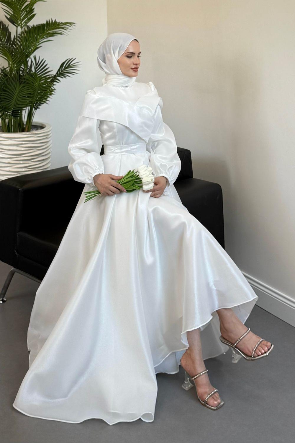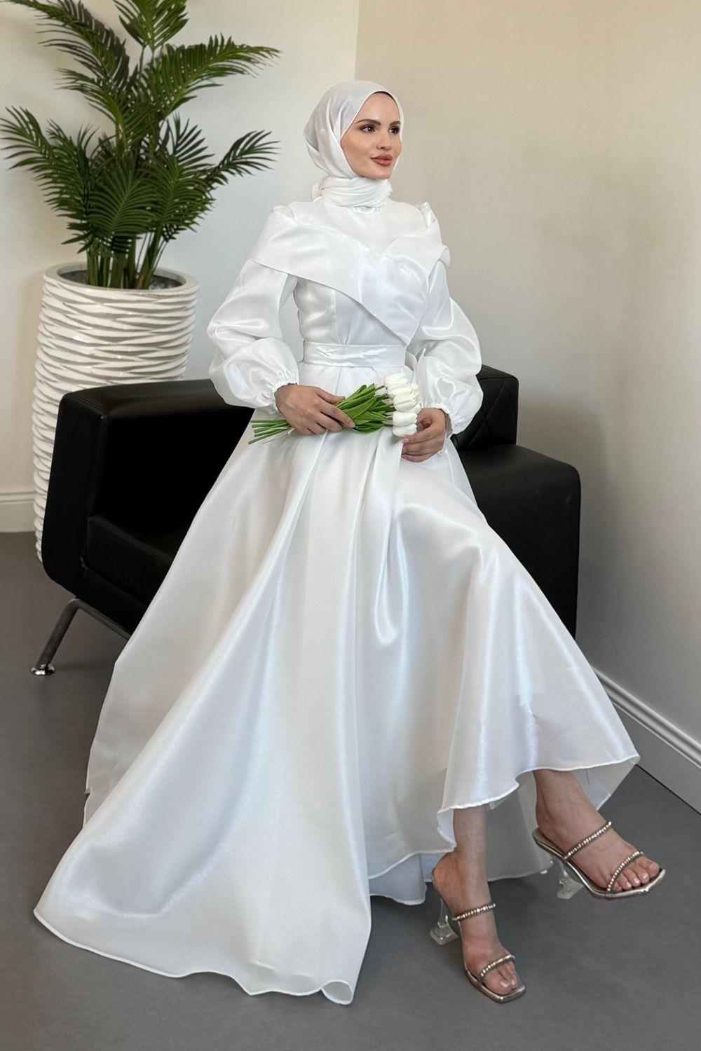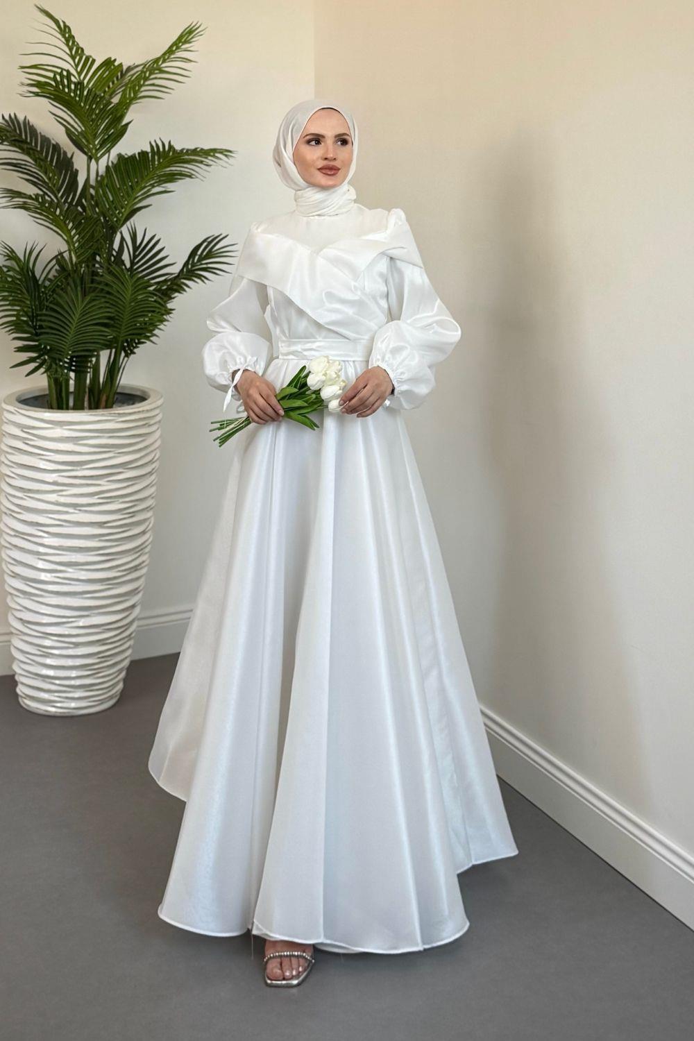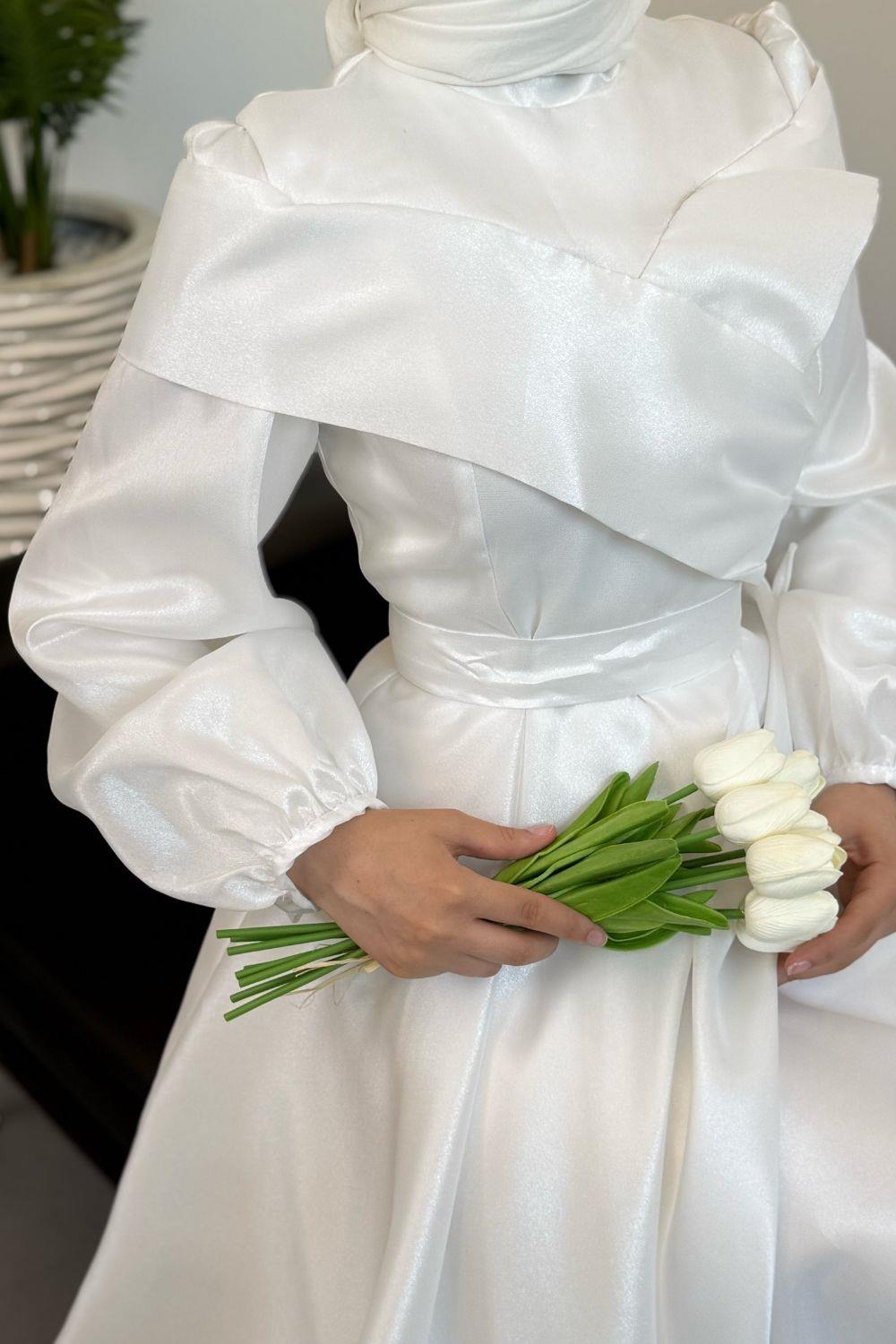 Arvia Üstü Volan Balon Kol Abiye Beyaz