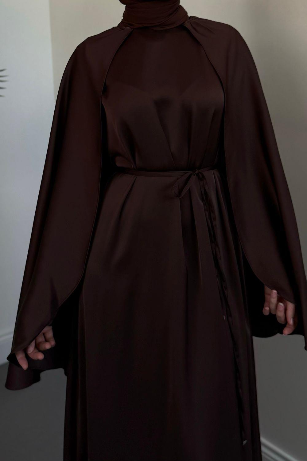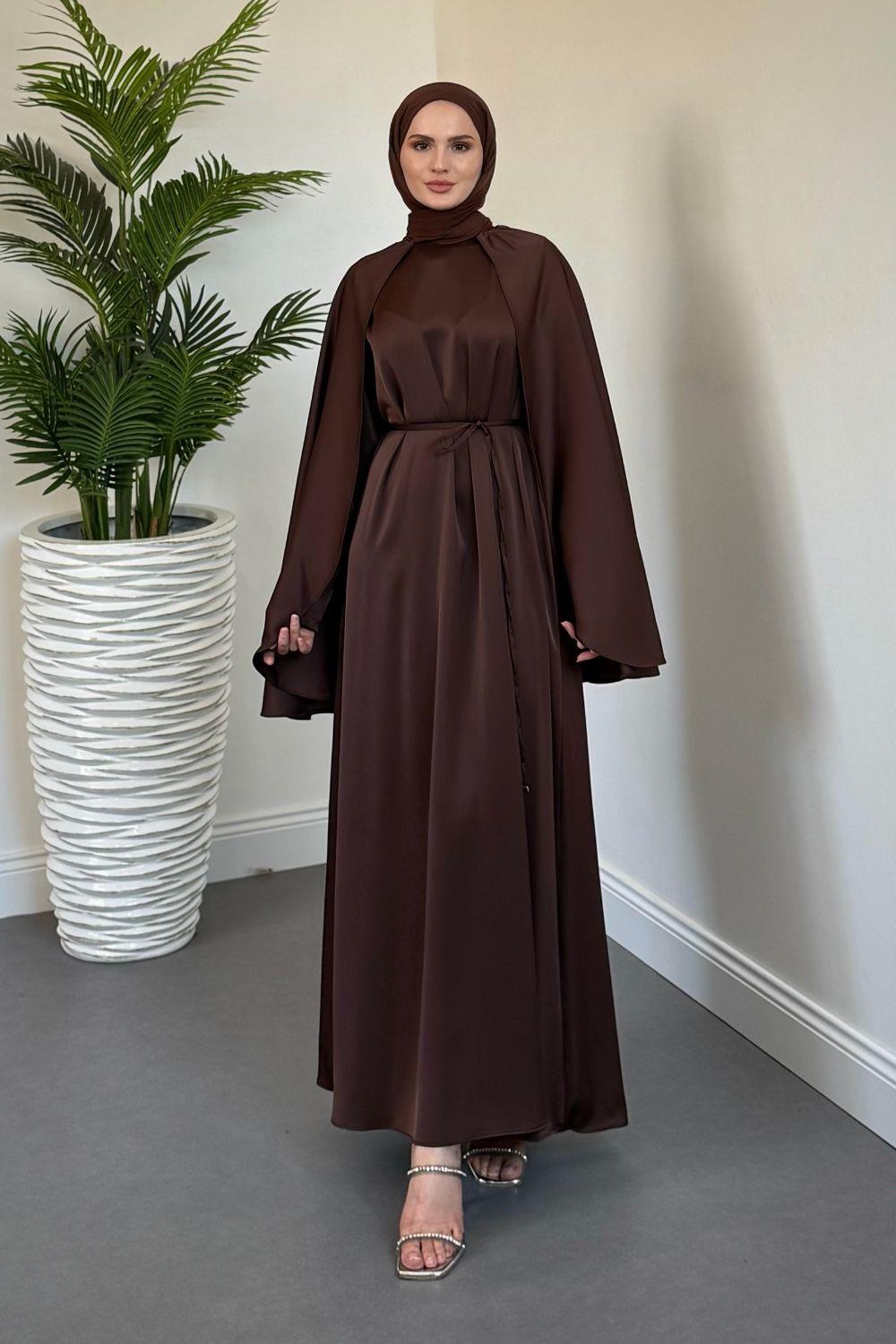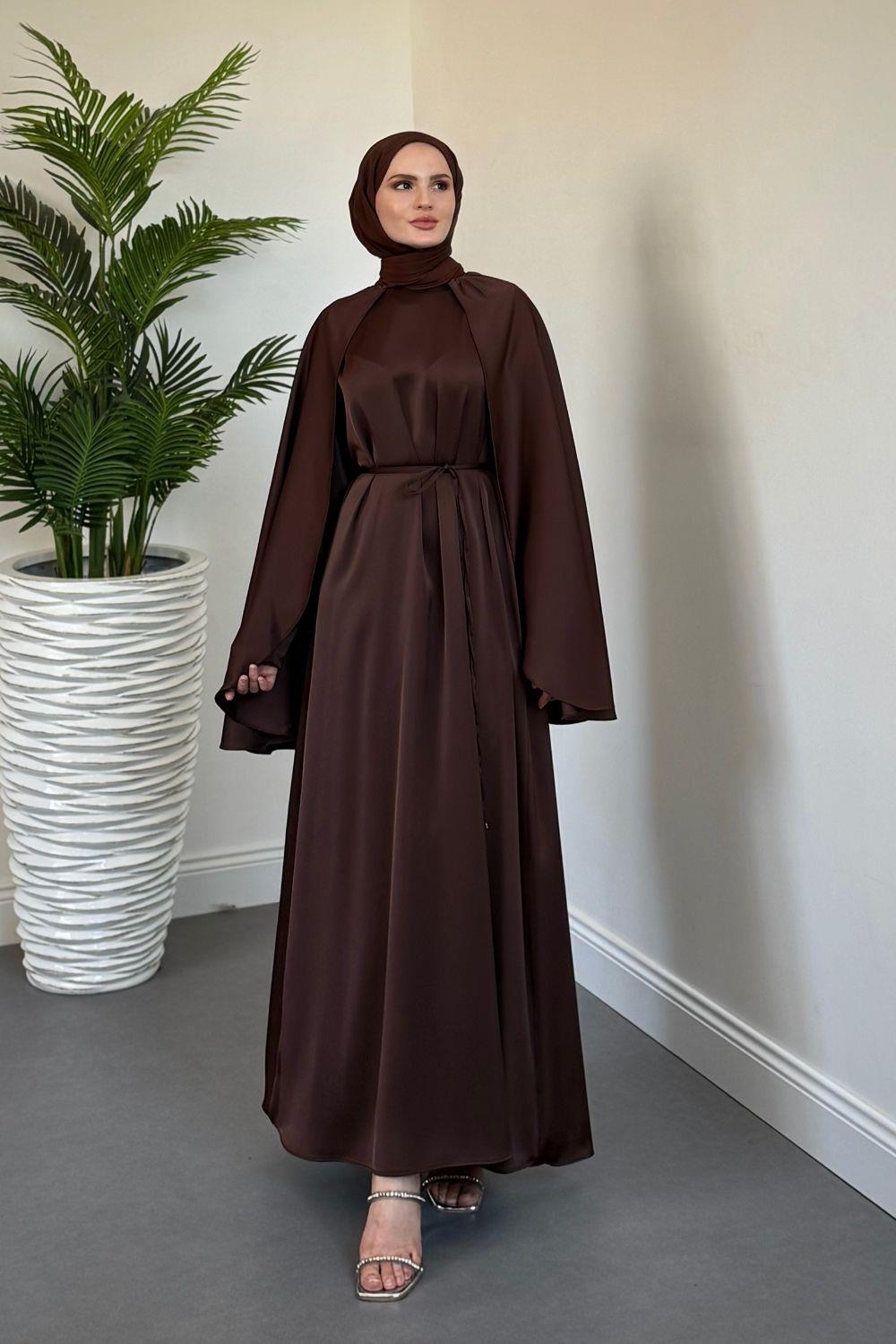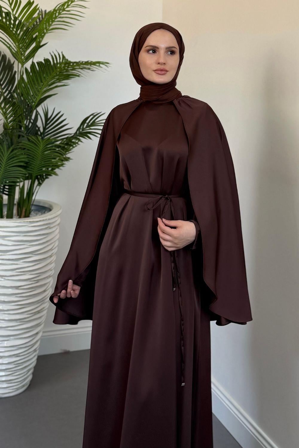 Elior Pelerinli Saten Abiye Kahverengi