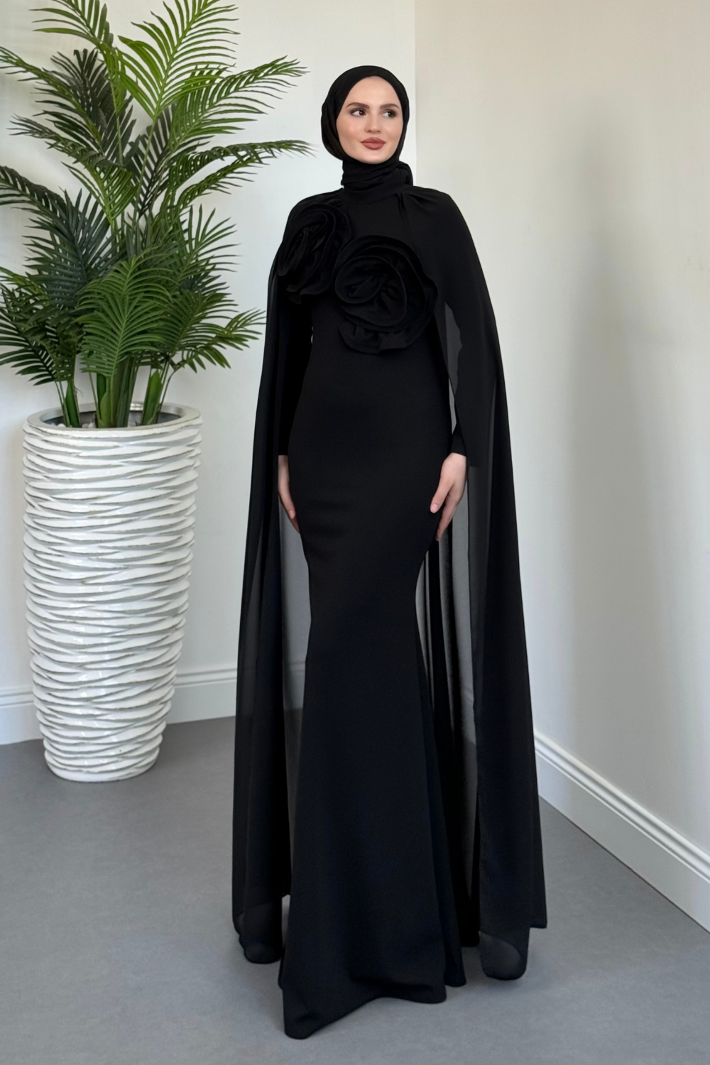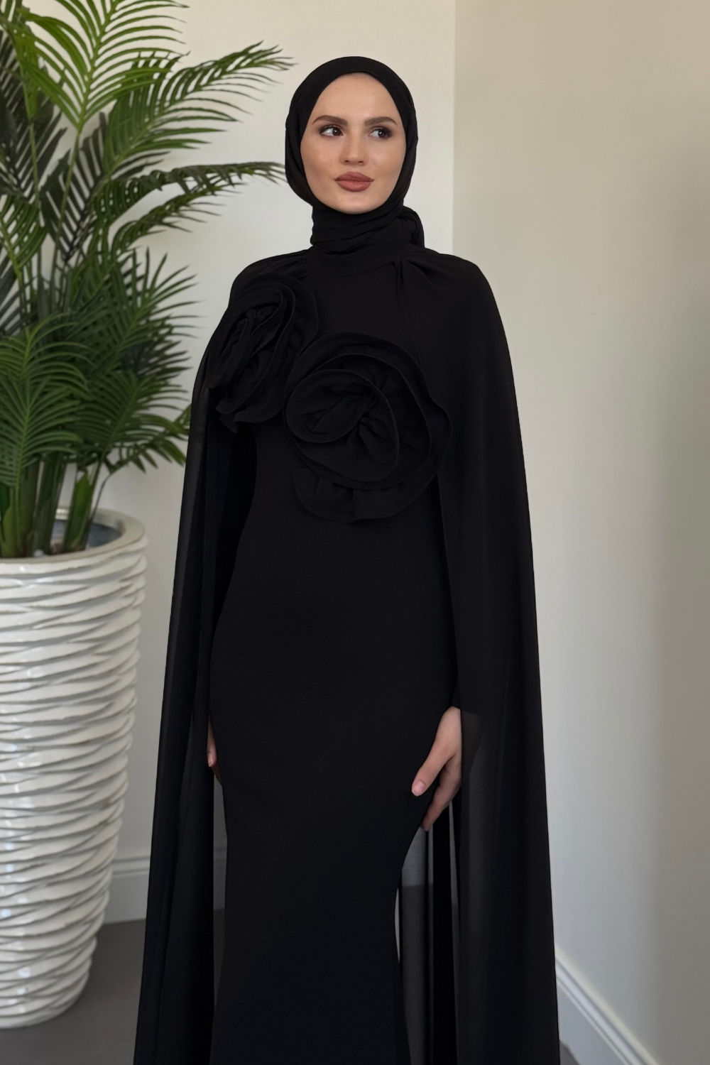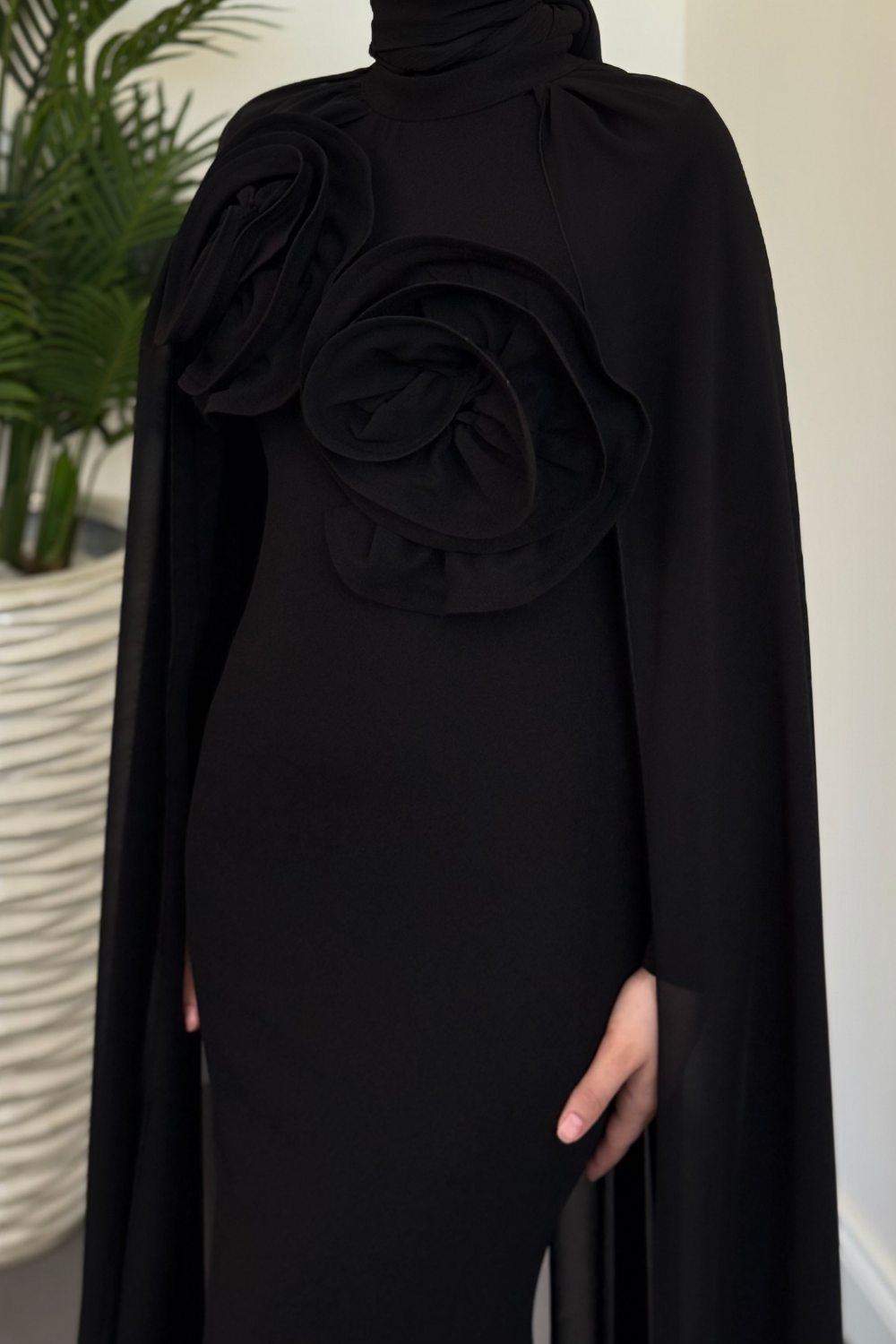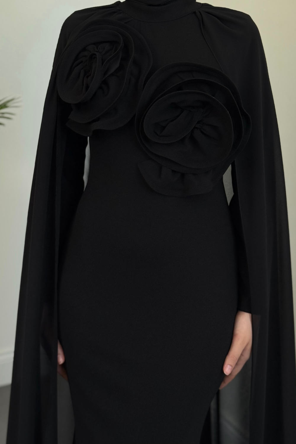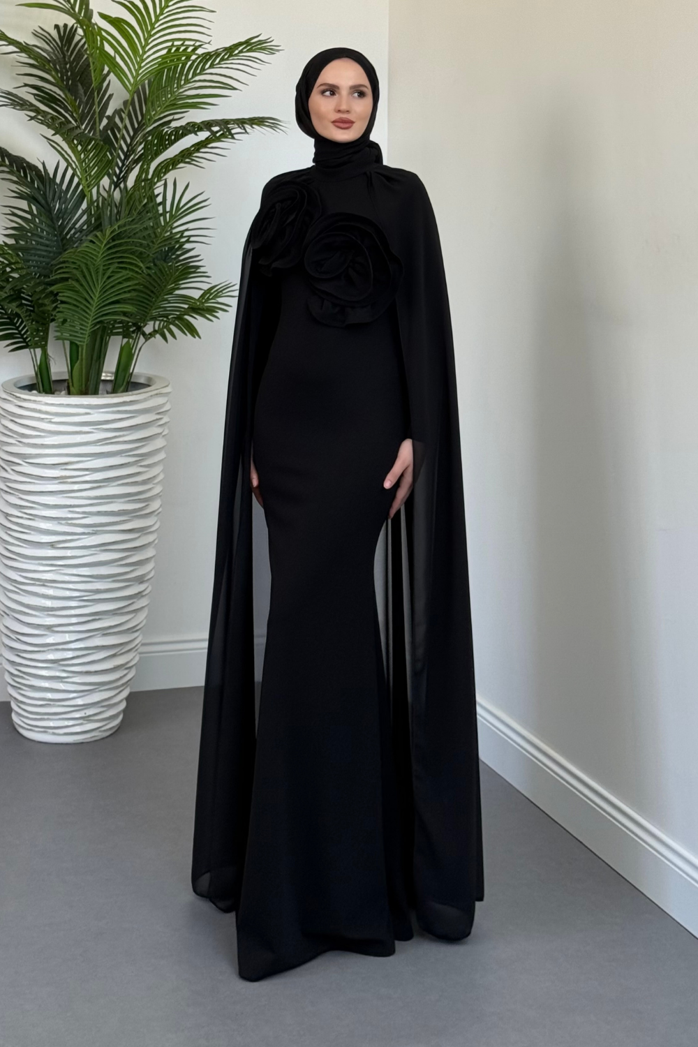 Lineaa Gül Detay Pelerinli Abiye Siyah