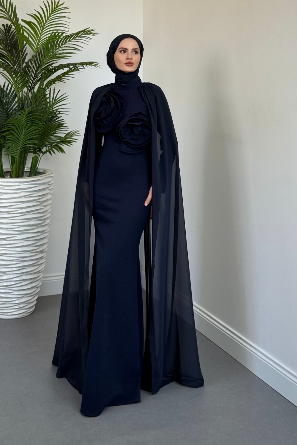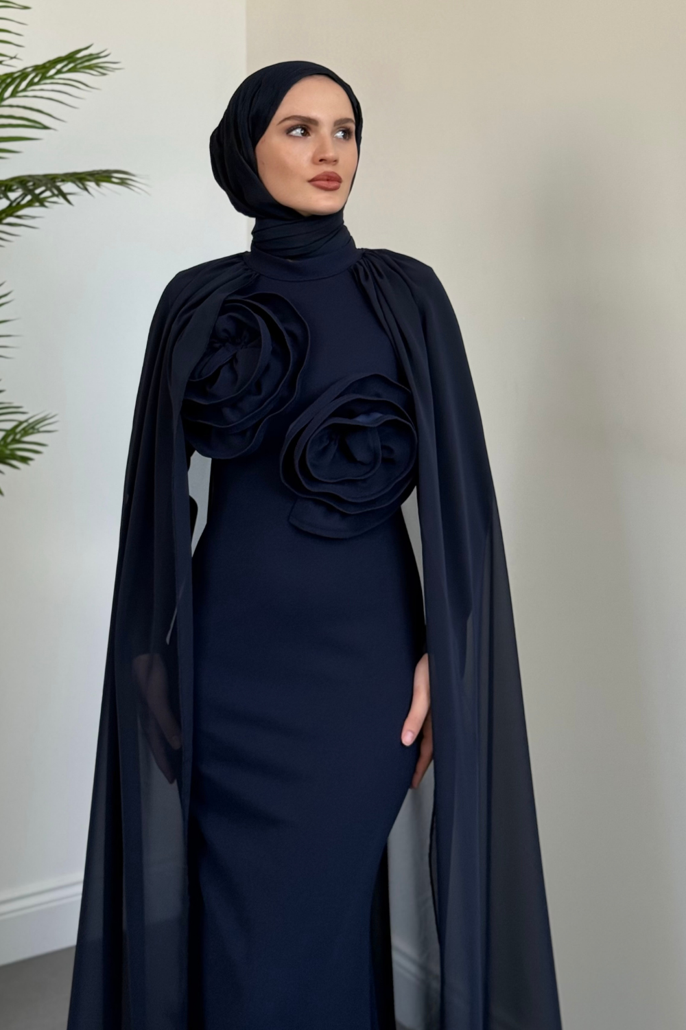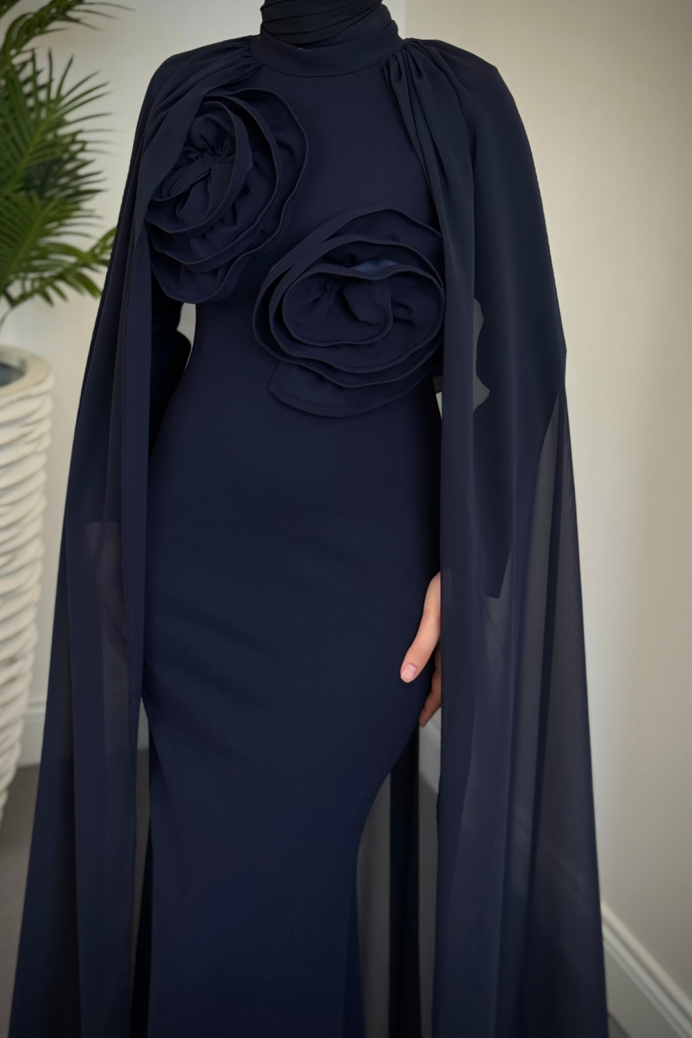 Lineaa Gül Detay Pelerinli Abiye Lacivert