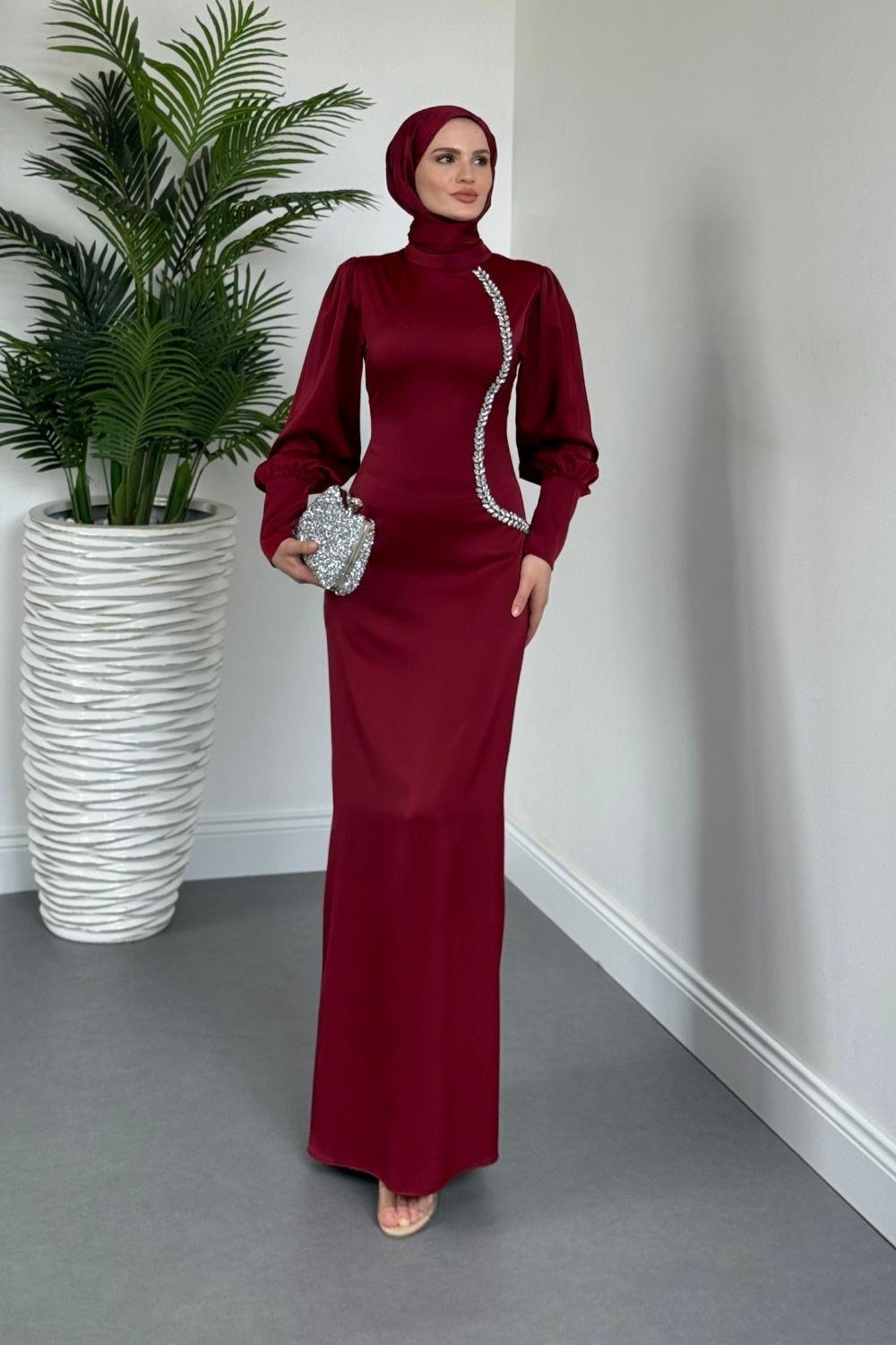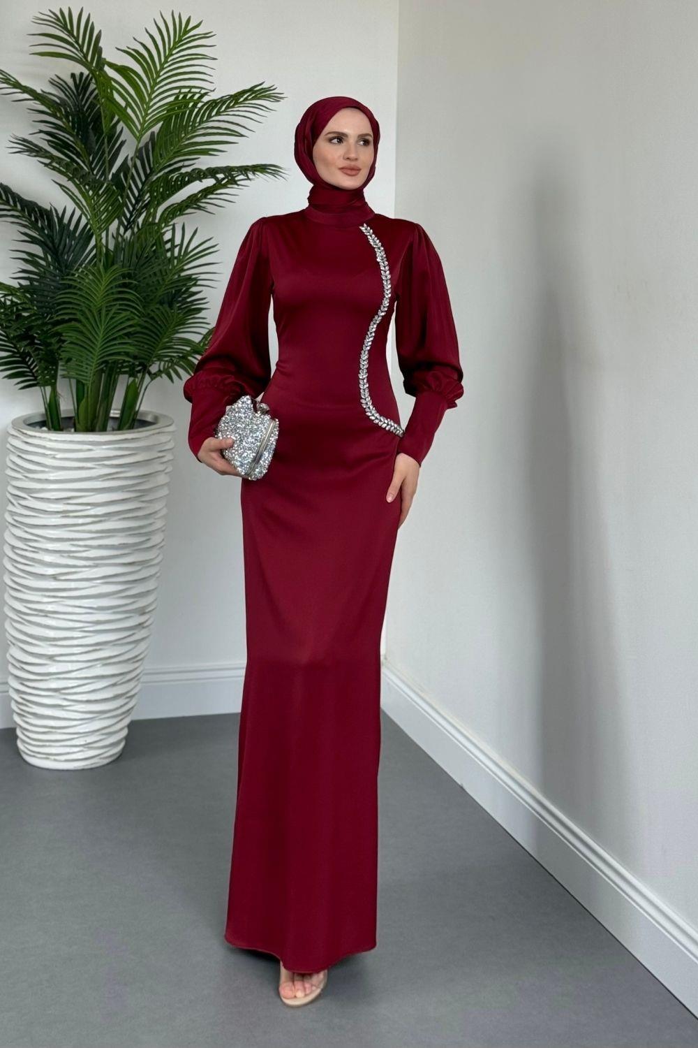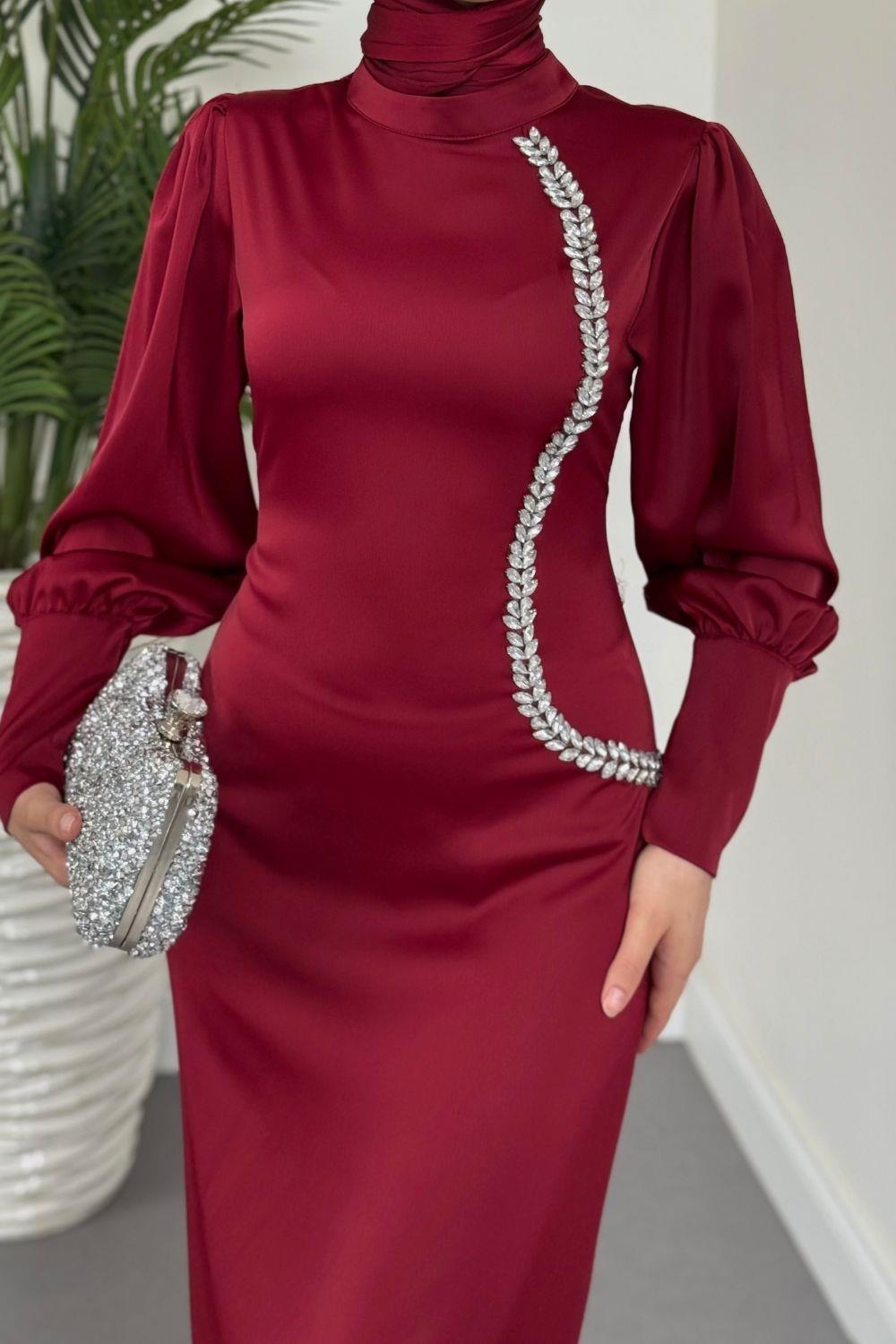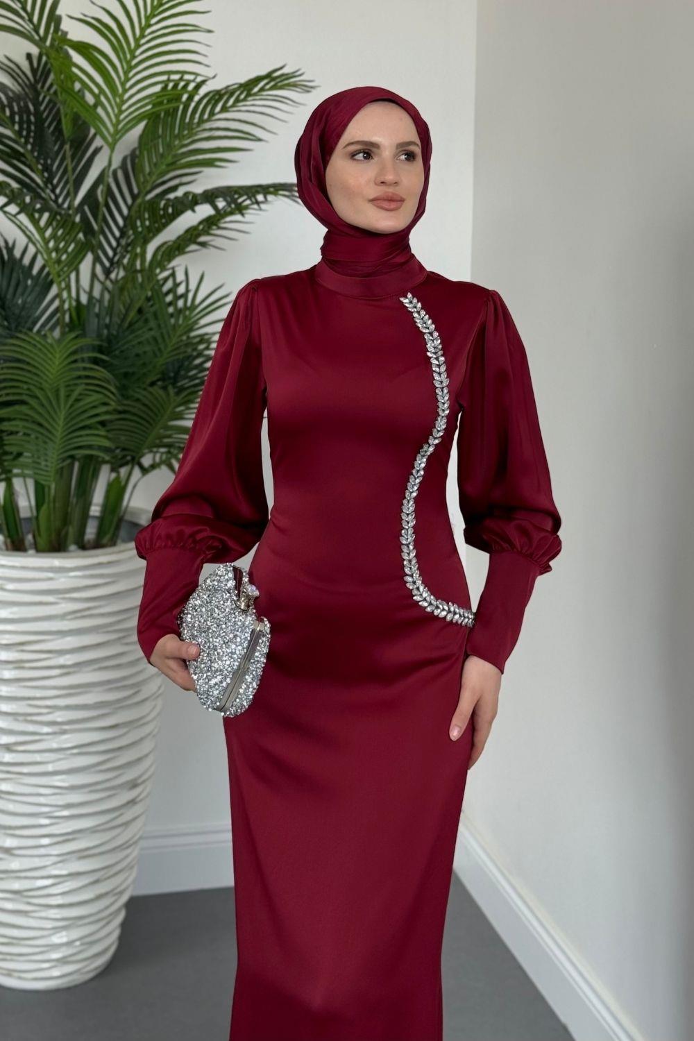 Nigina Yandan Taşlı Kalem Abiye Bordo