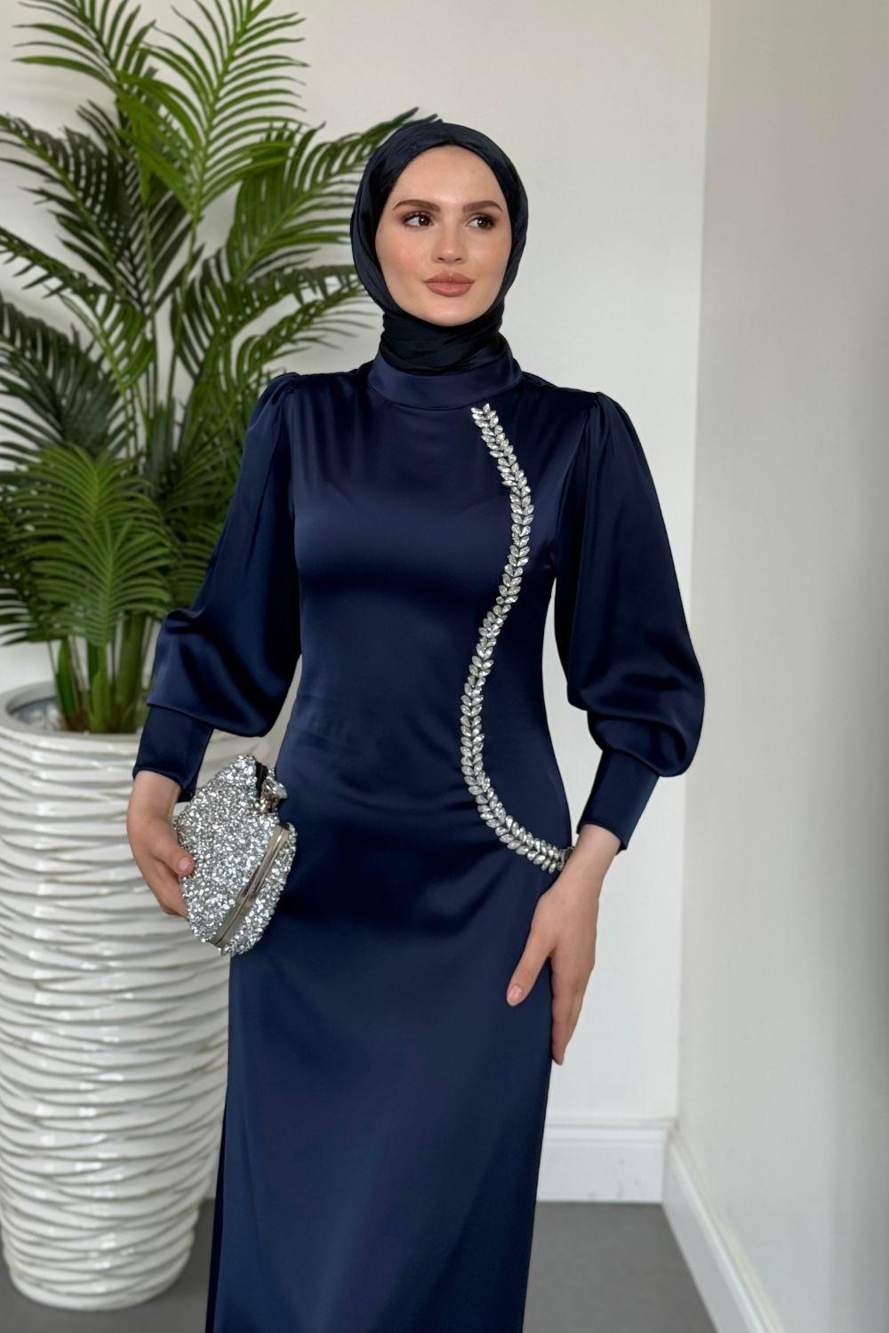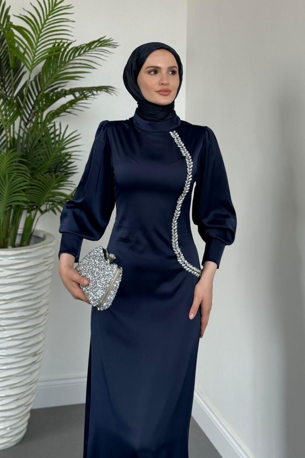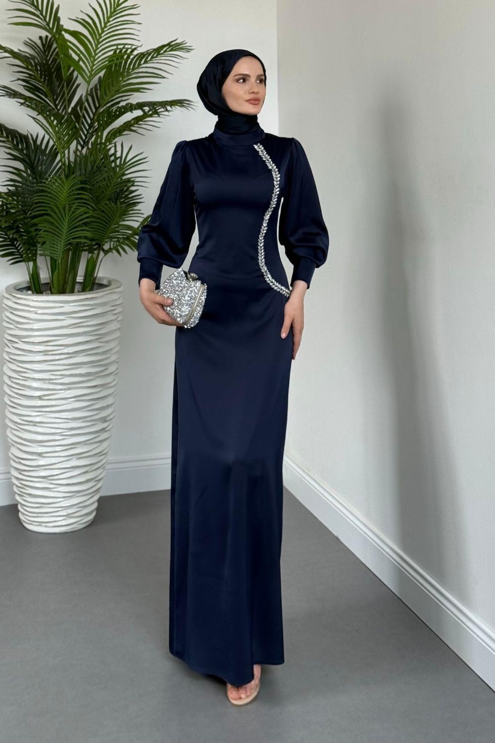 Nigina Yandan Taşlı Kalem Abiye Lacivert