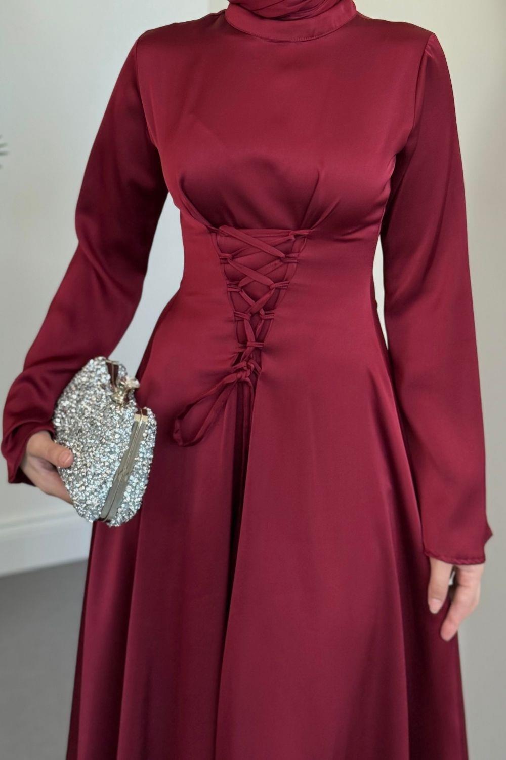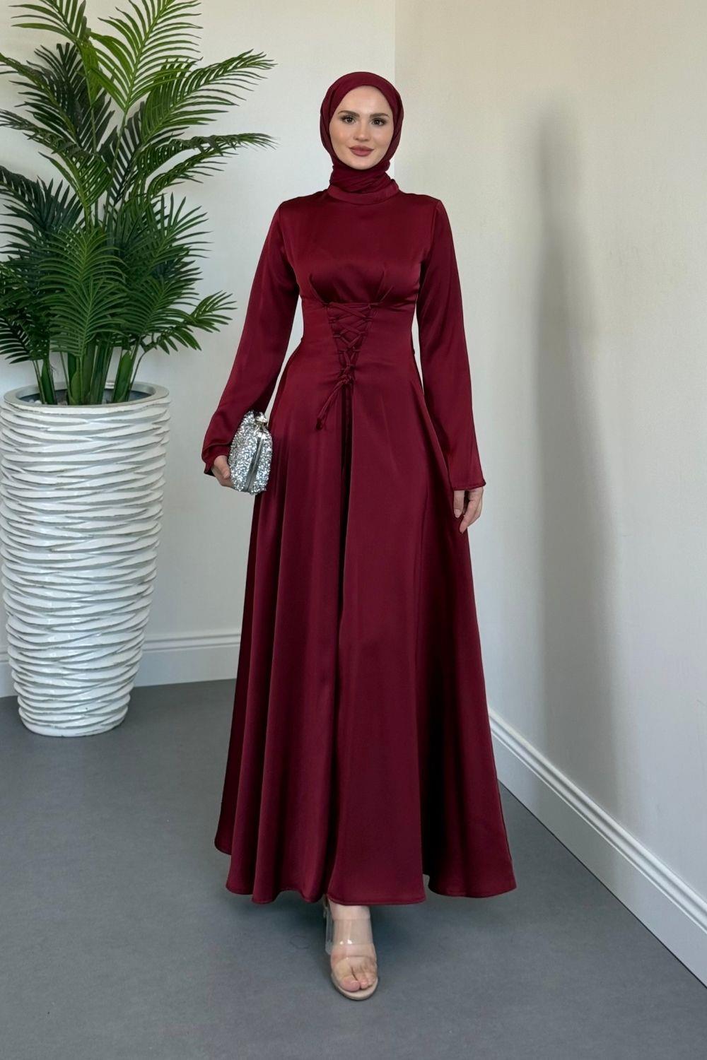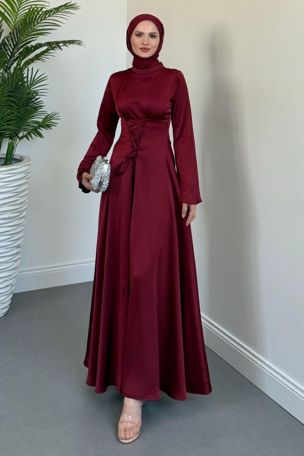 Briva Önden Bağlama Saten Abiye Bordo