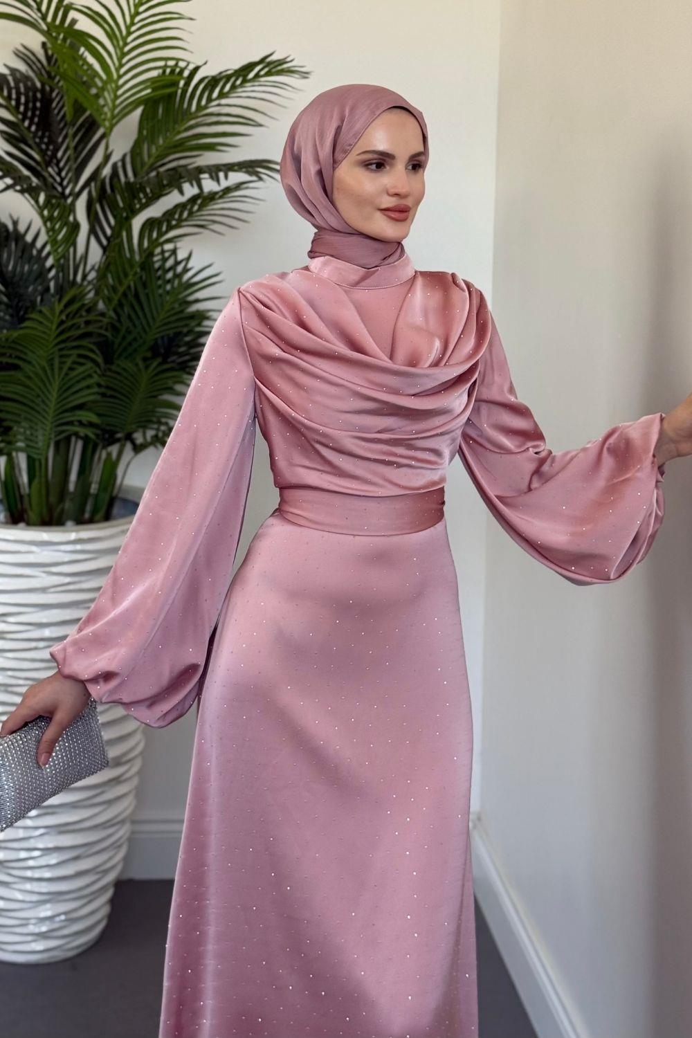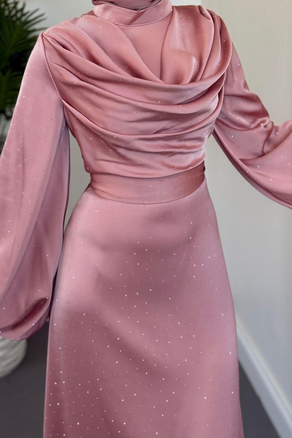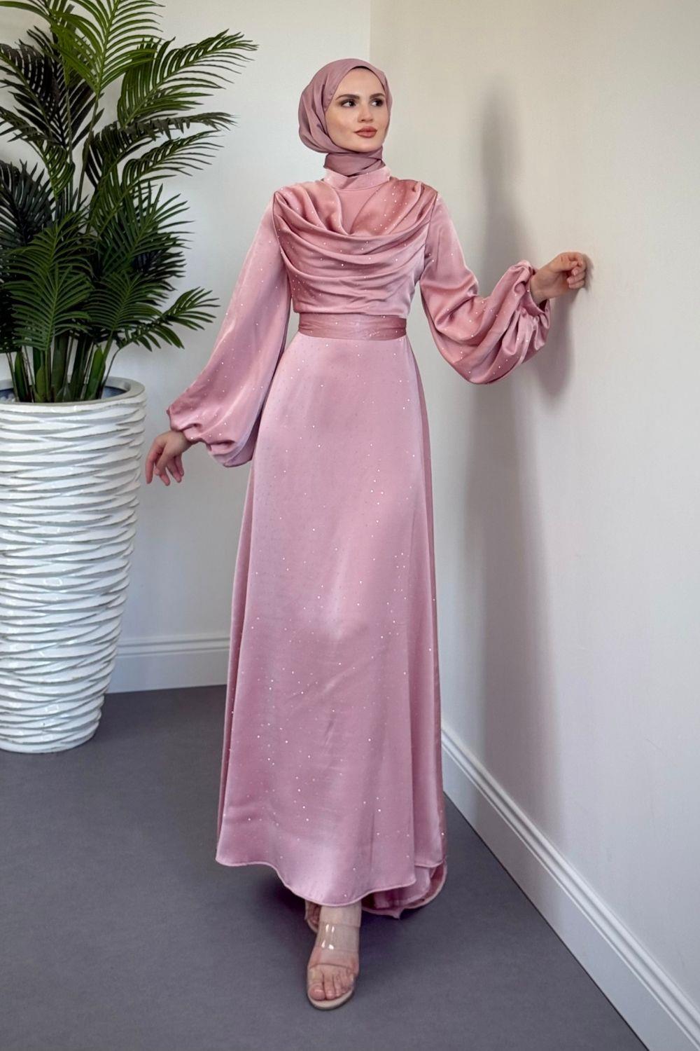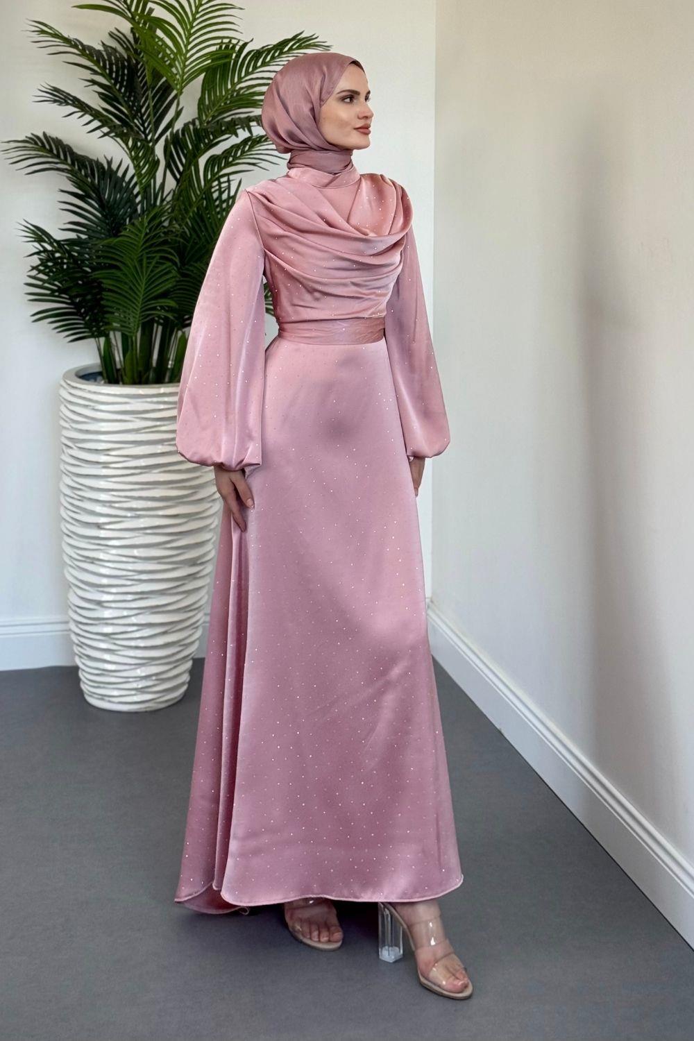 Areka Taşlı Kuyruklu Degaje Yaka Abiye Pudra