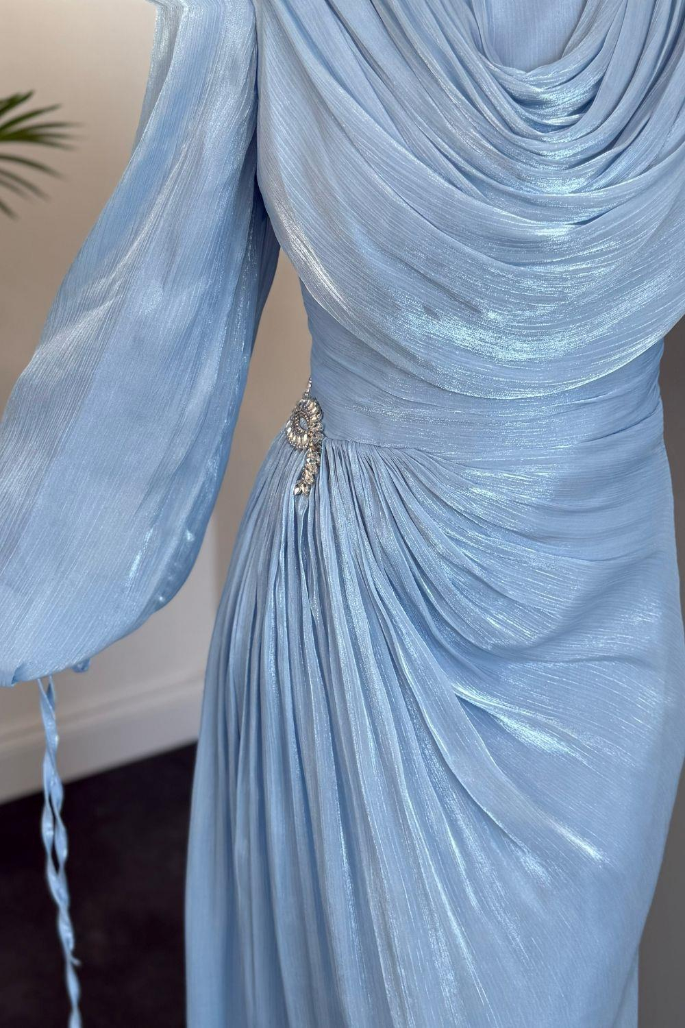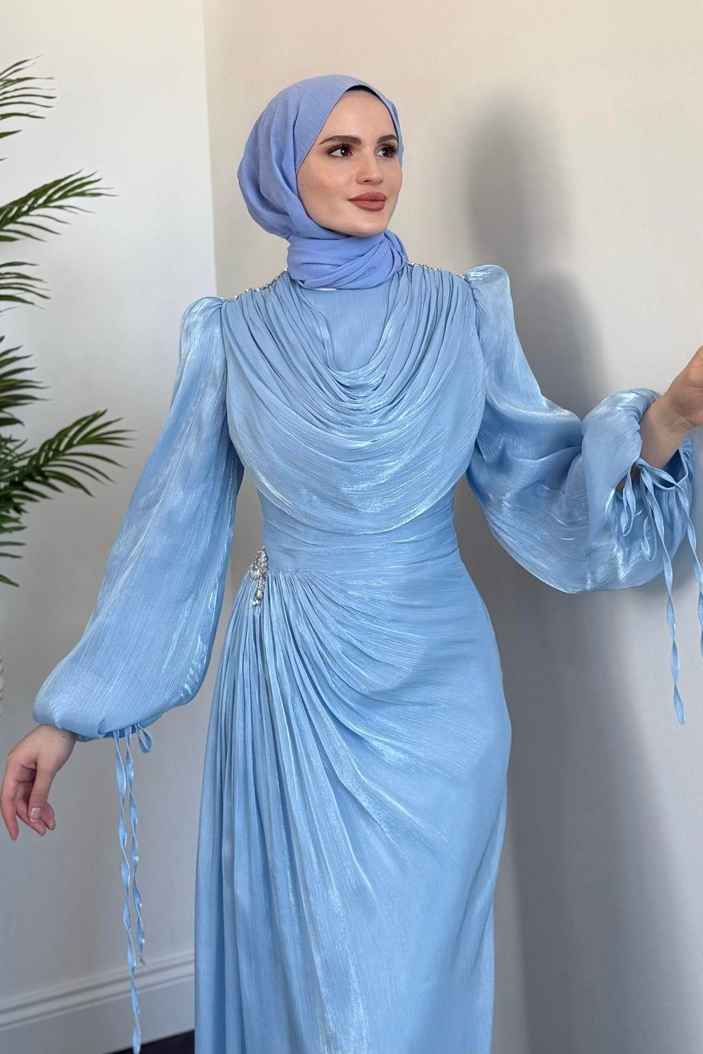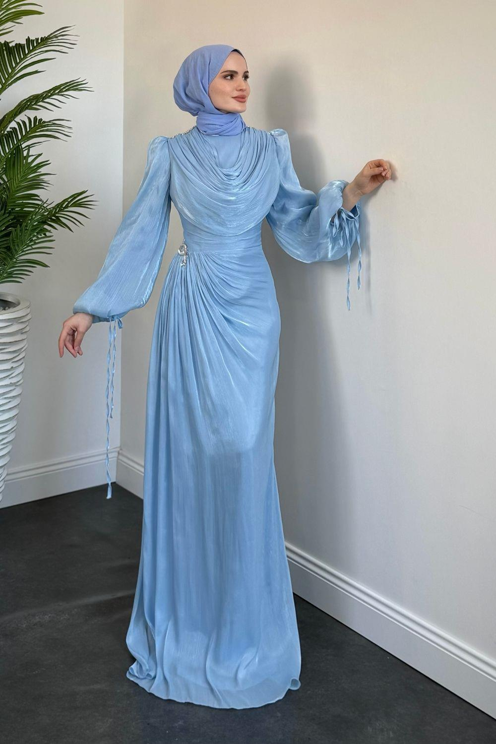 Jenika Omzu Ve Beli Taşlı Abiye Bebe Mavisi