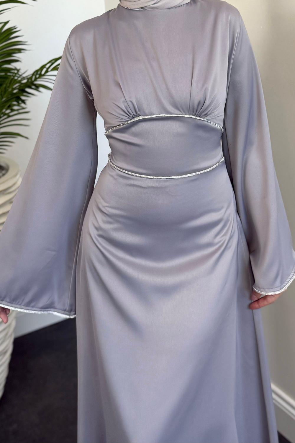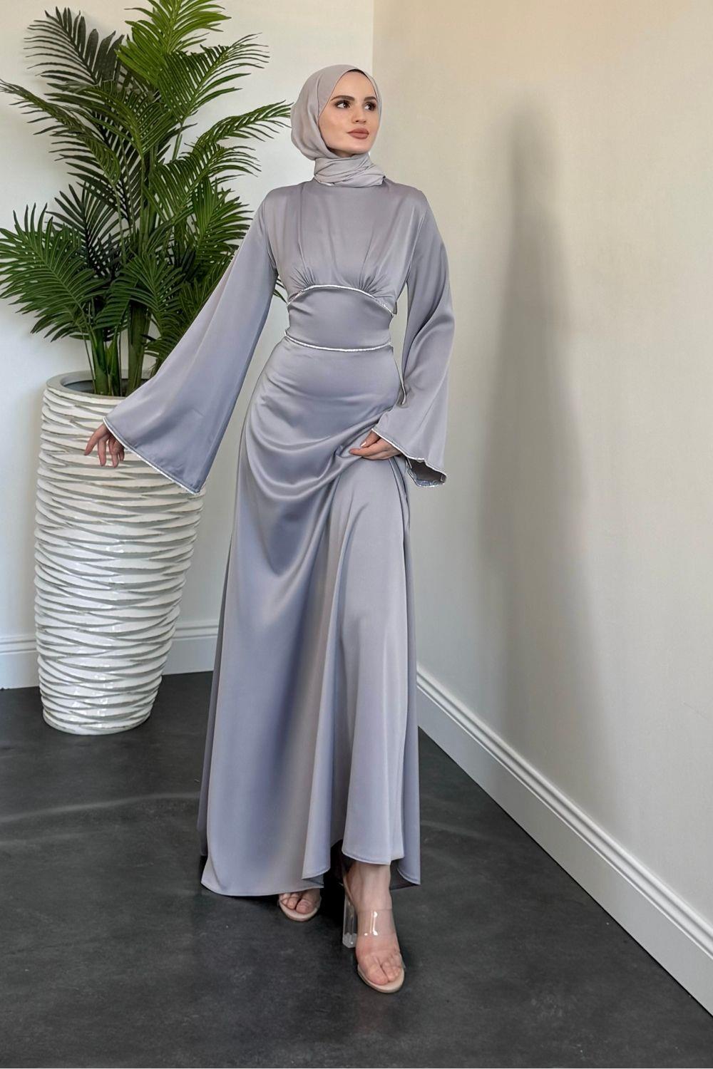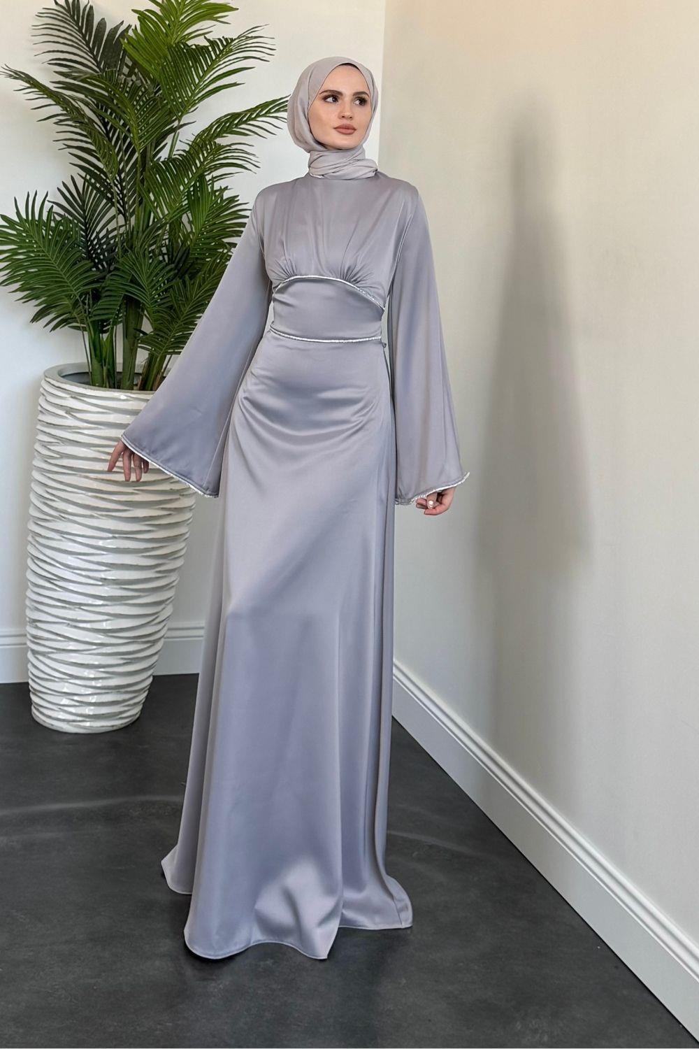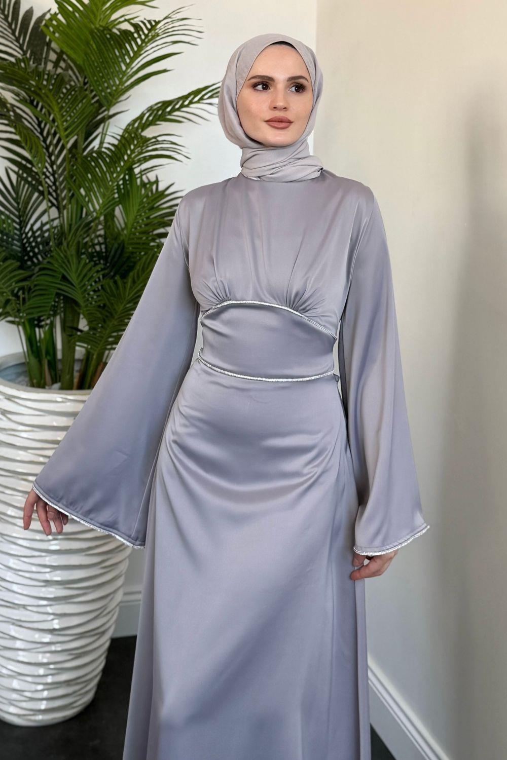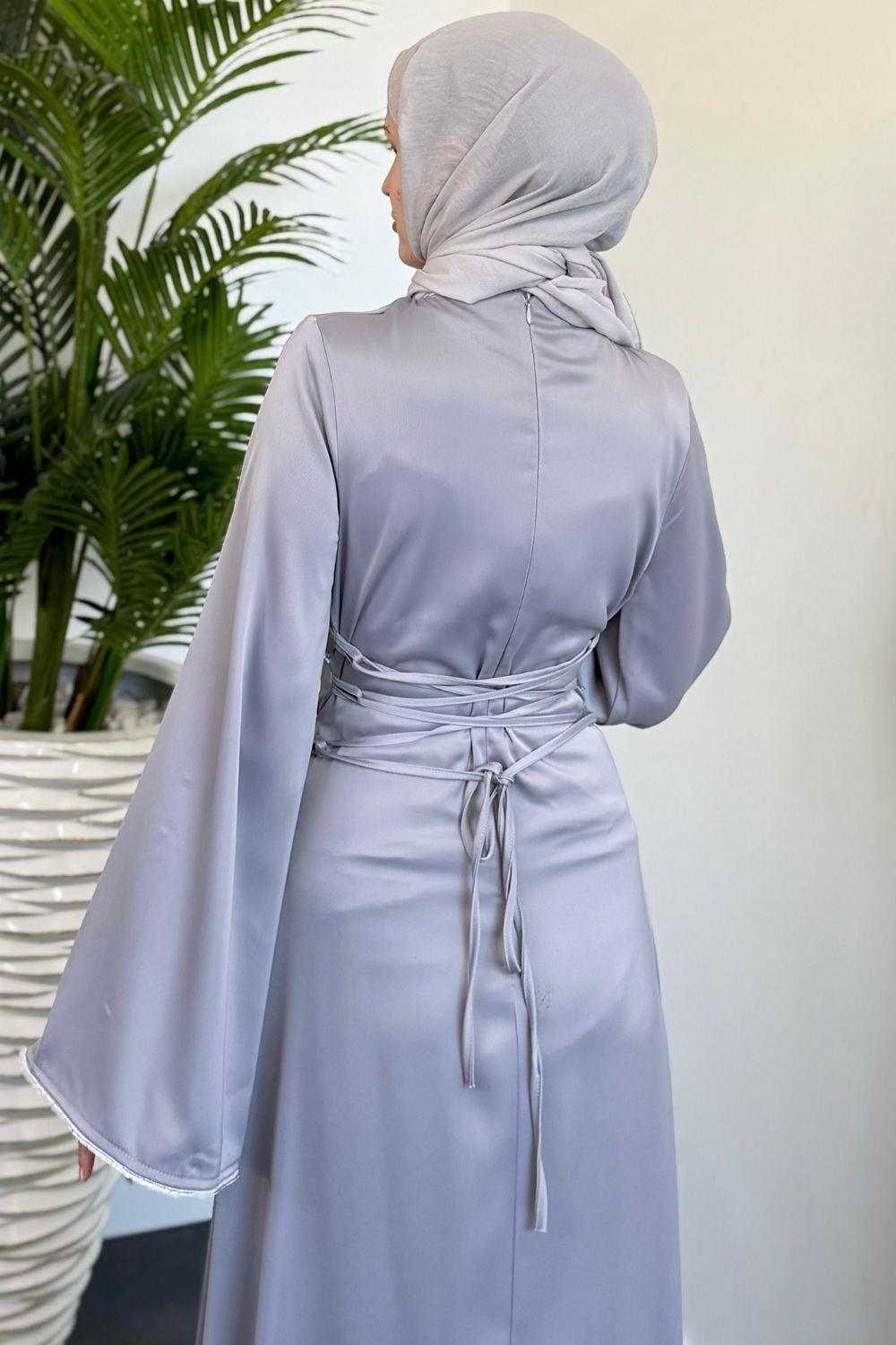 Vlasi Kolu Ve Beli Baget Taşlı Saten Abiye Gri