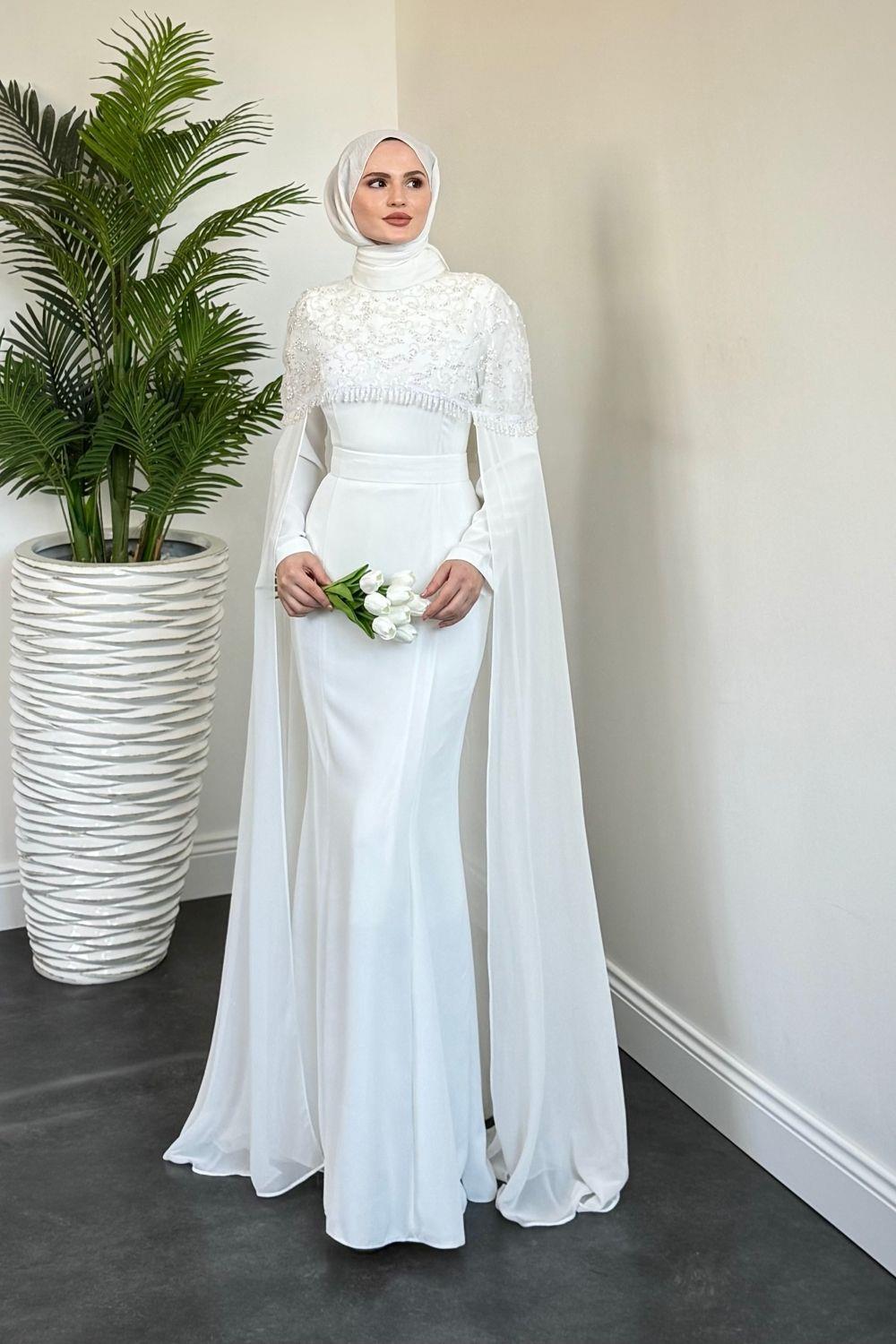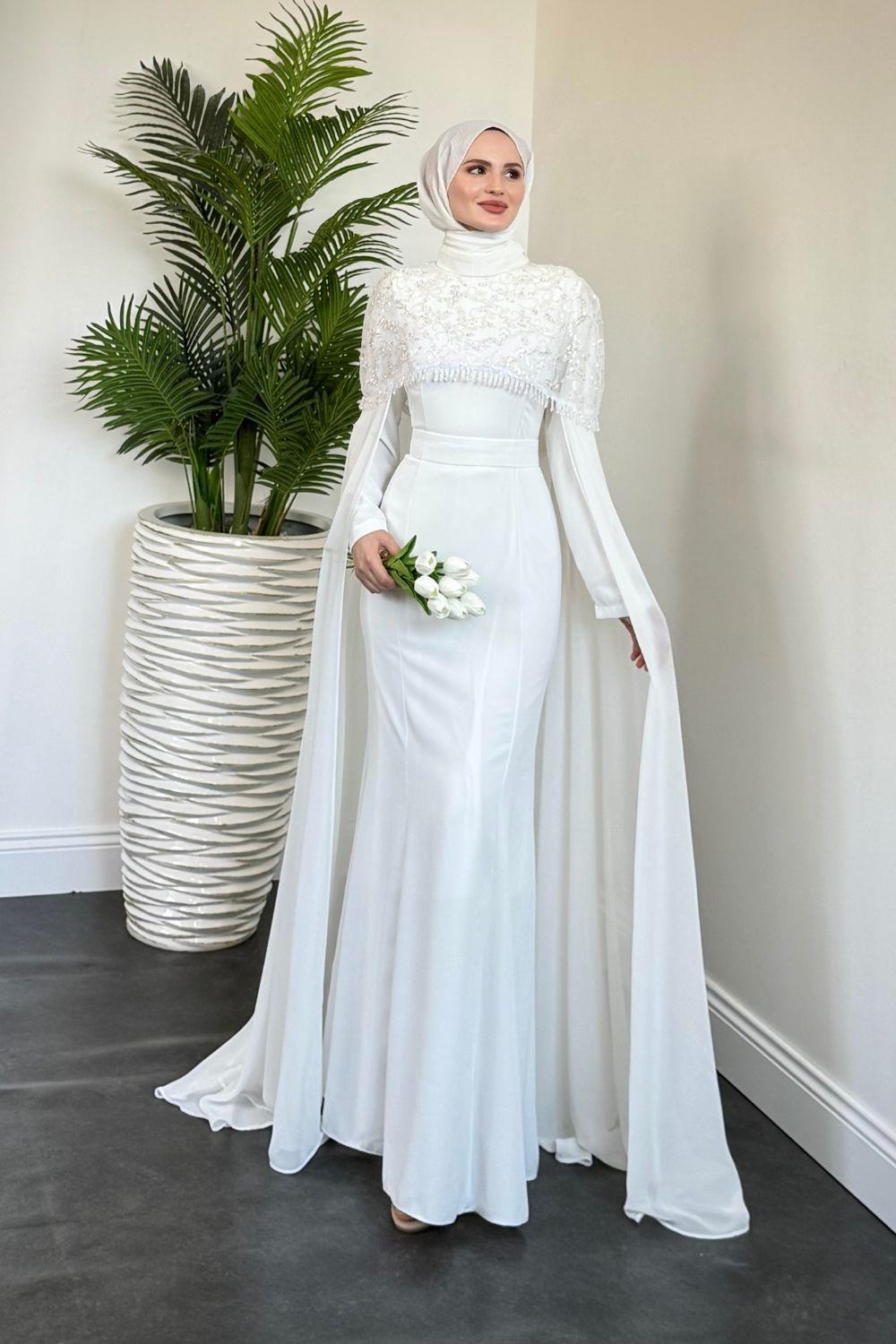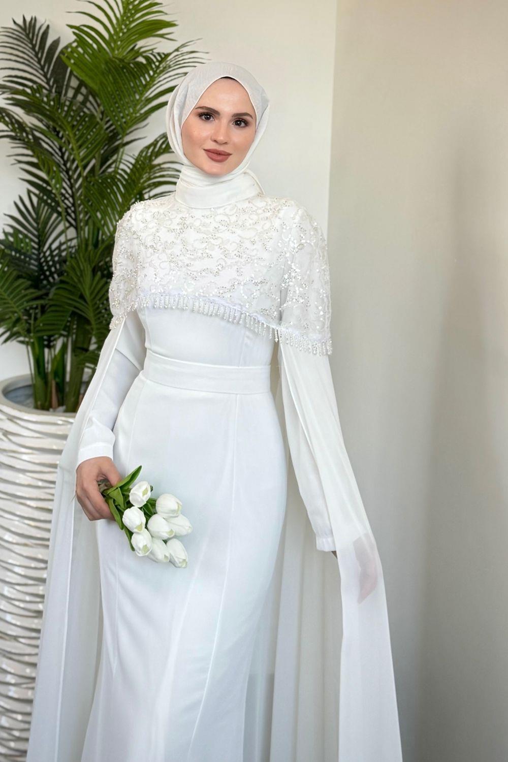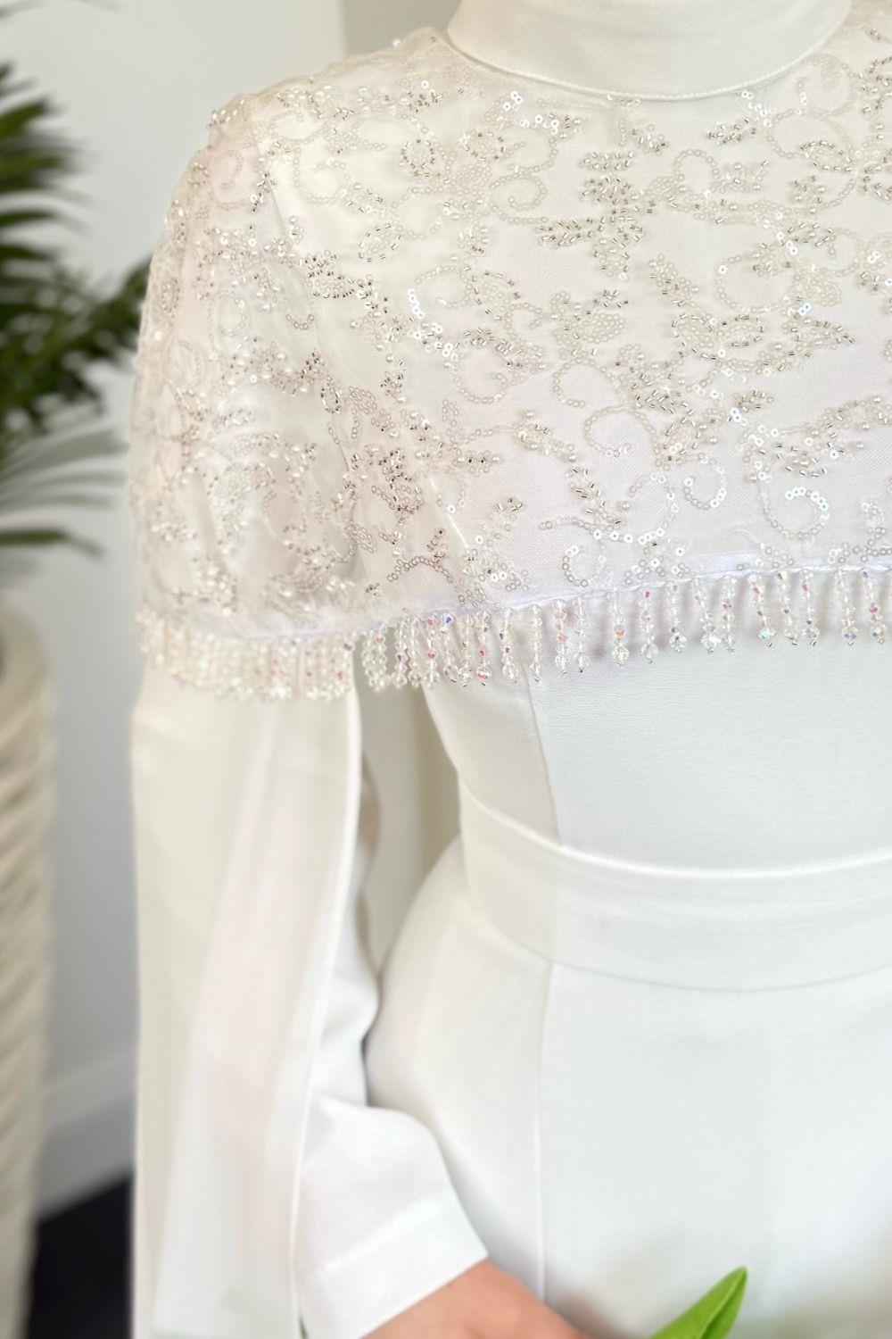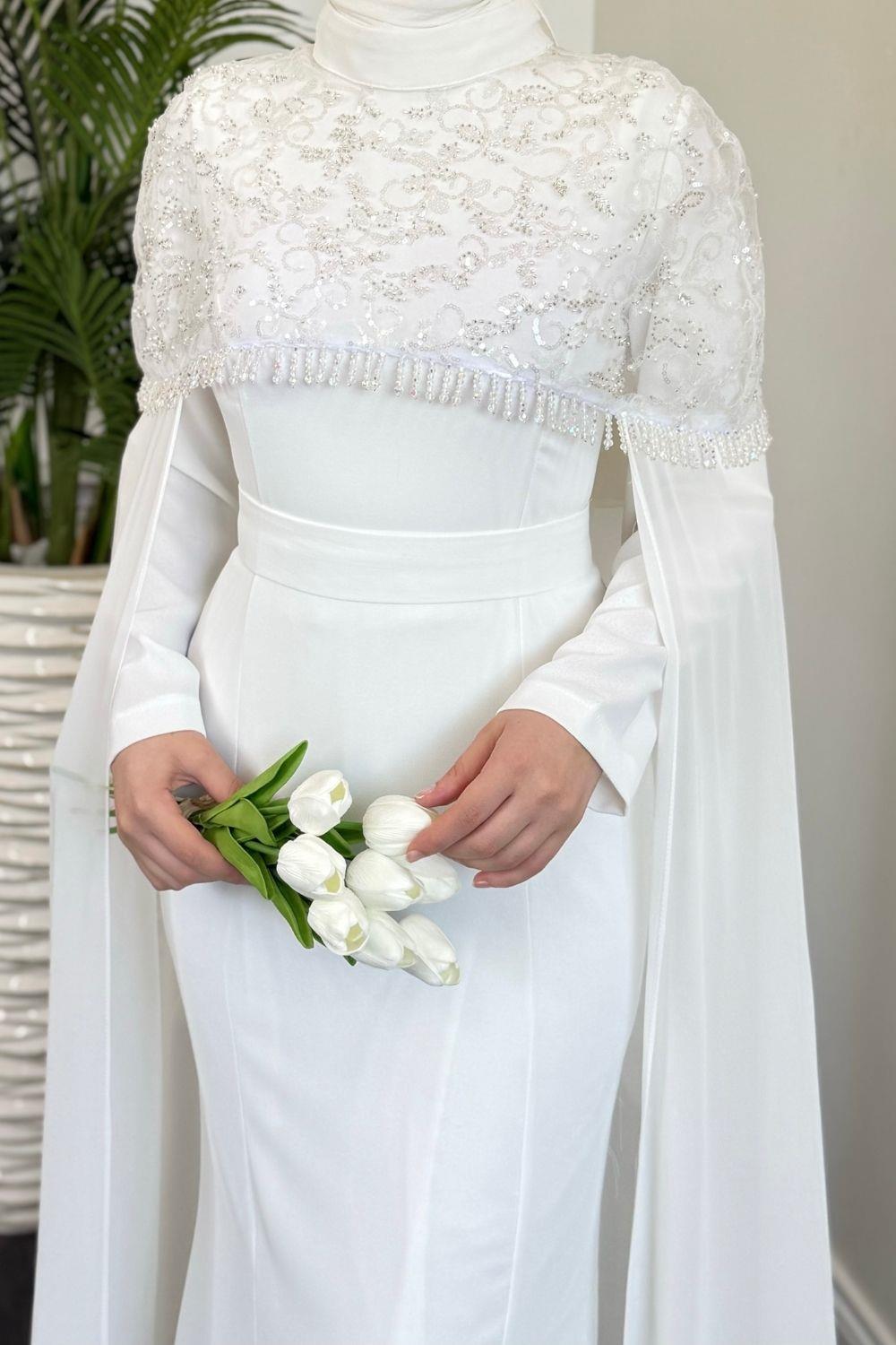 Alida Üstü Boncuk Pelerinli Abiye Beyaz