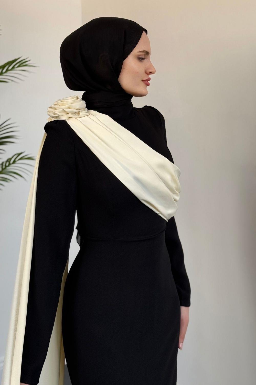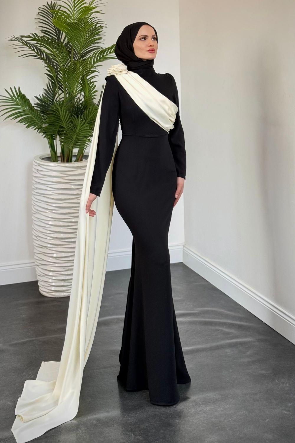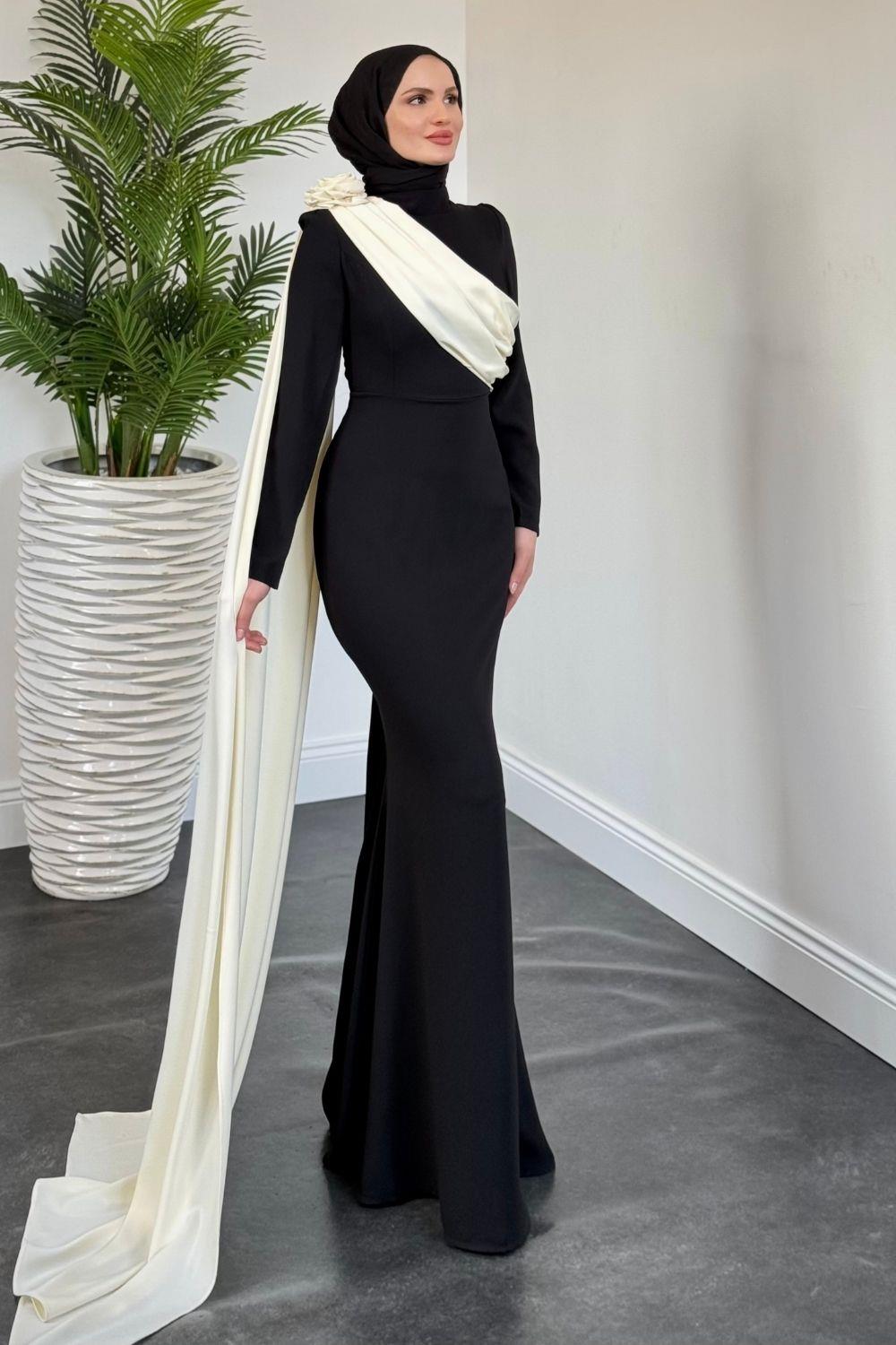 Castilya Pelerinli Omzu Gül Abiye Siyah (Krem Pelerinli)