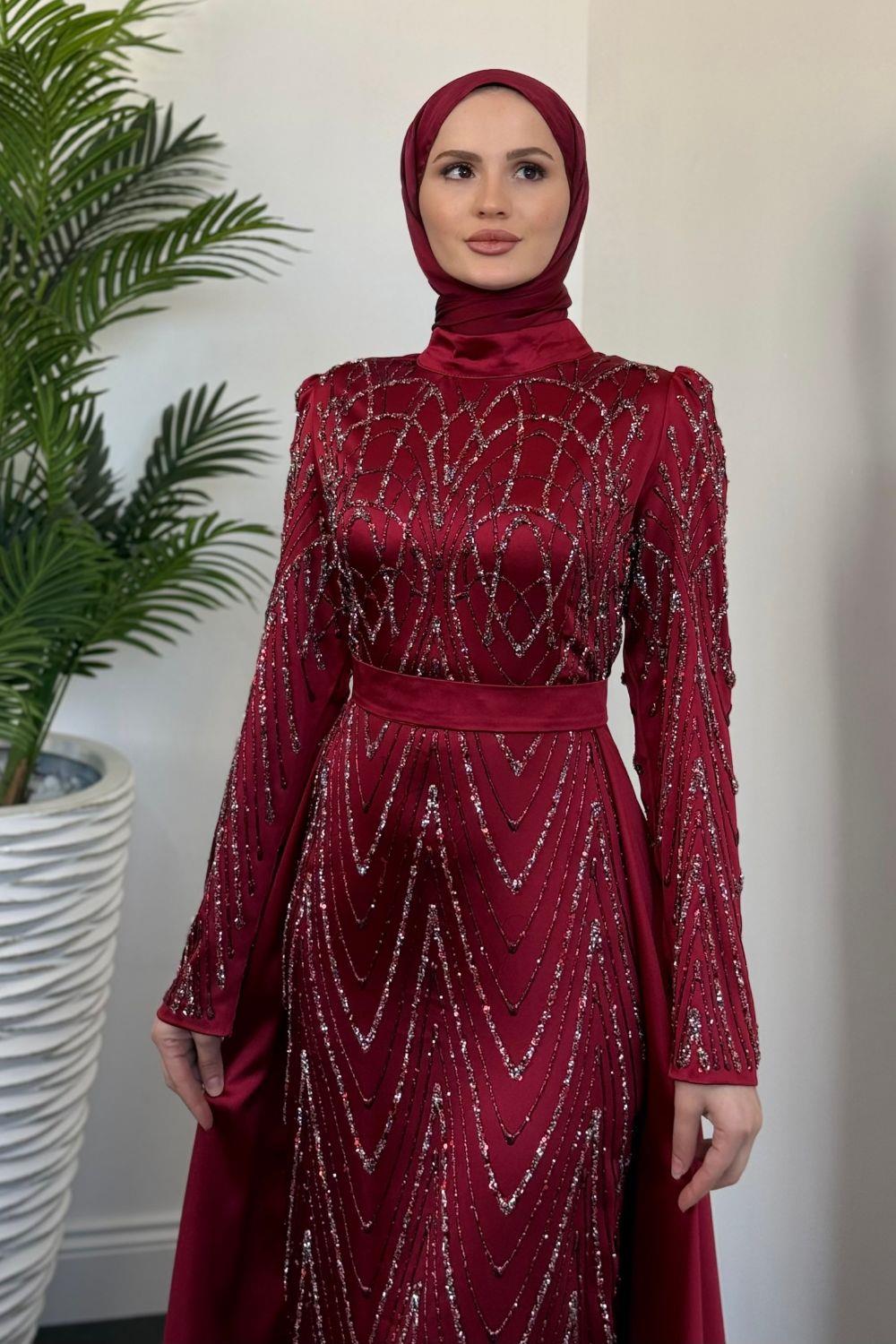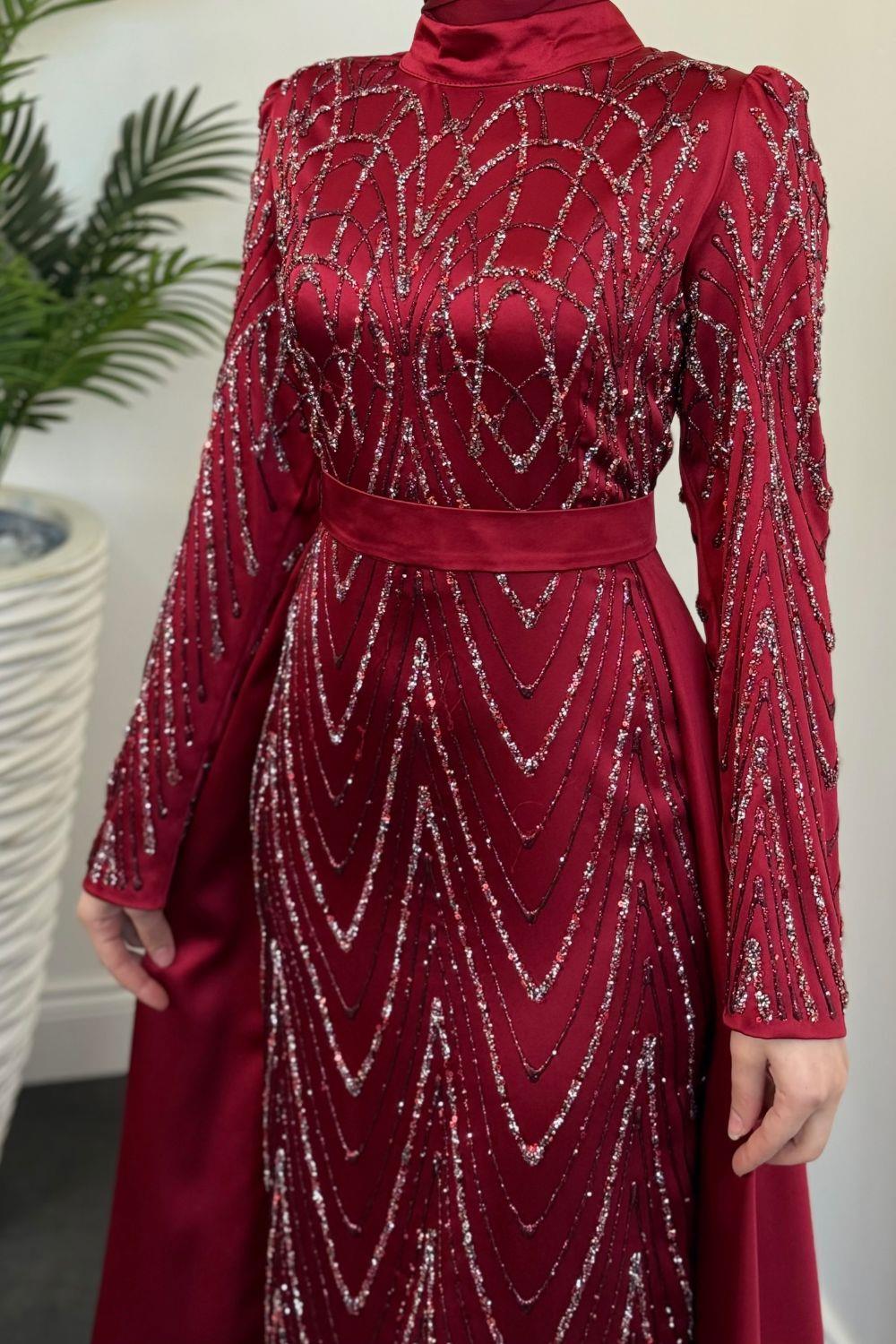 Katy Pelerinli Simli Abiye Bordo