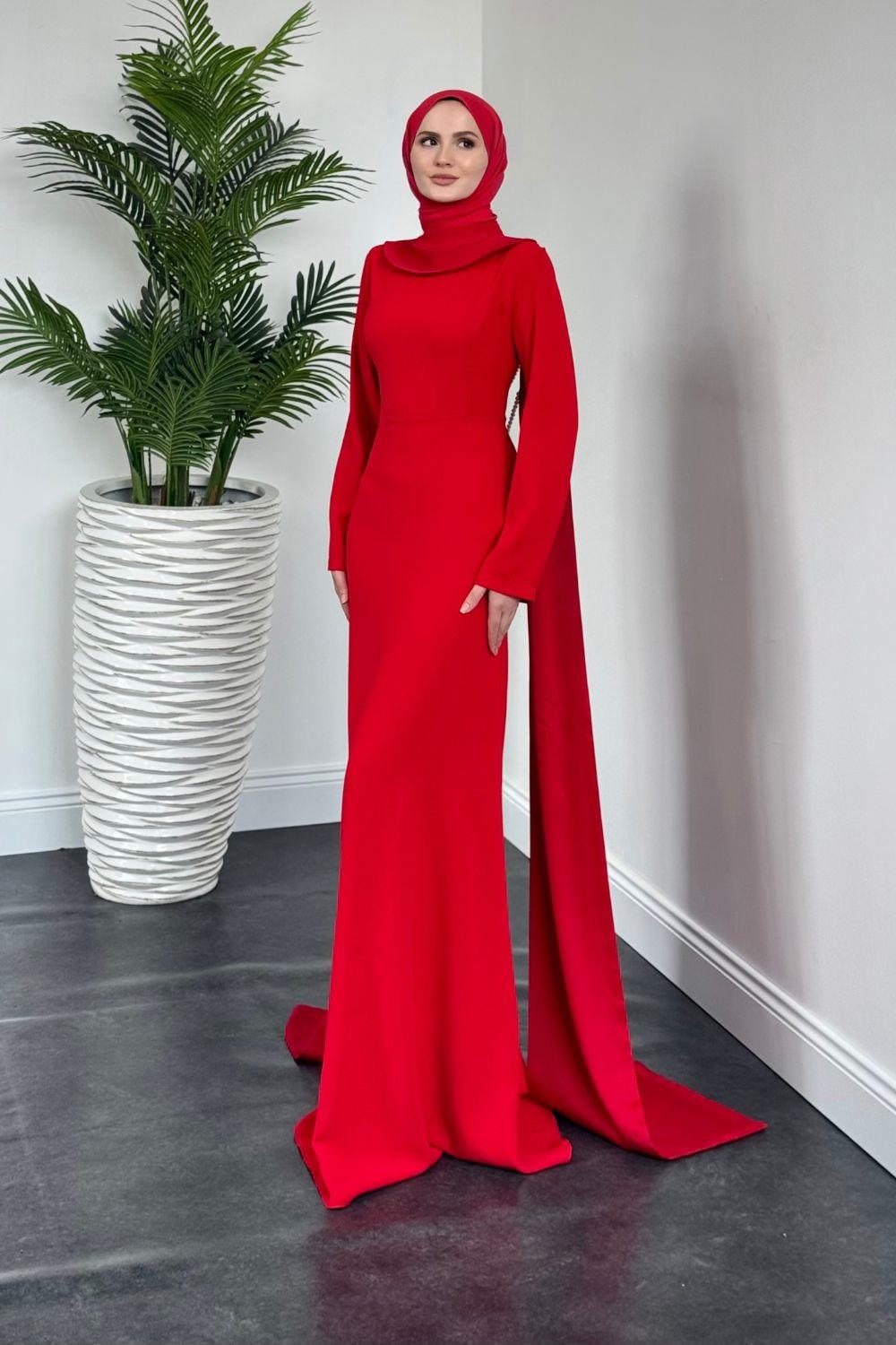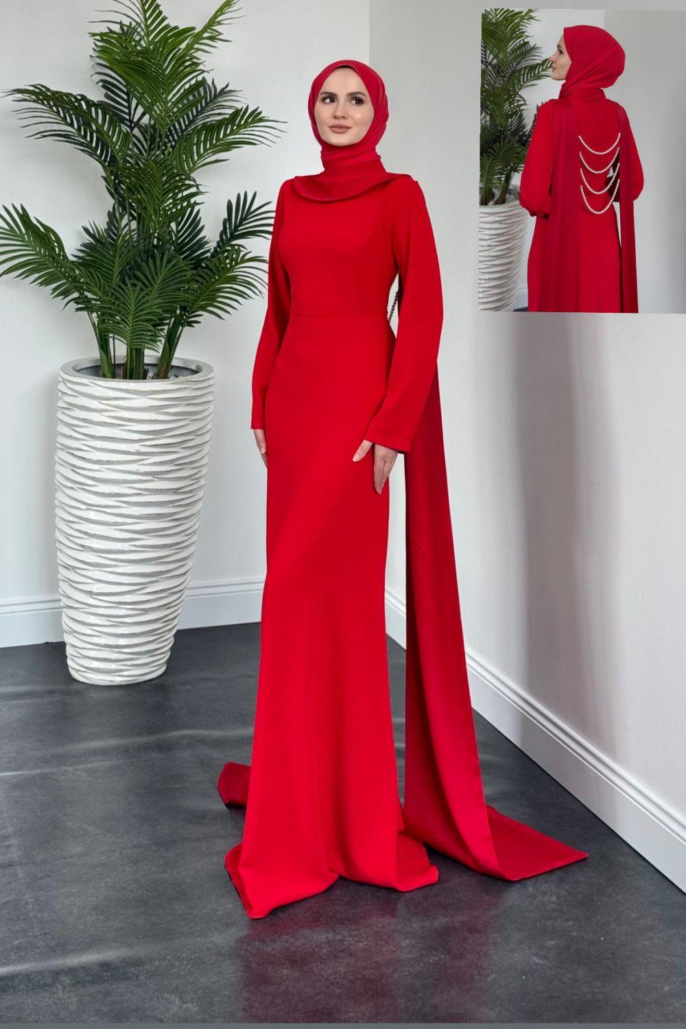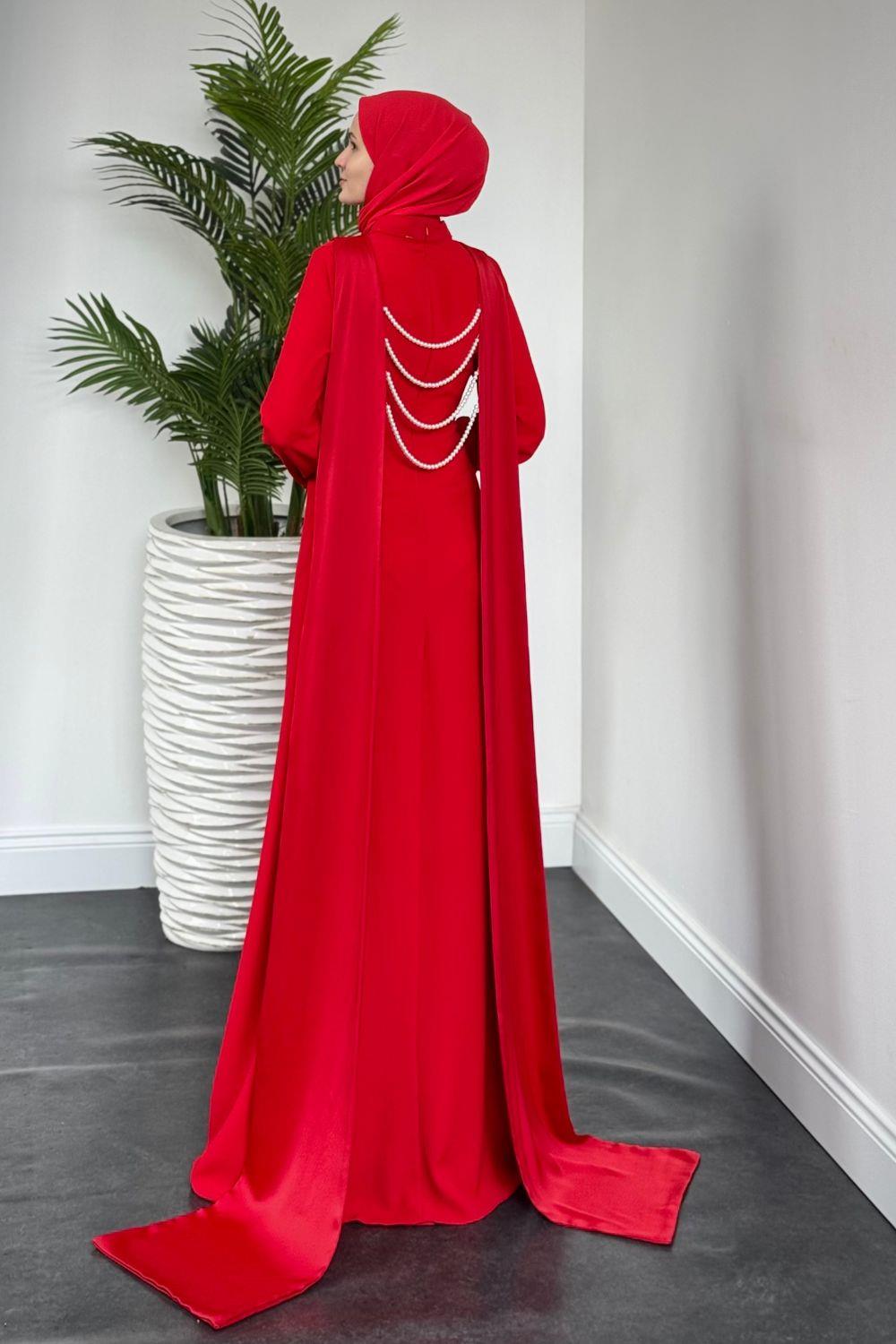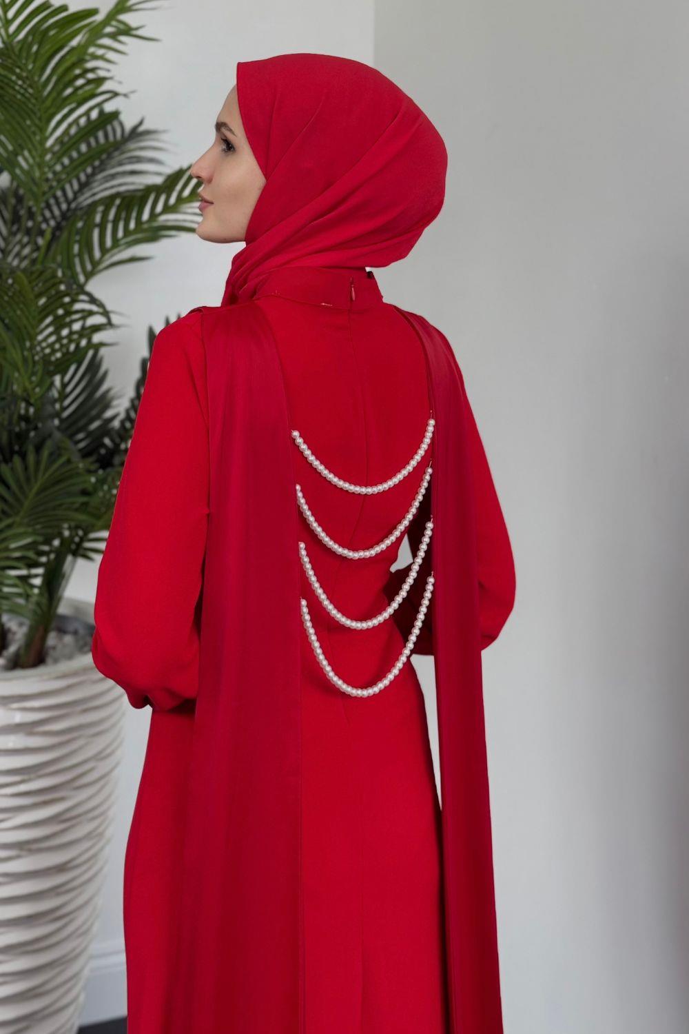 Agnes Arkası İnci Kolyeli Abiye Kırmızı