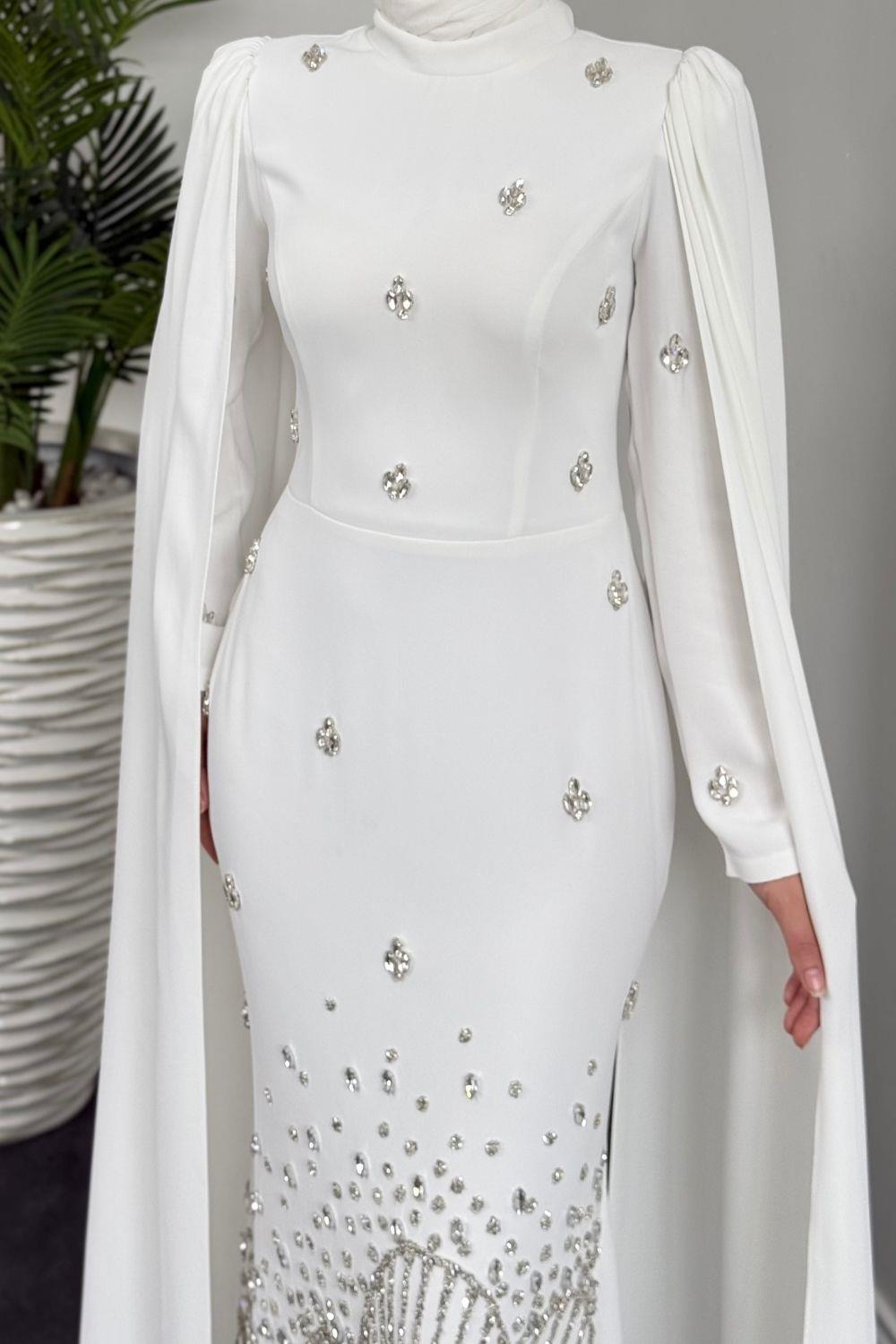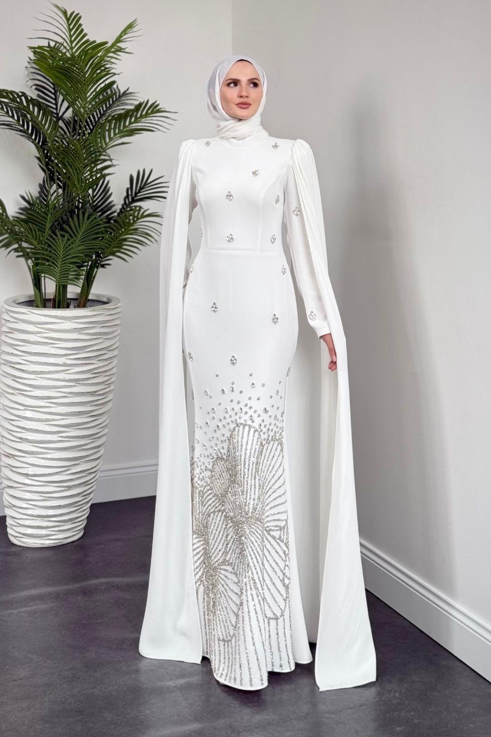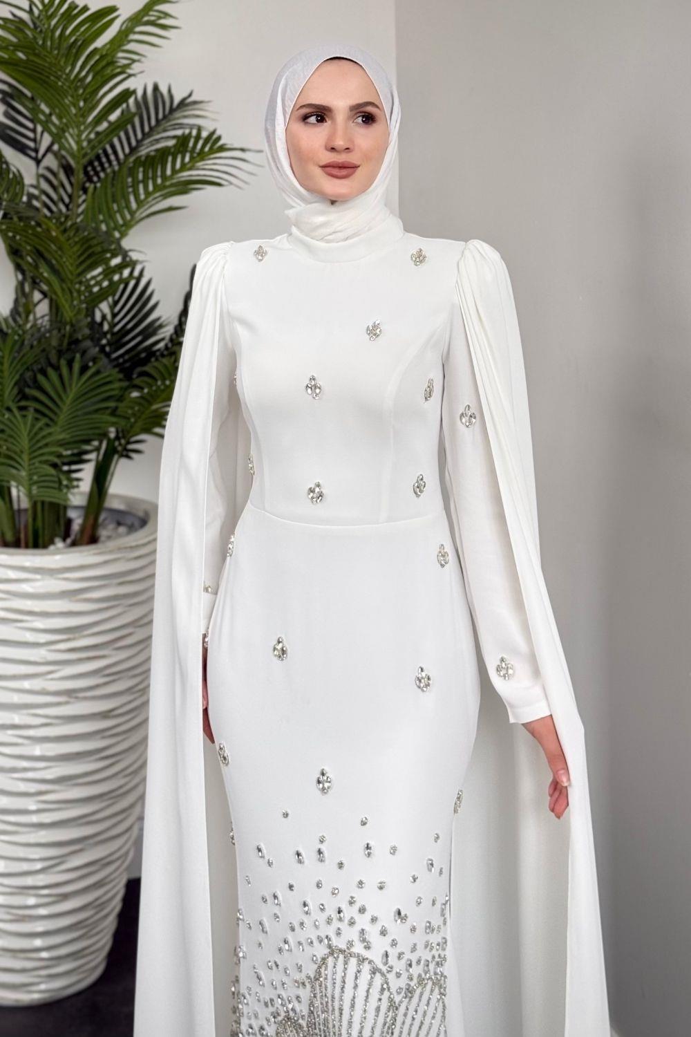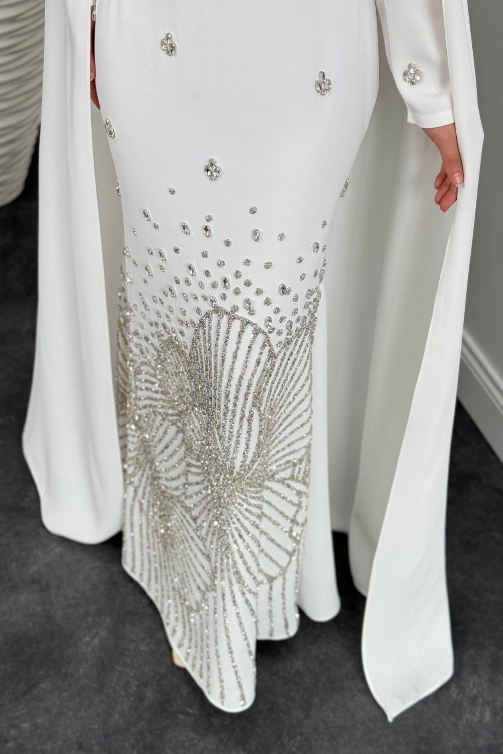 Farah Kolları Pelerinli Abiye Beyaz