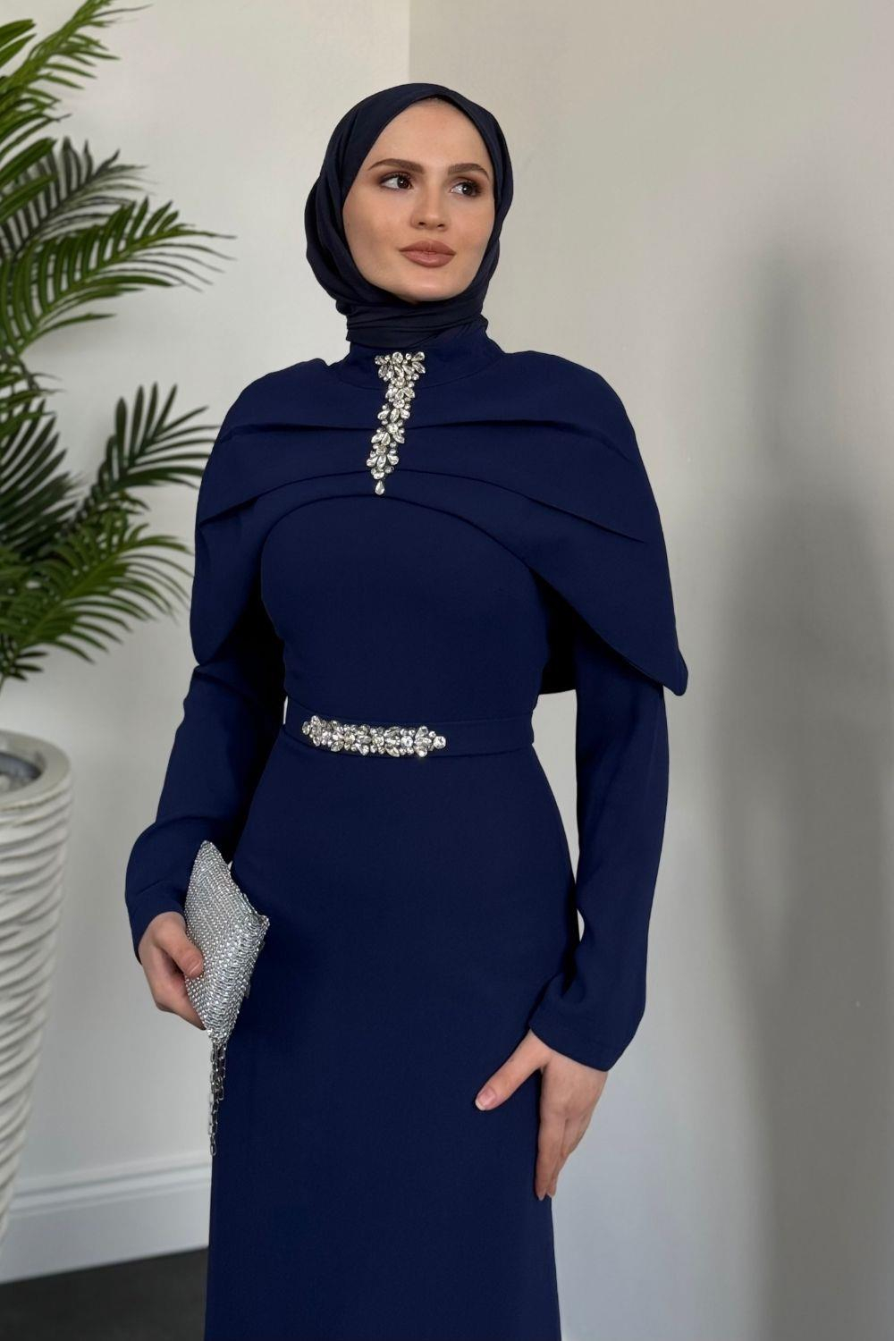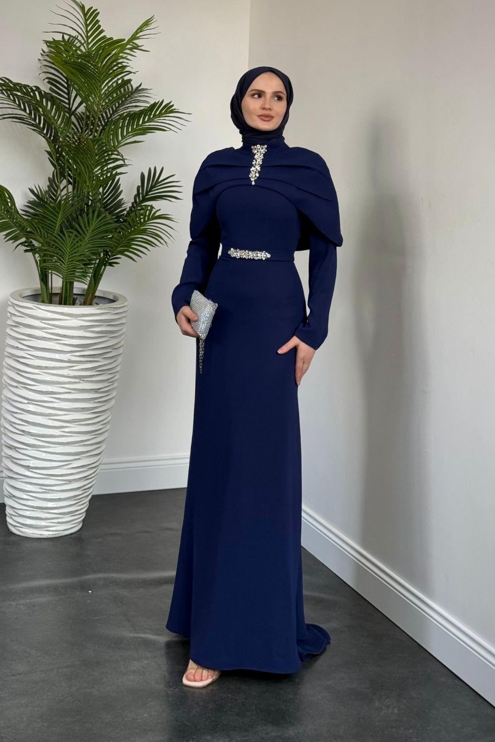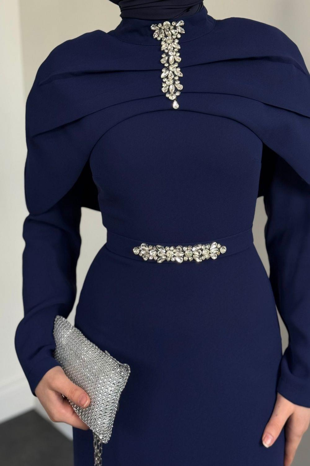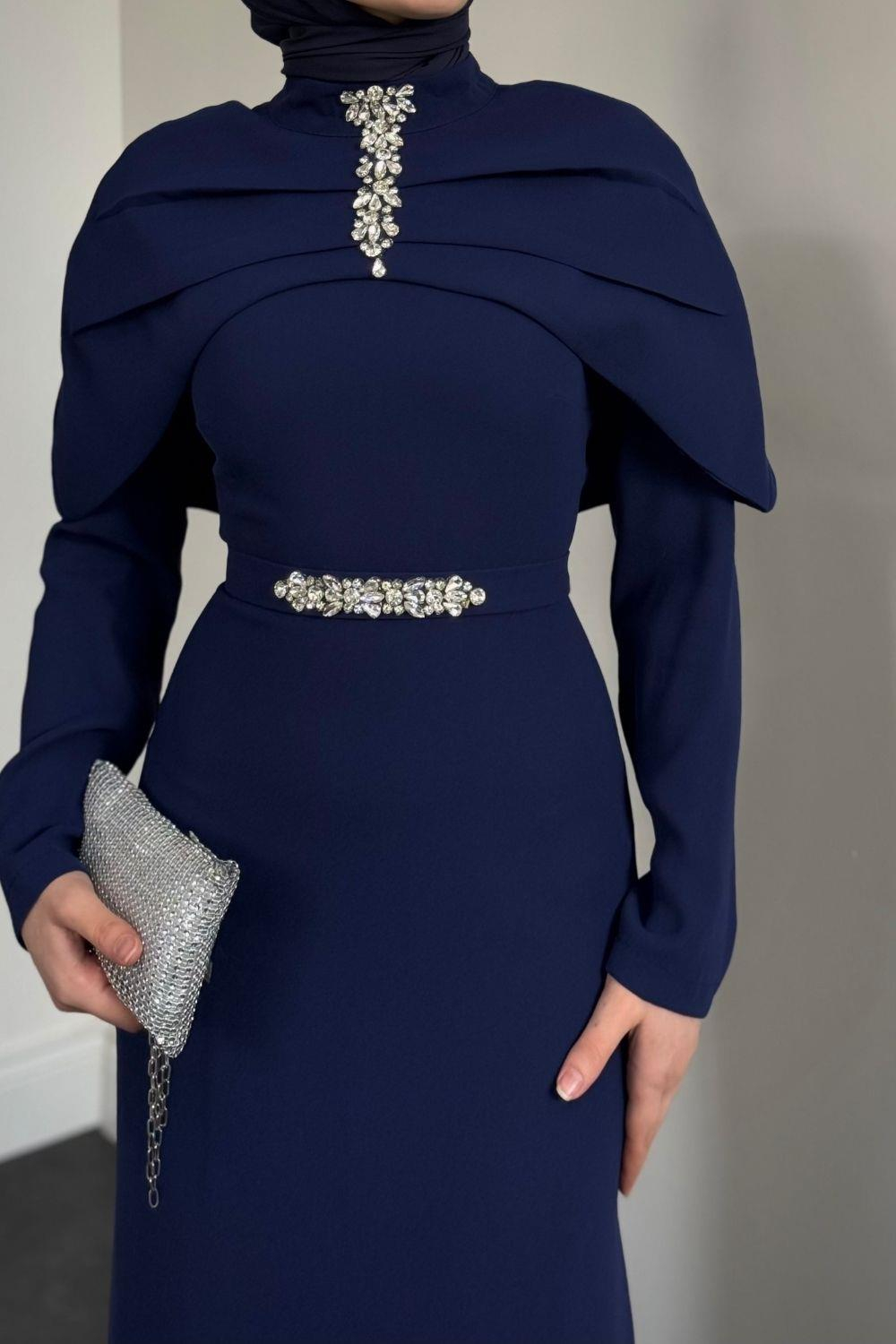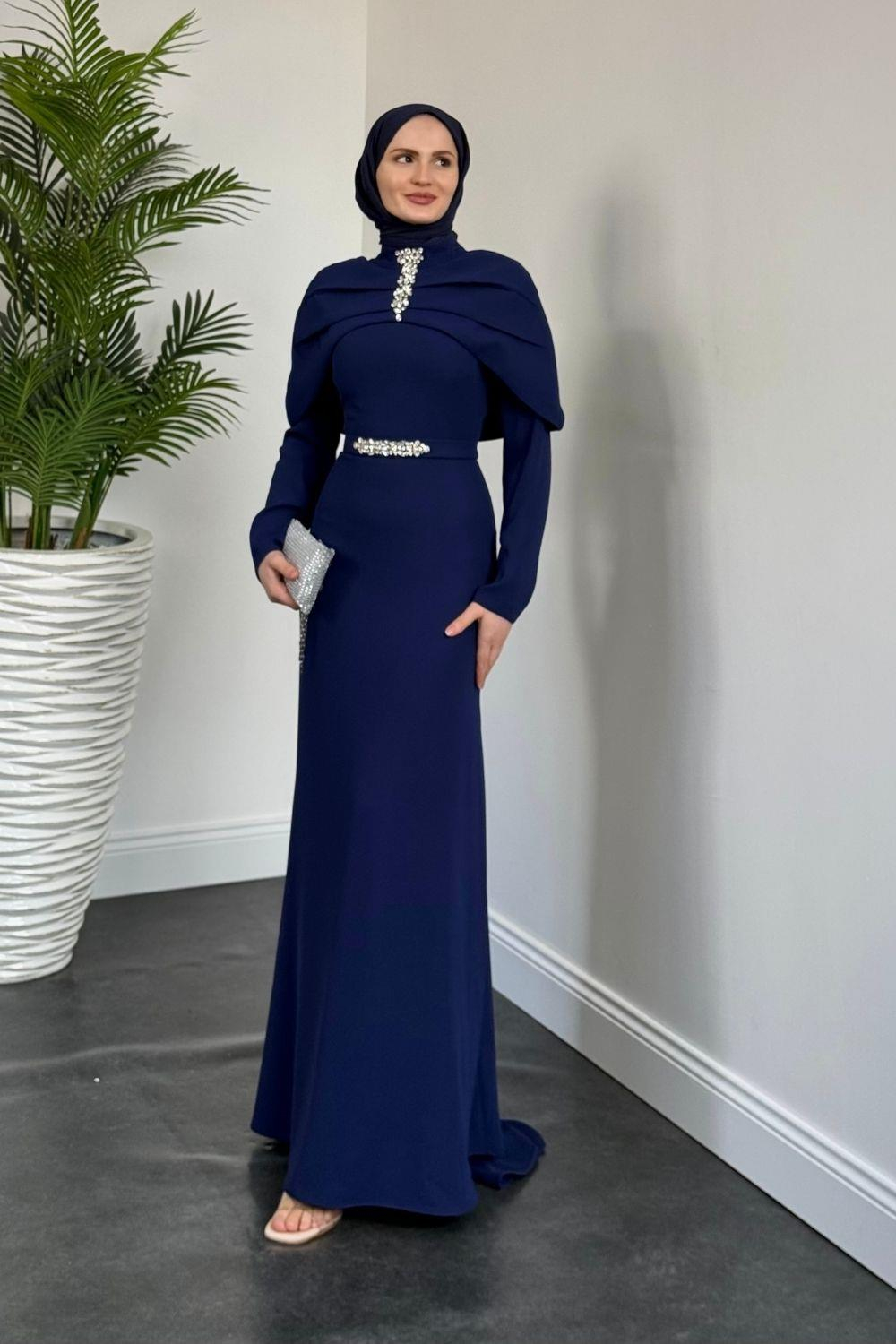 Mariam Pelerinli Kuyruklu Krep Abiye Lacivert