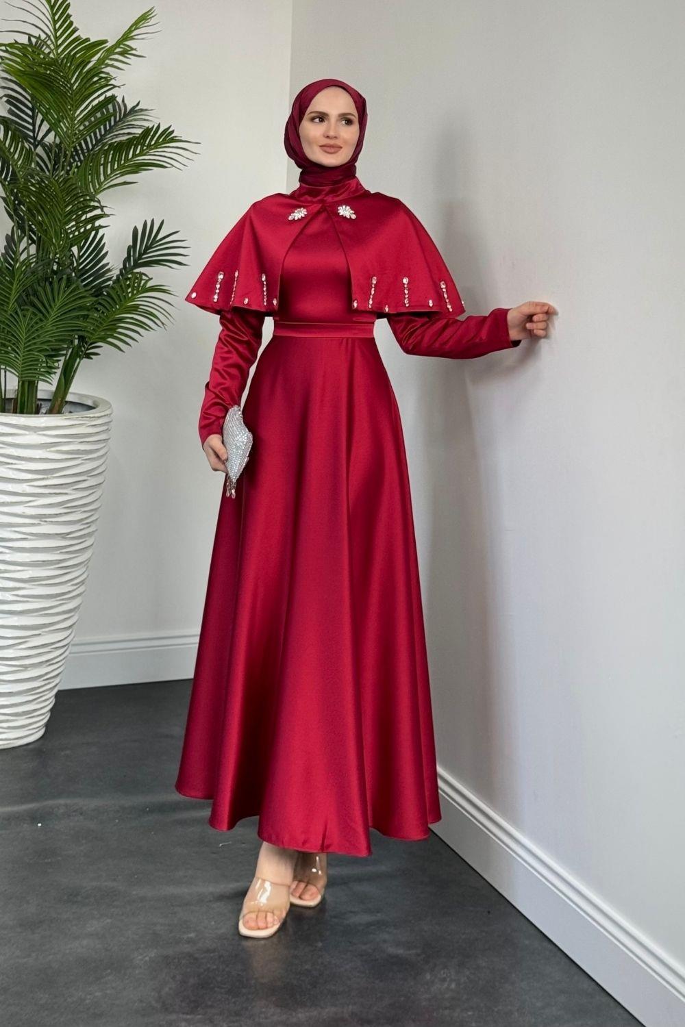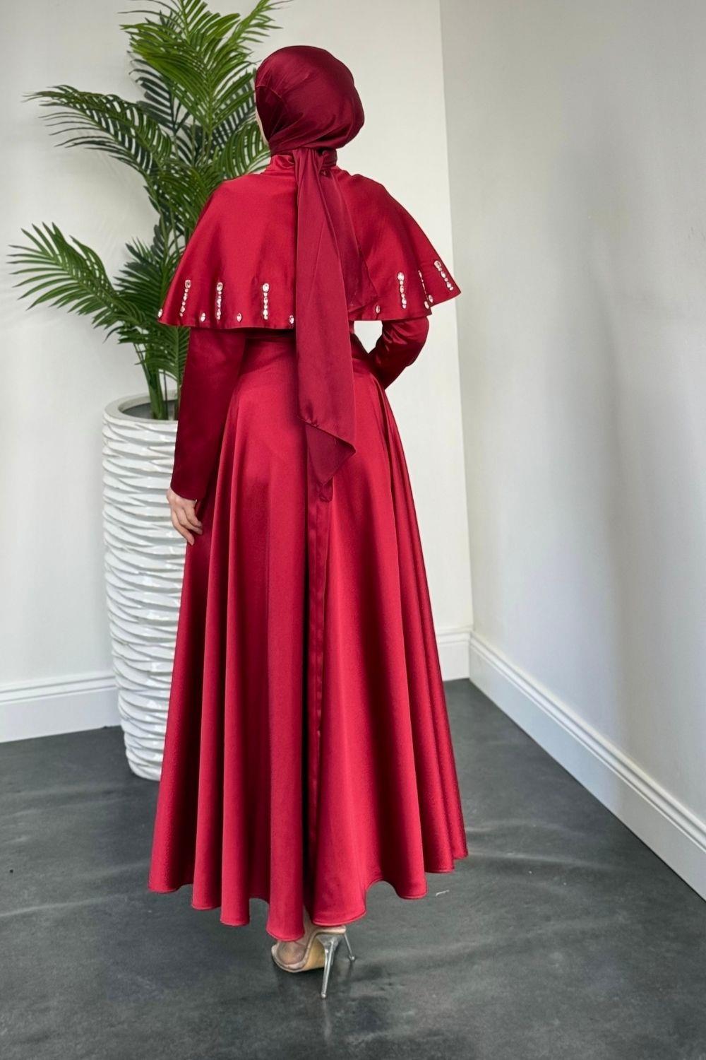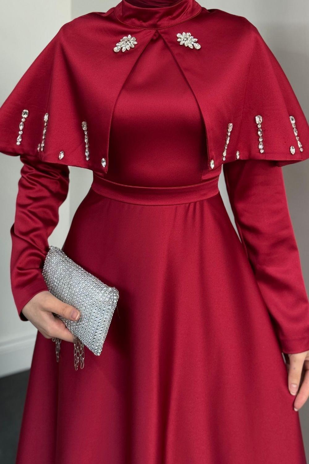 Giorgia Pelerinli Taşlı Saten Abiye Bordo