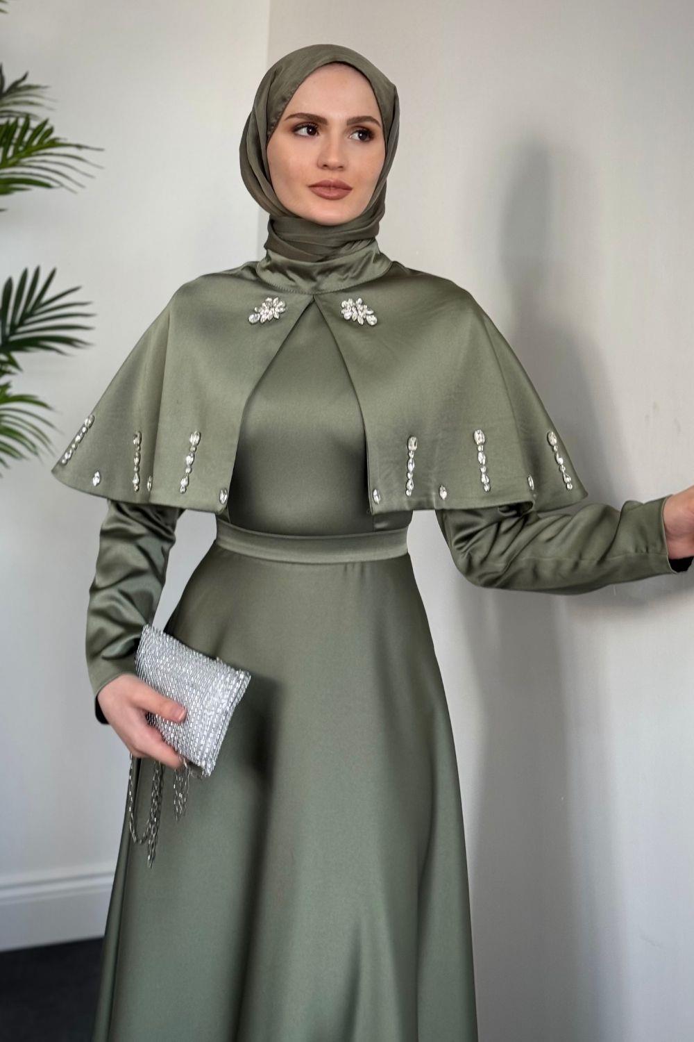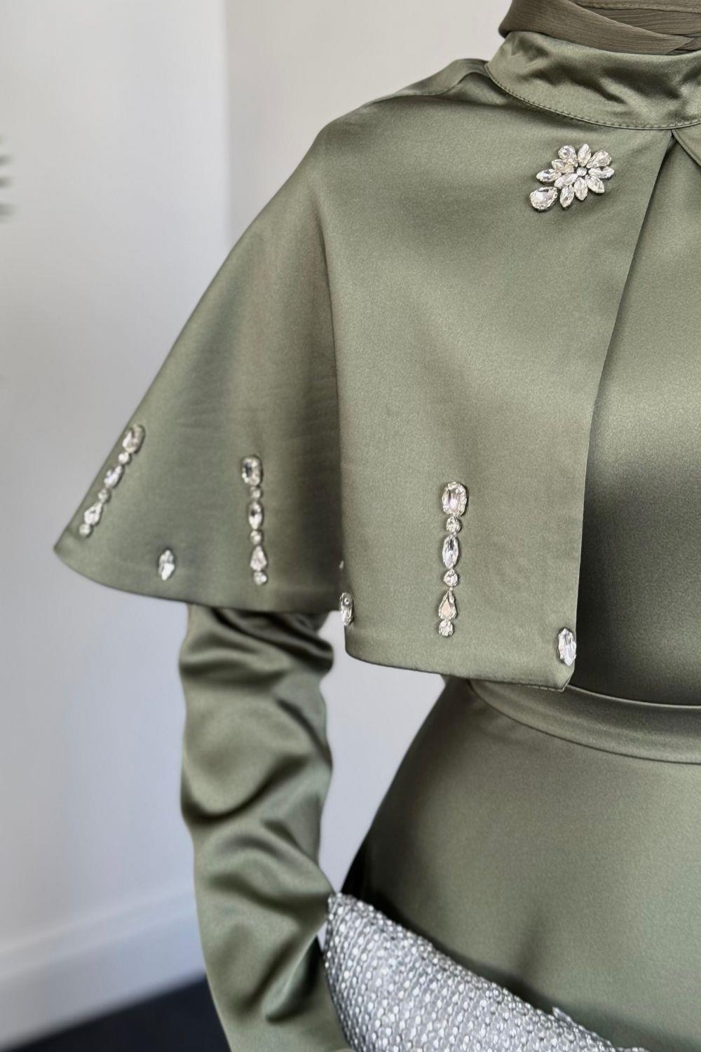 Giorgia Pelerinli Taşlı Saten Abiye Haki