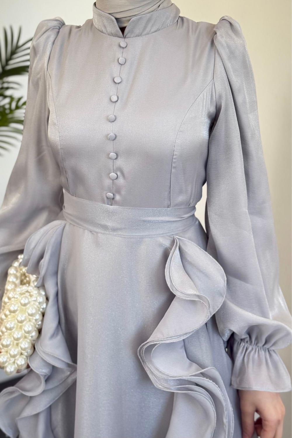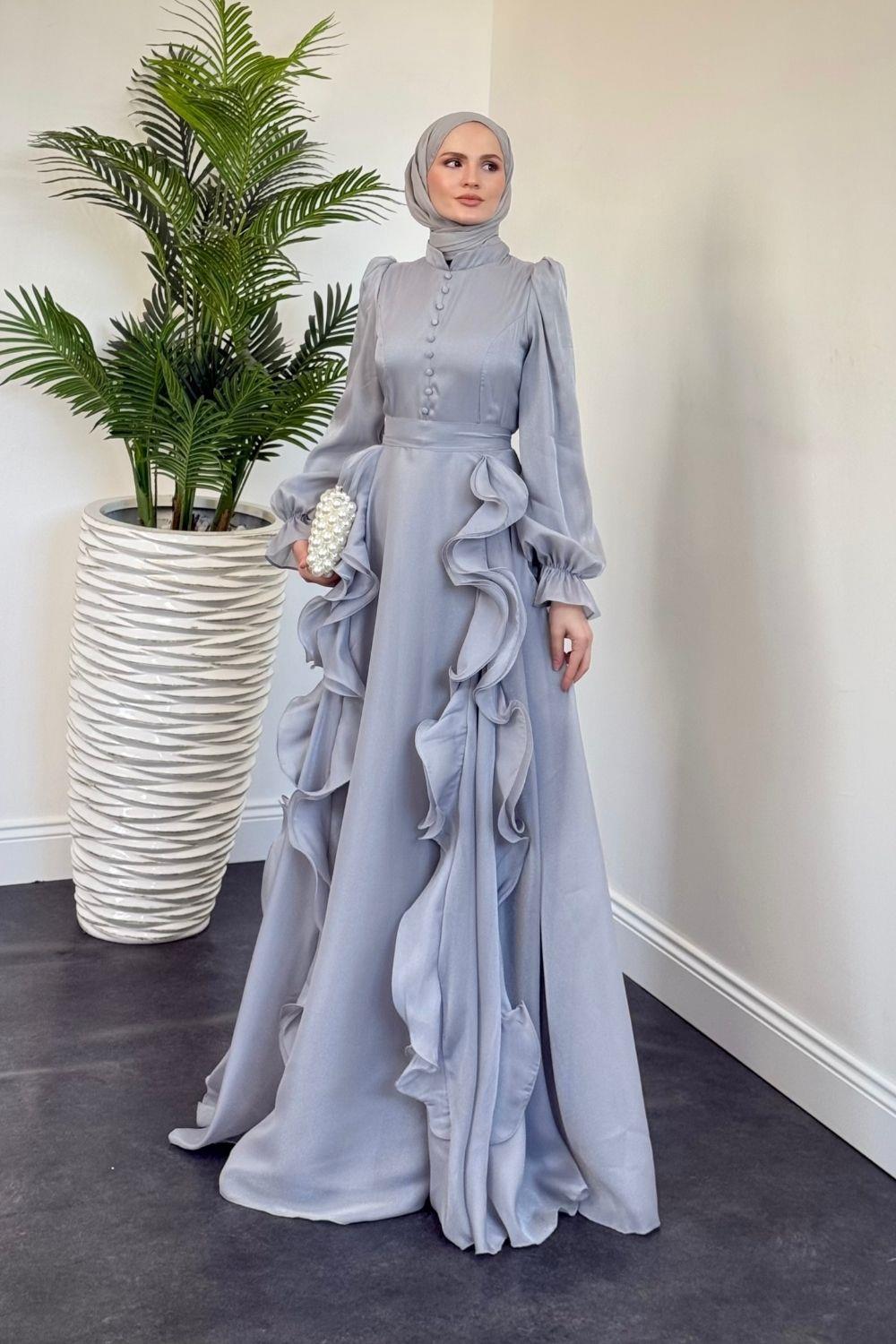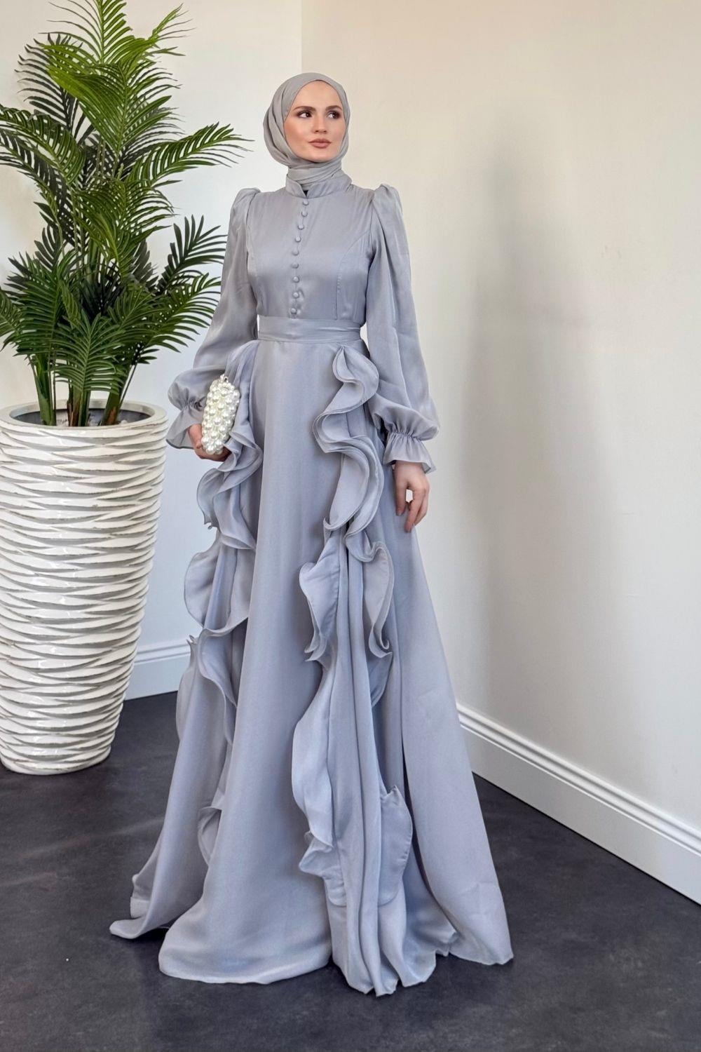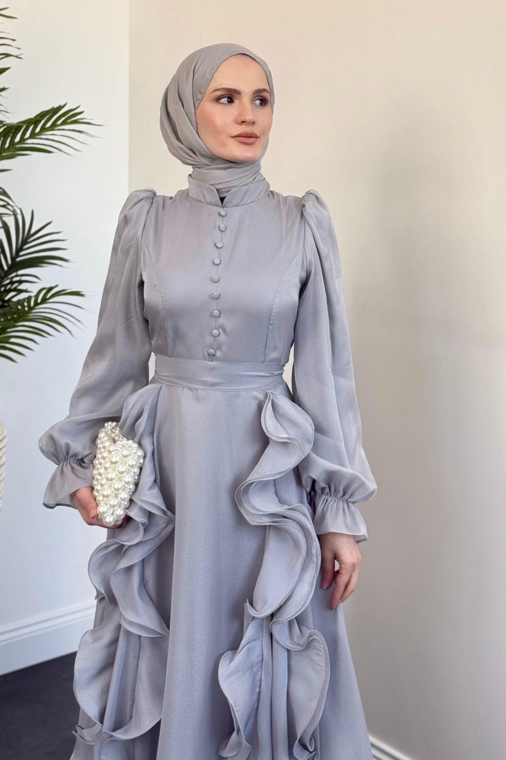 Samira Fırfırlı Janjan Abiye Gri