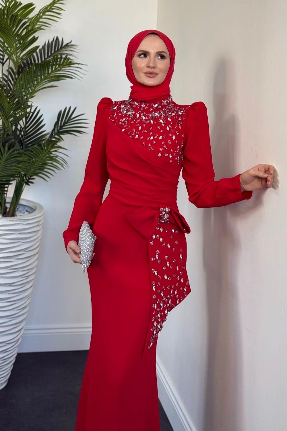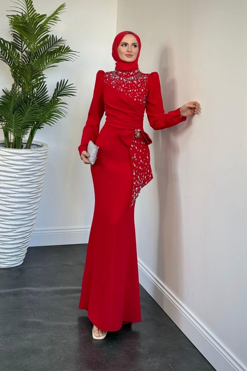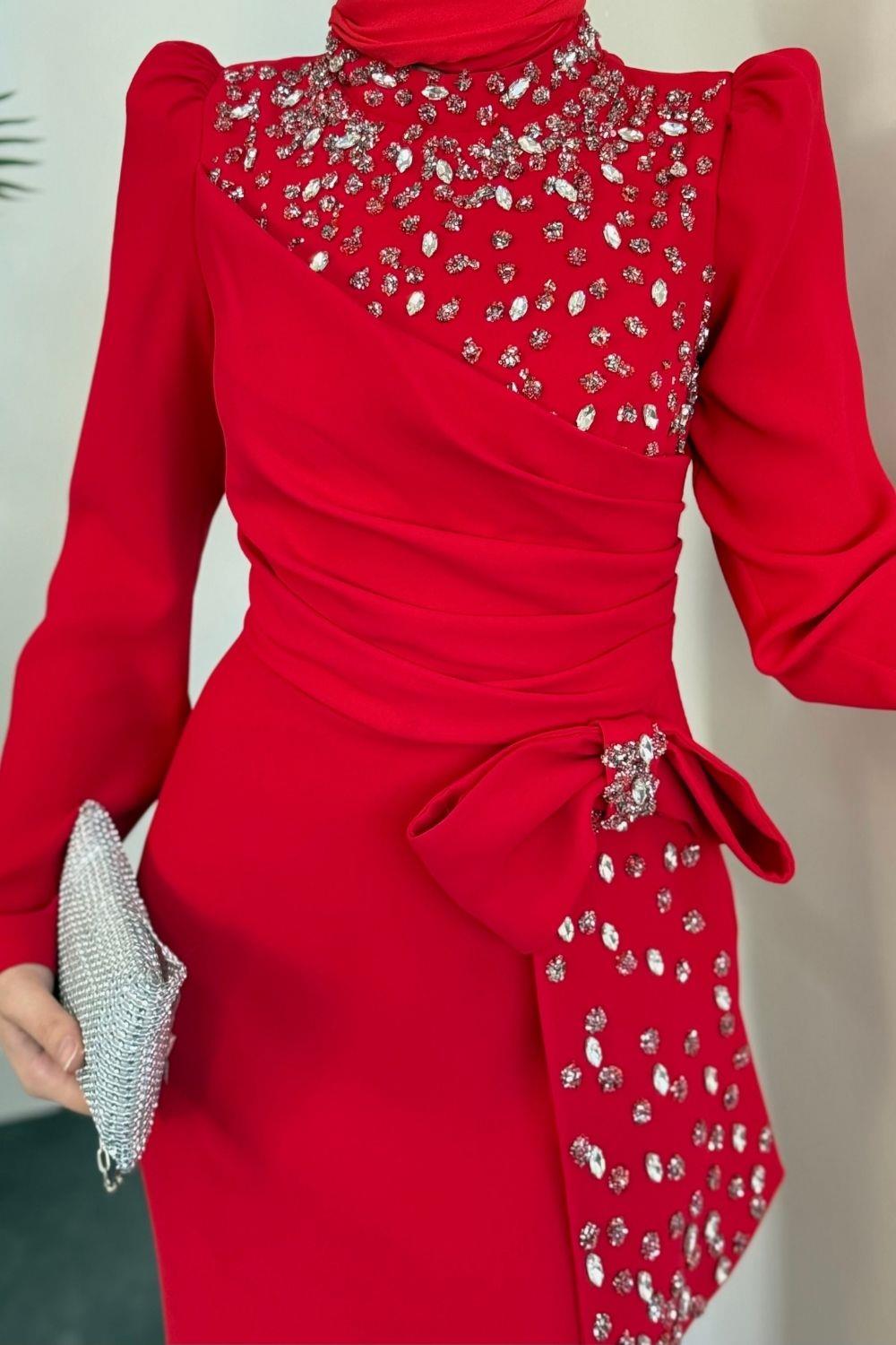 Lalissa Yandan Fiyonklu Taşlı Krep Abiye Kırmızı