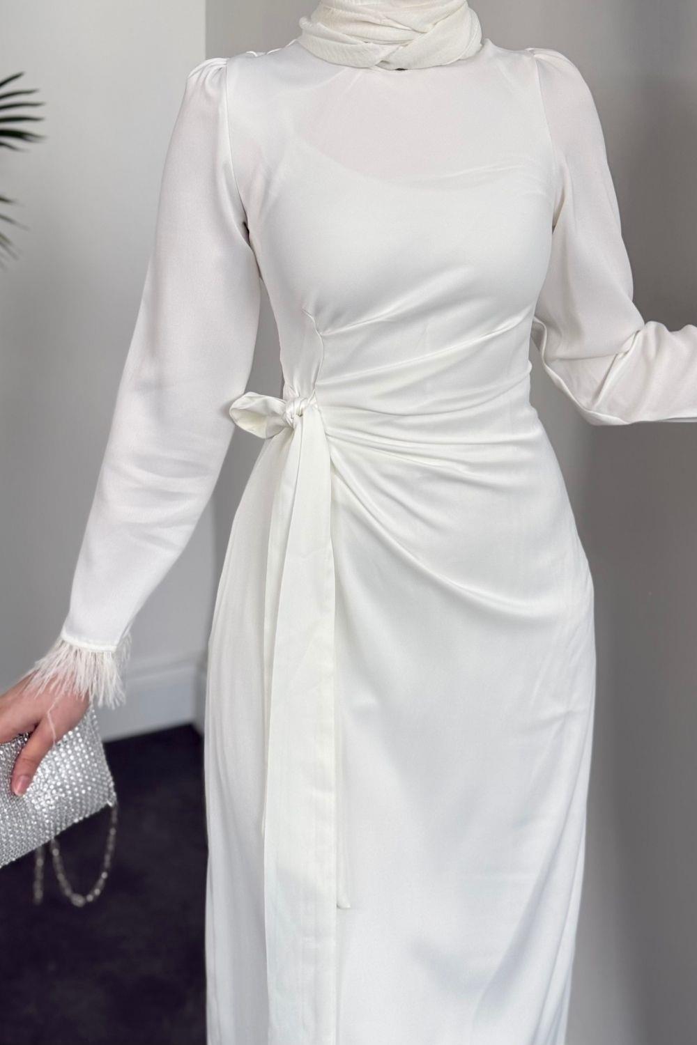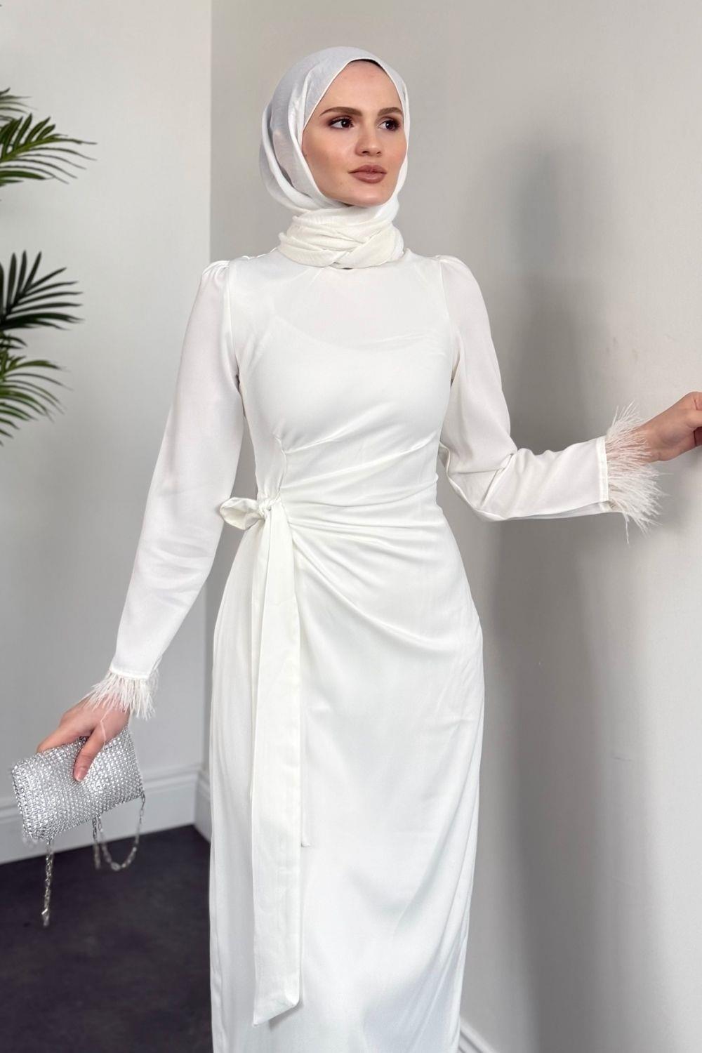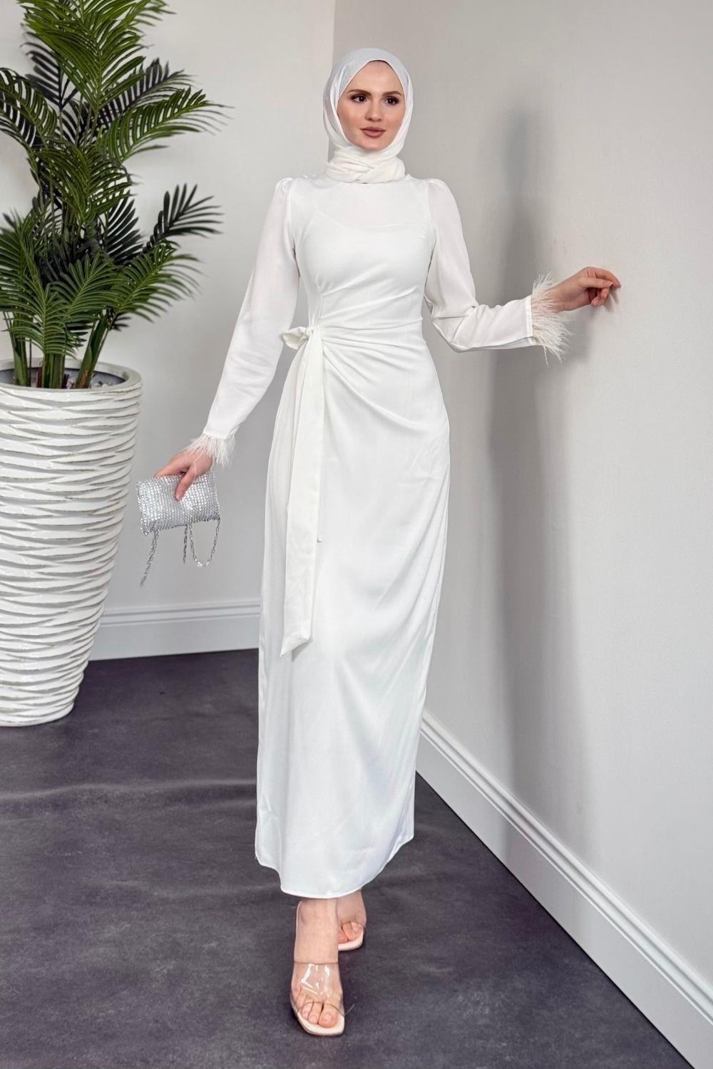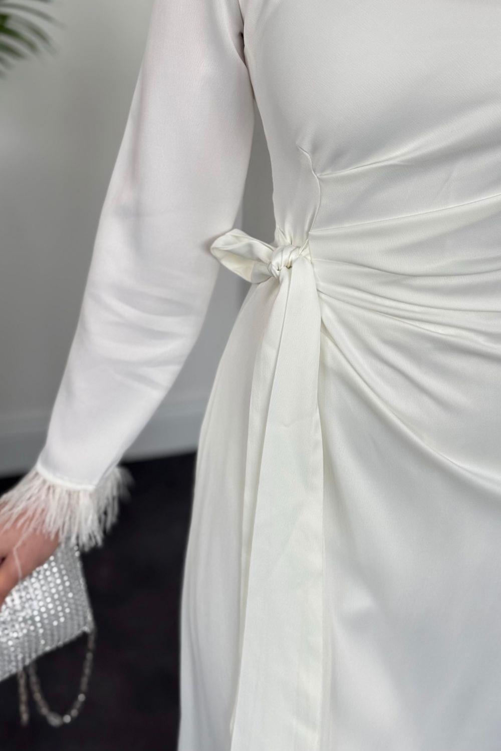 Diela Kolları Tüy Detay Abiye Beyaz