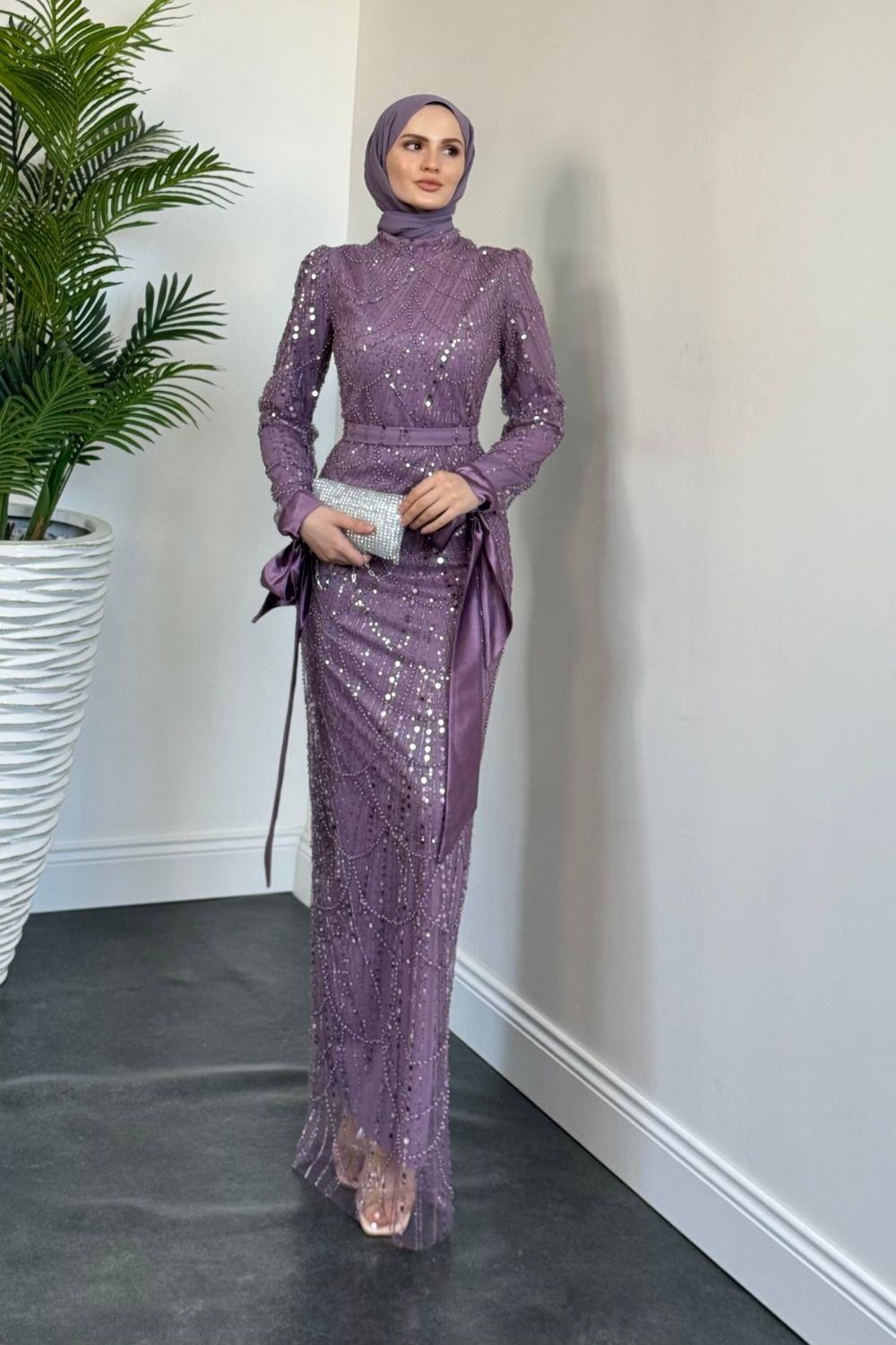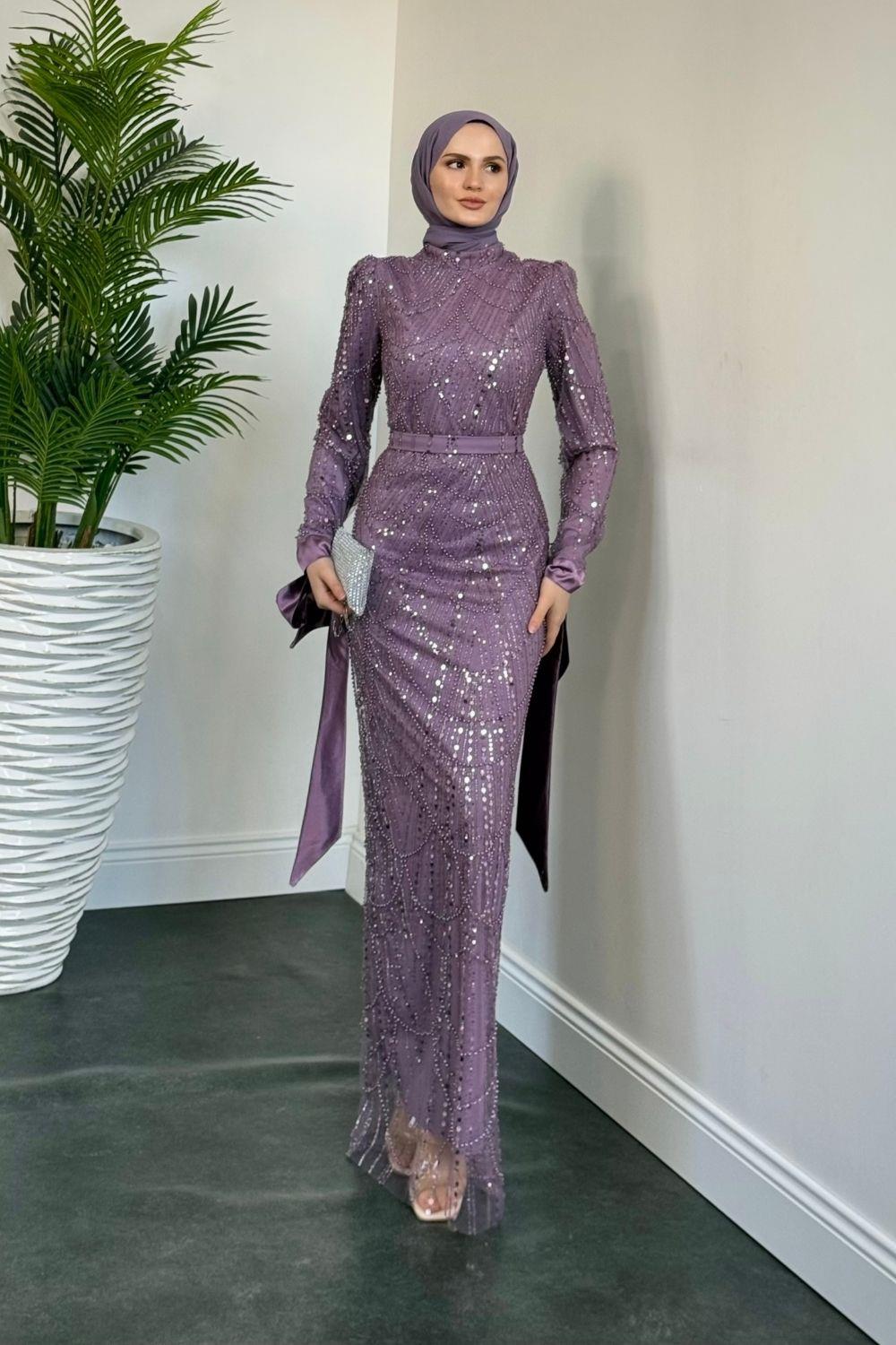 Sheldon Kolları Bağcıklı Pul Payet İşleme Abiye Lila