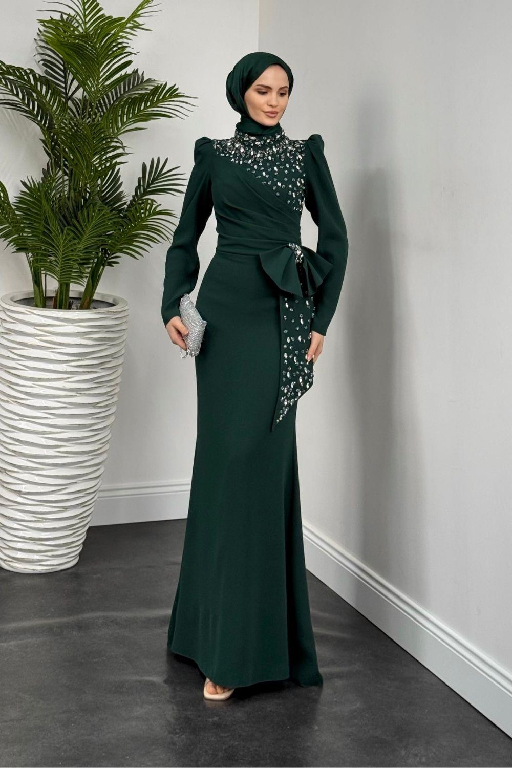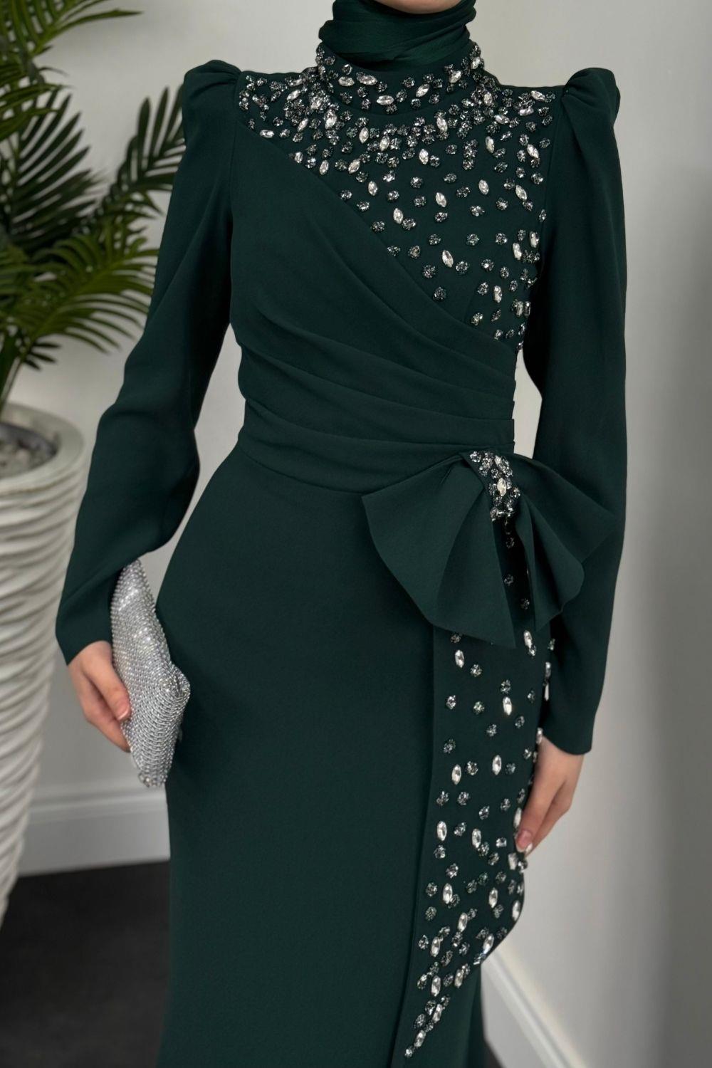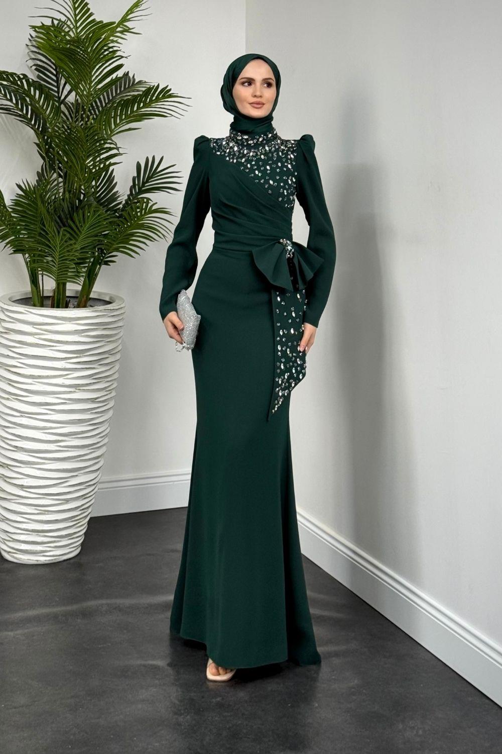 Lalissa Yandan Fiyonklu Taşlı Krep Abiye Zümrüt