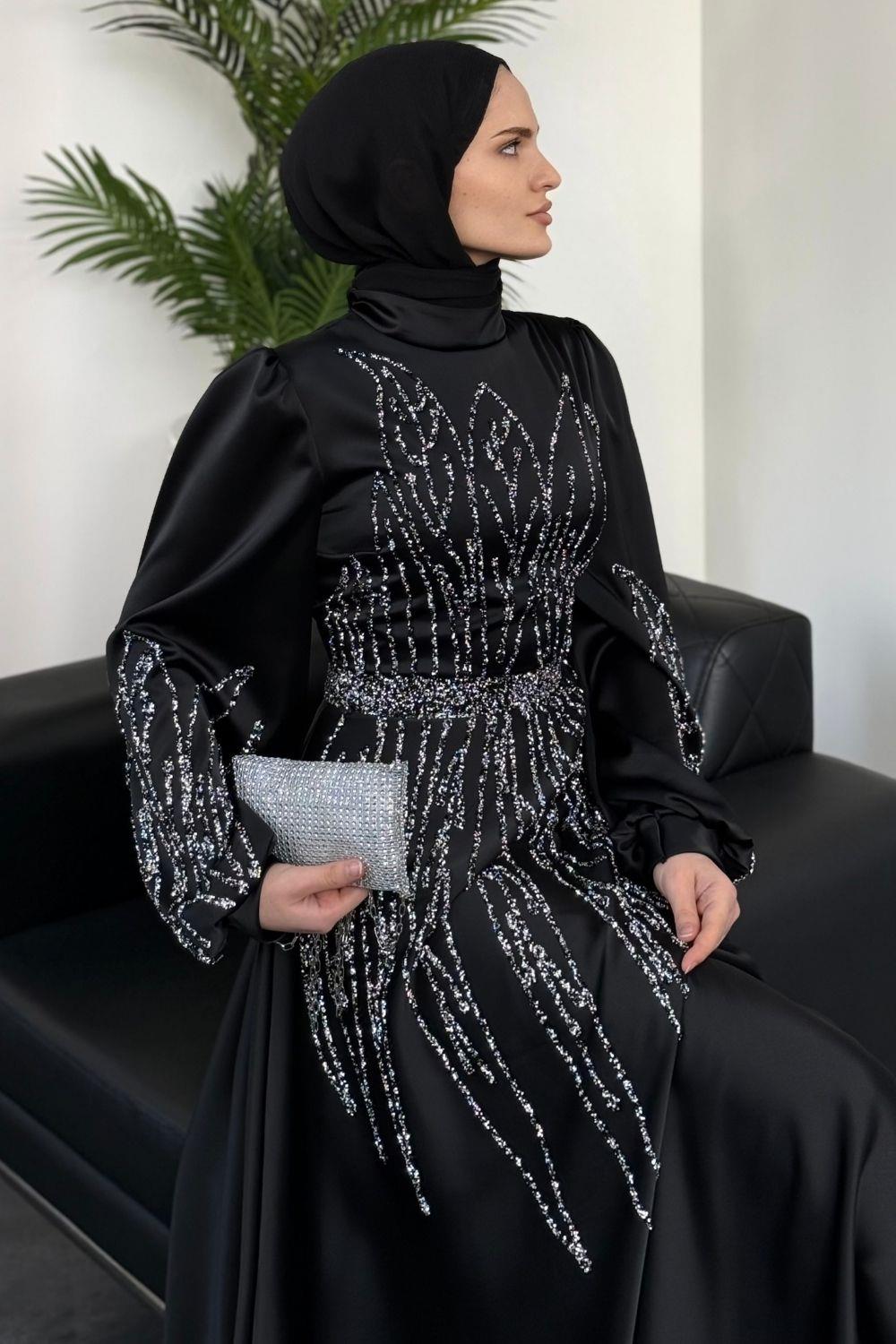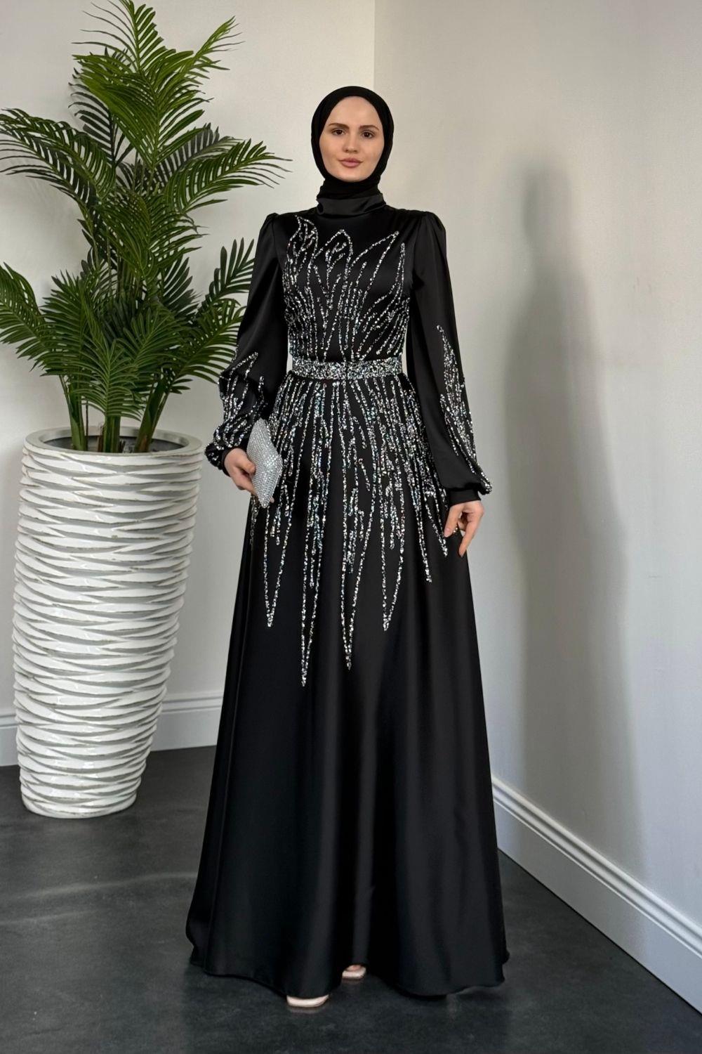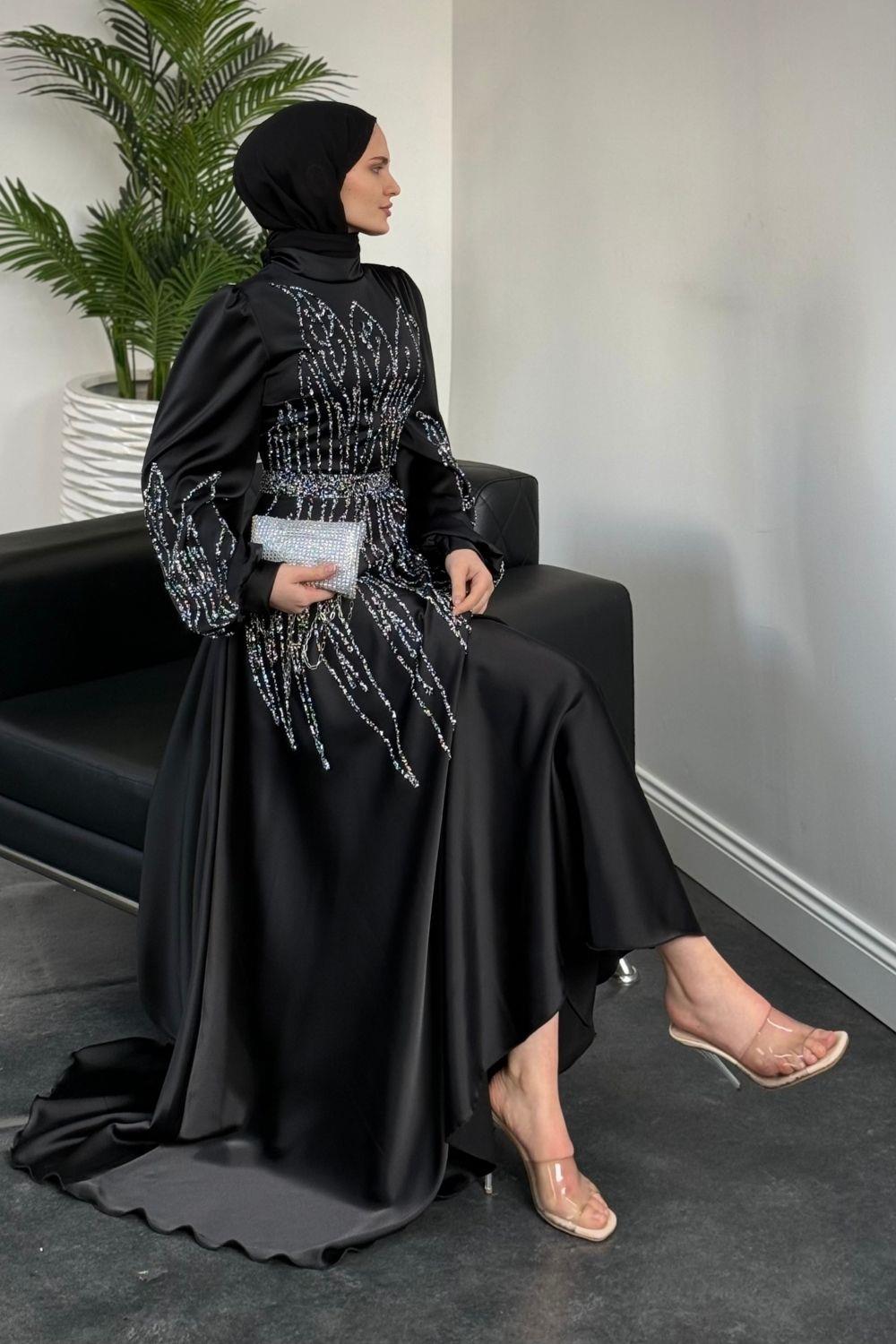 Şahsanem Önü Taşlı Saten Abiye Siyah