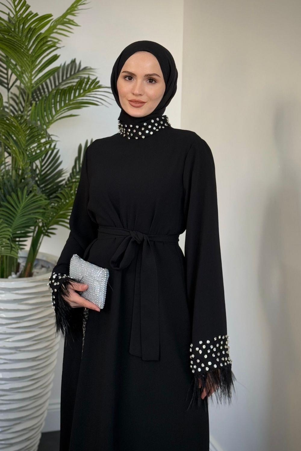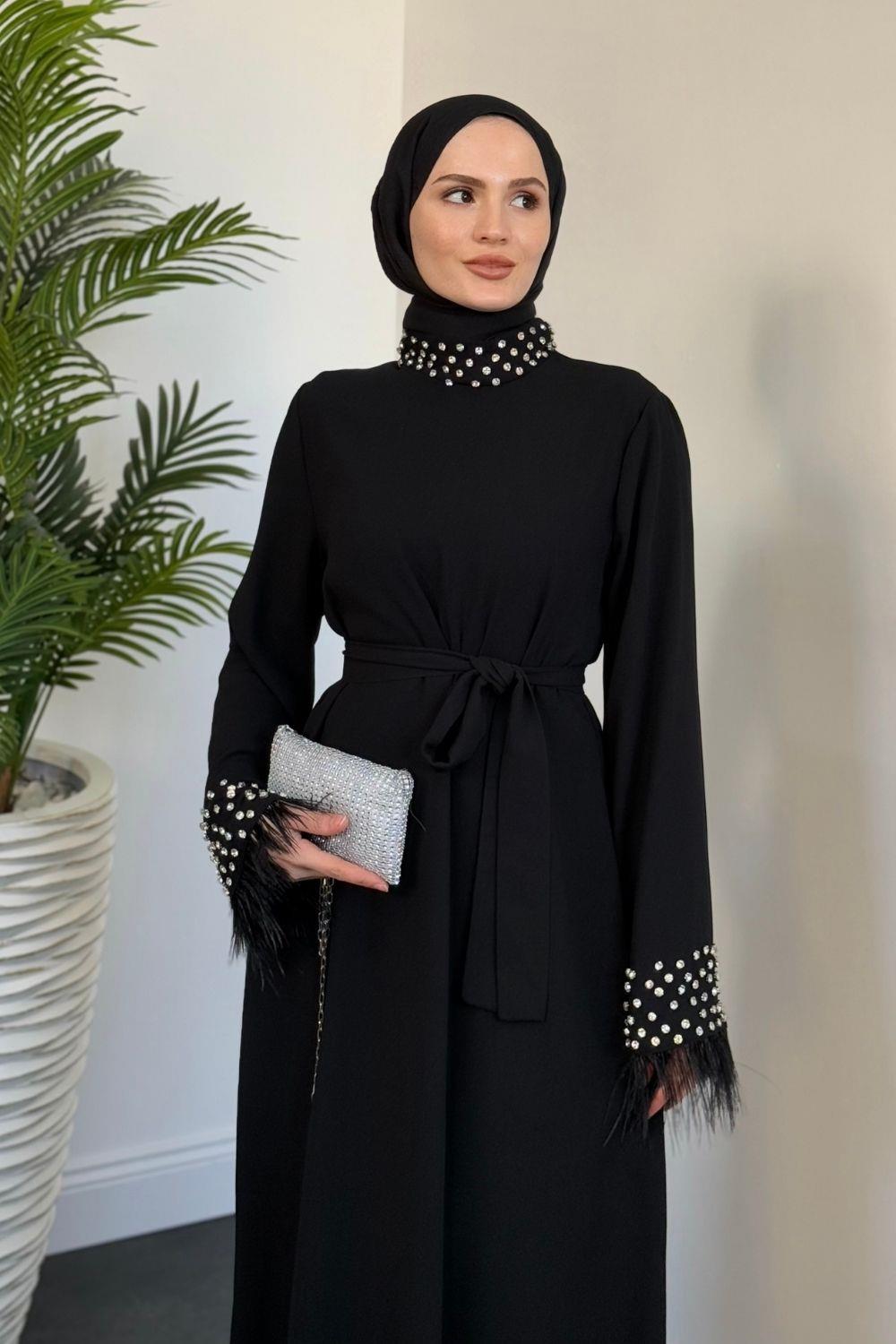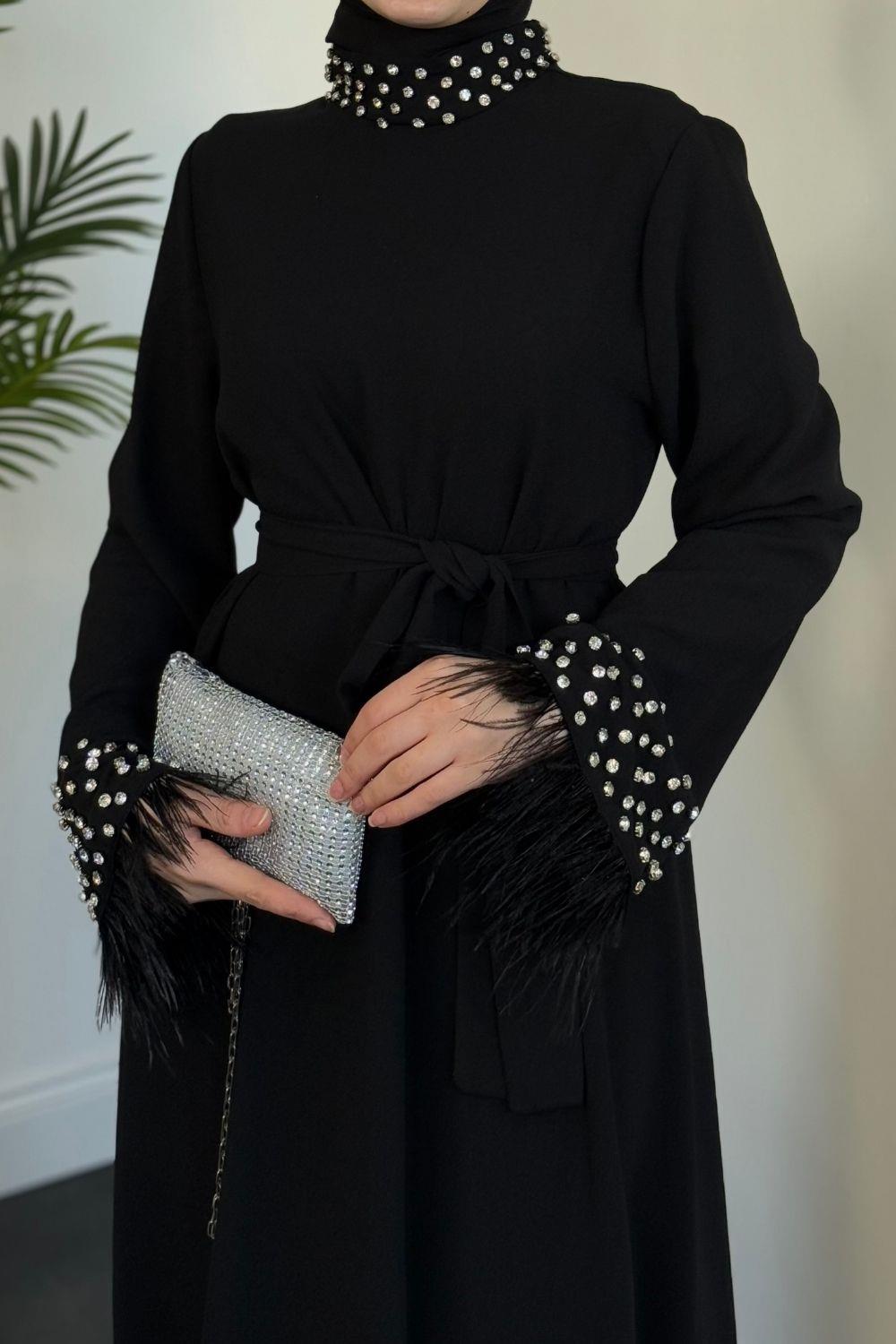 Mimoza Kolları Taşlı Krep Abiye Siyah