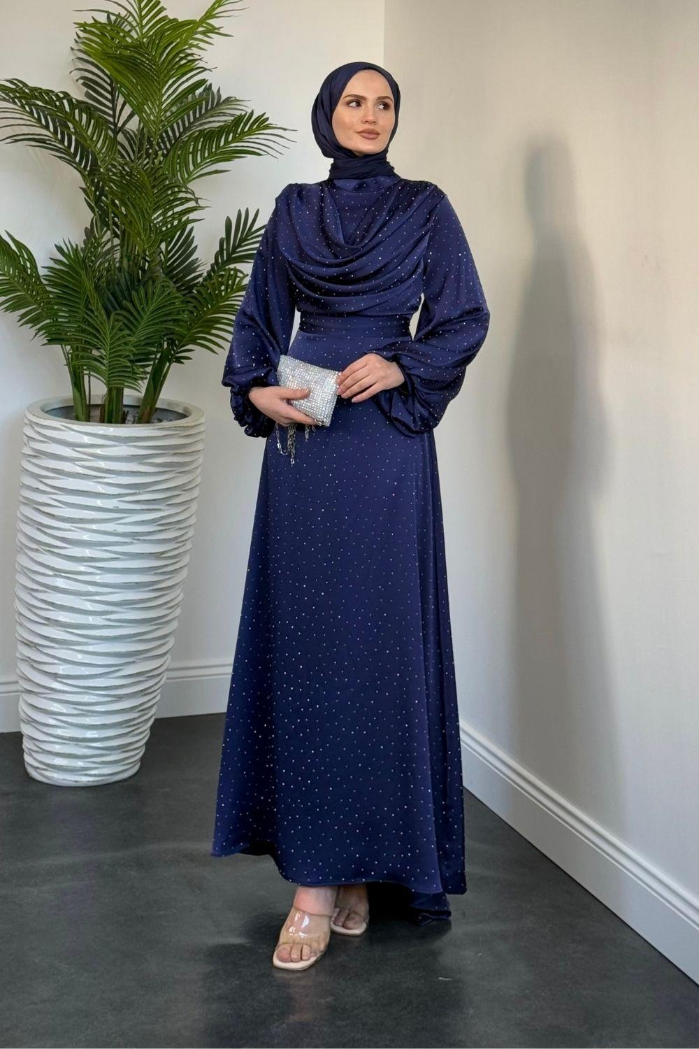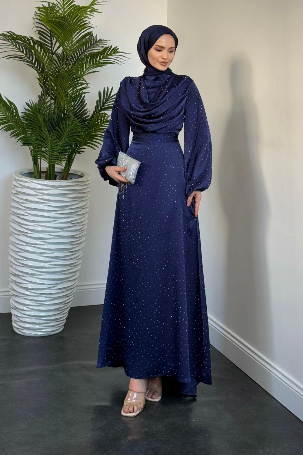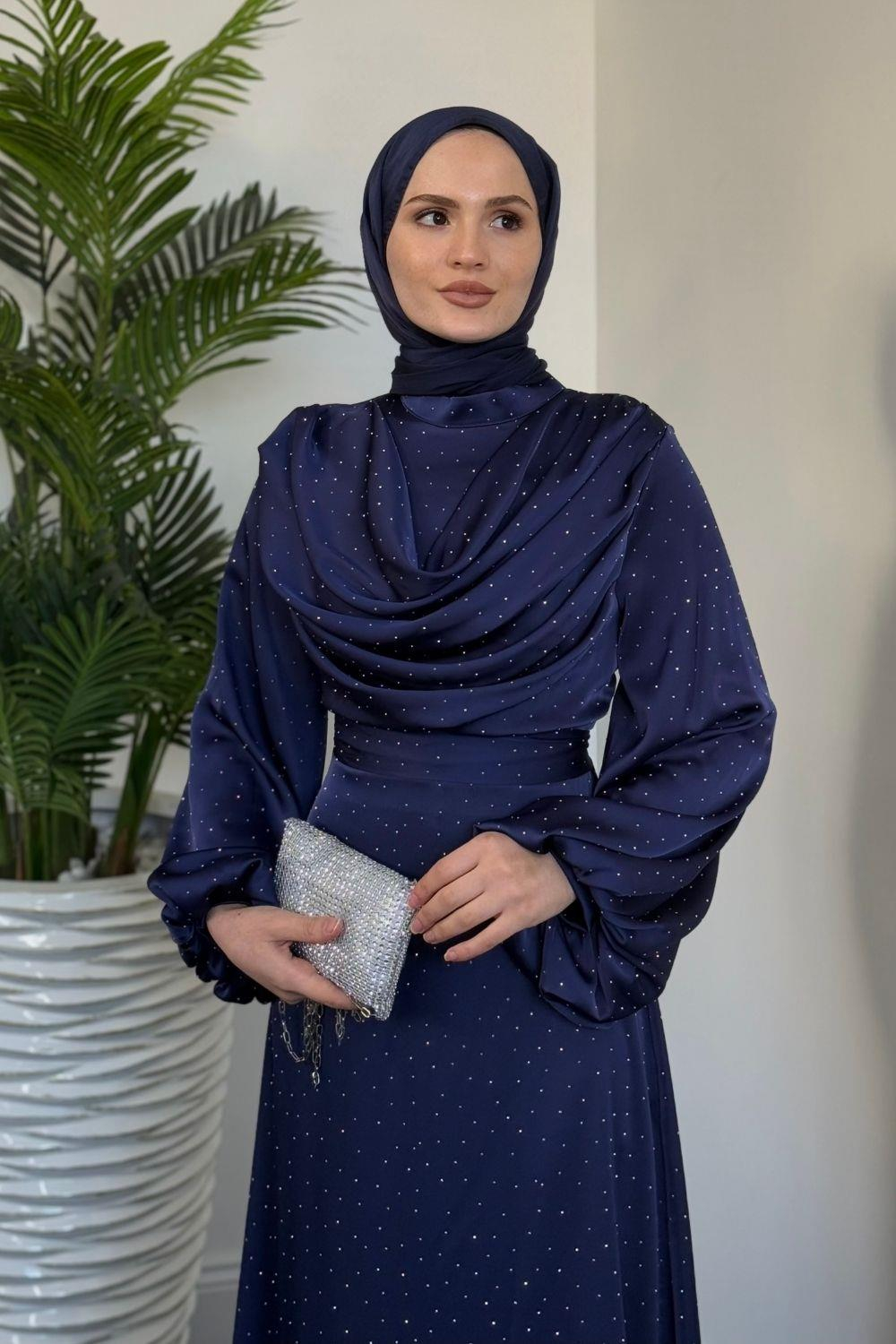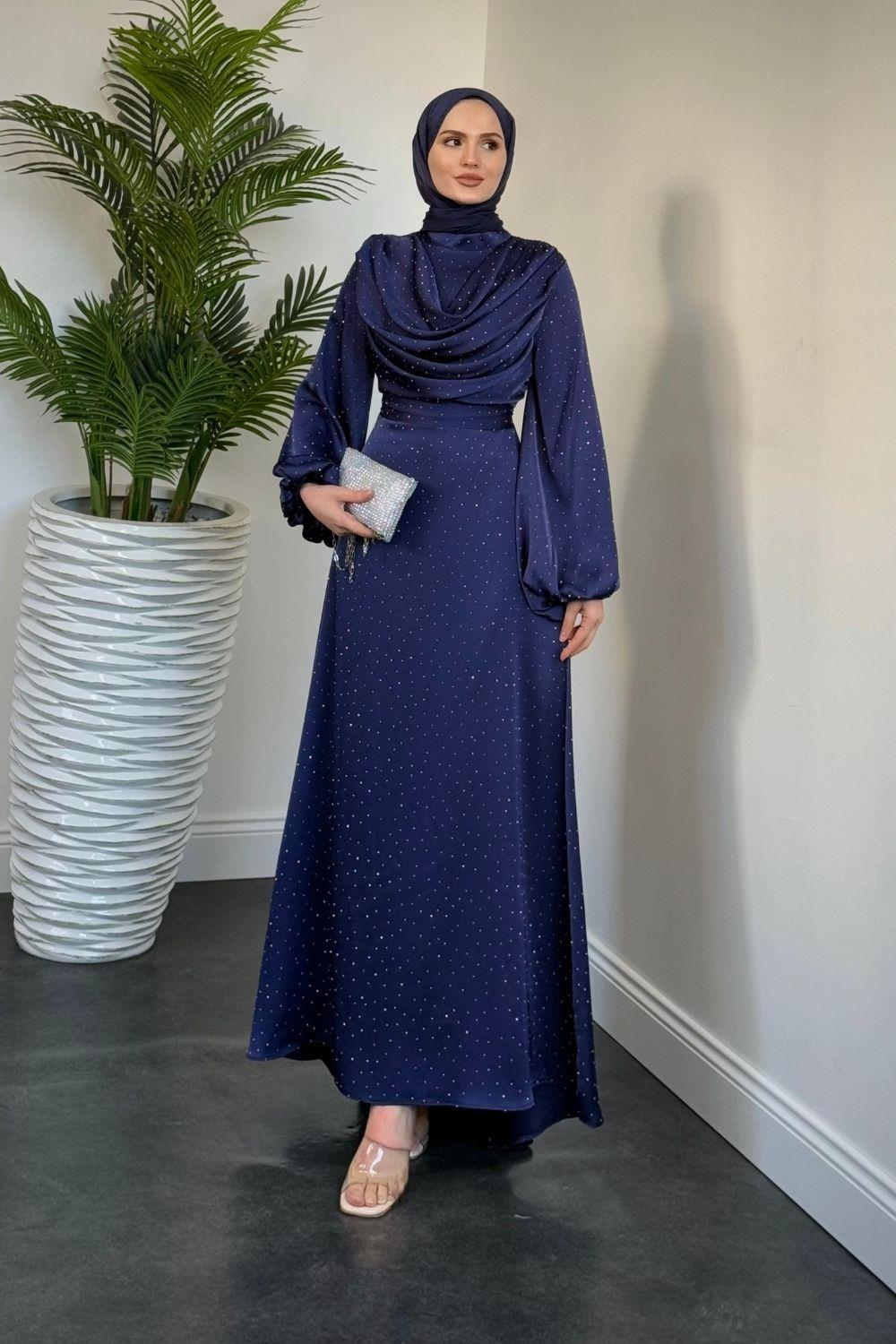 Areka Taşlı Kuyruklu Degaje Yaka Abiye Lacivert