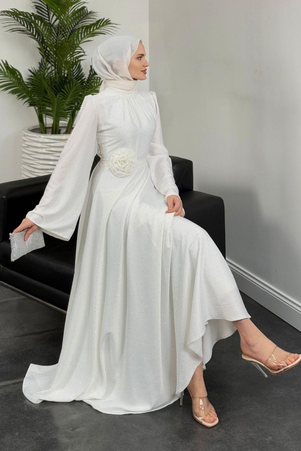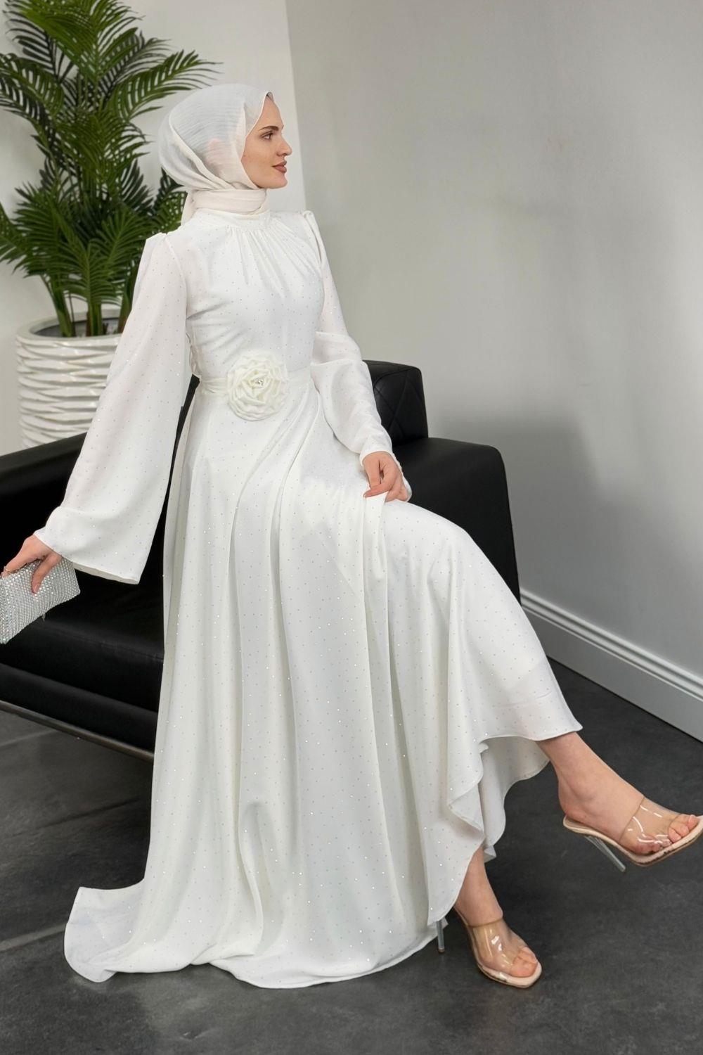 Branca Taşlı Gül Tokalı Abiye Beyaz